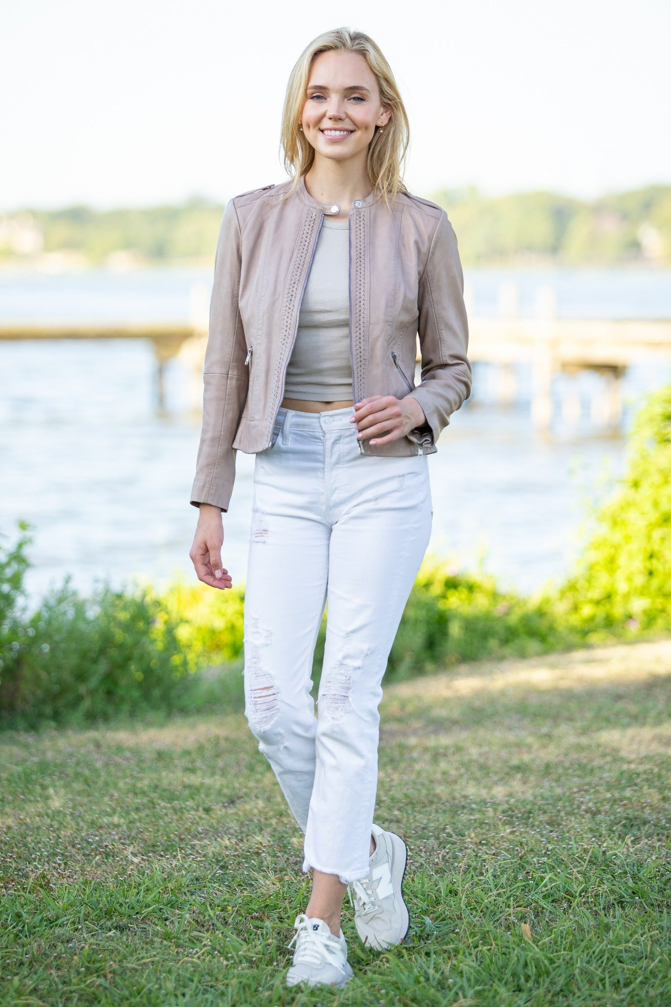 White - Collarless Jean Jacket with Frayed Detail