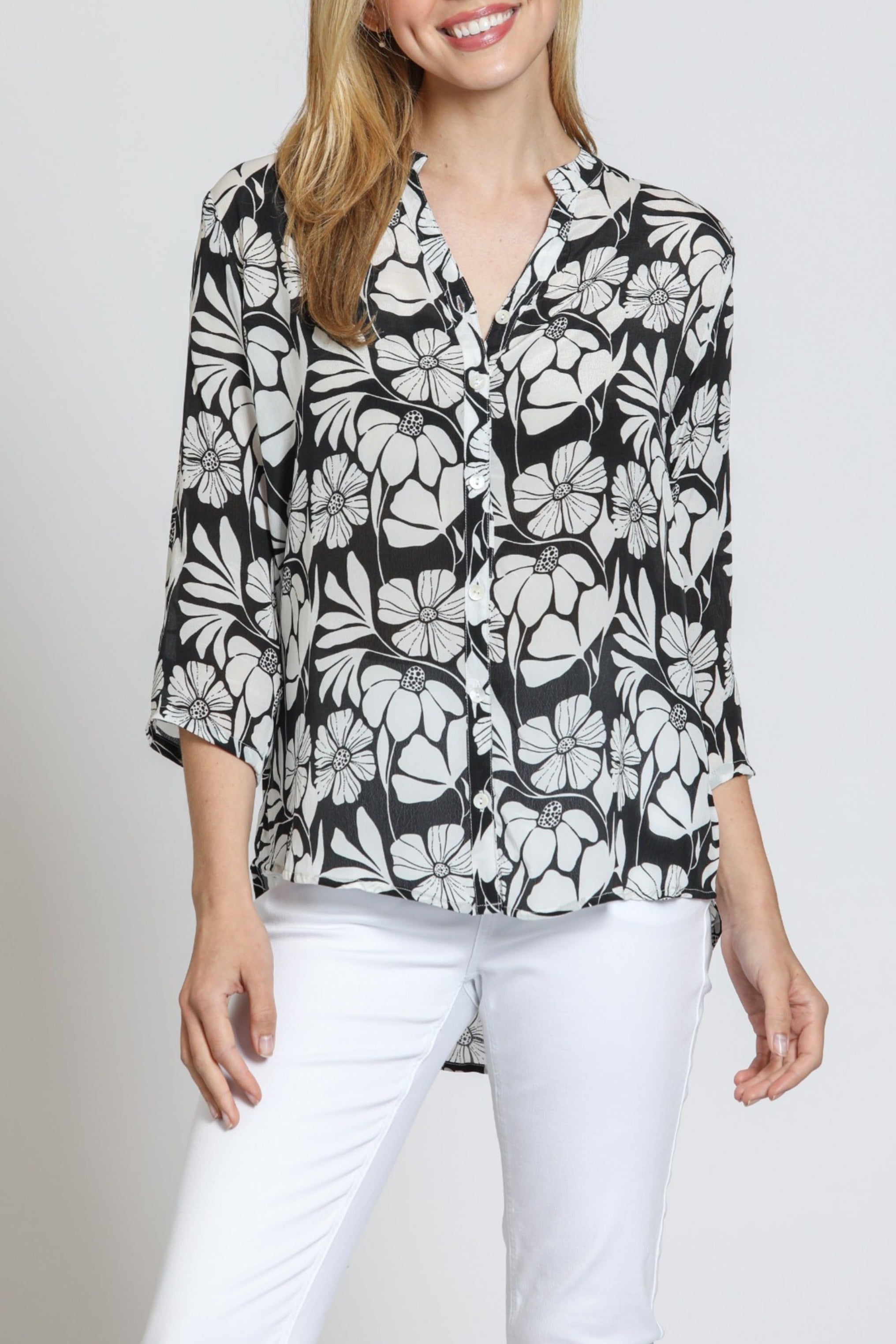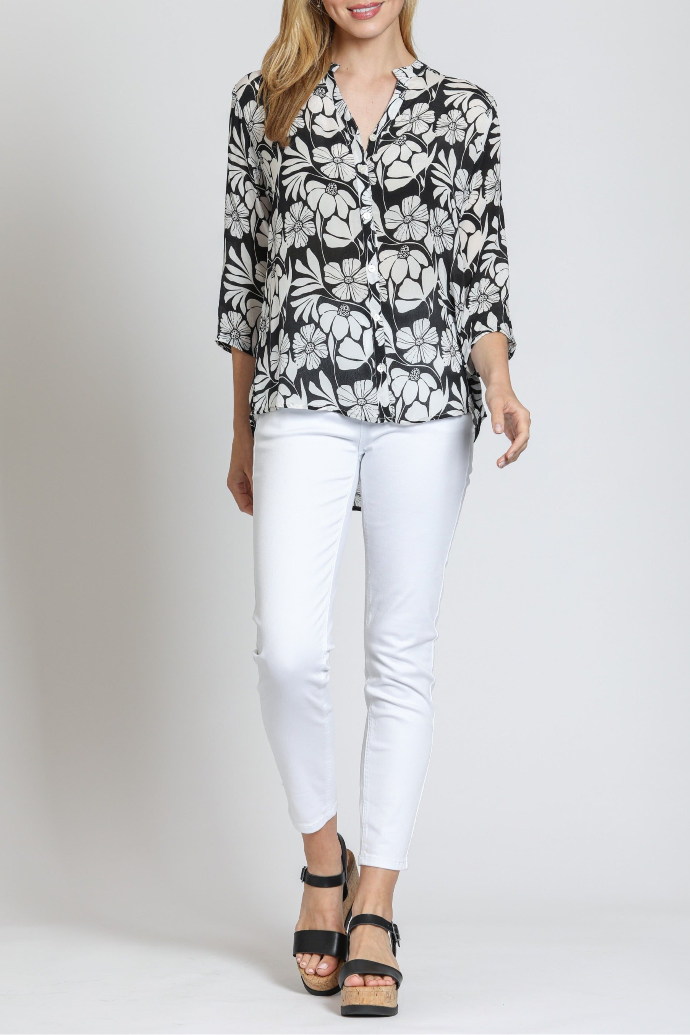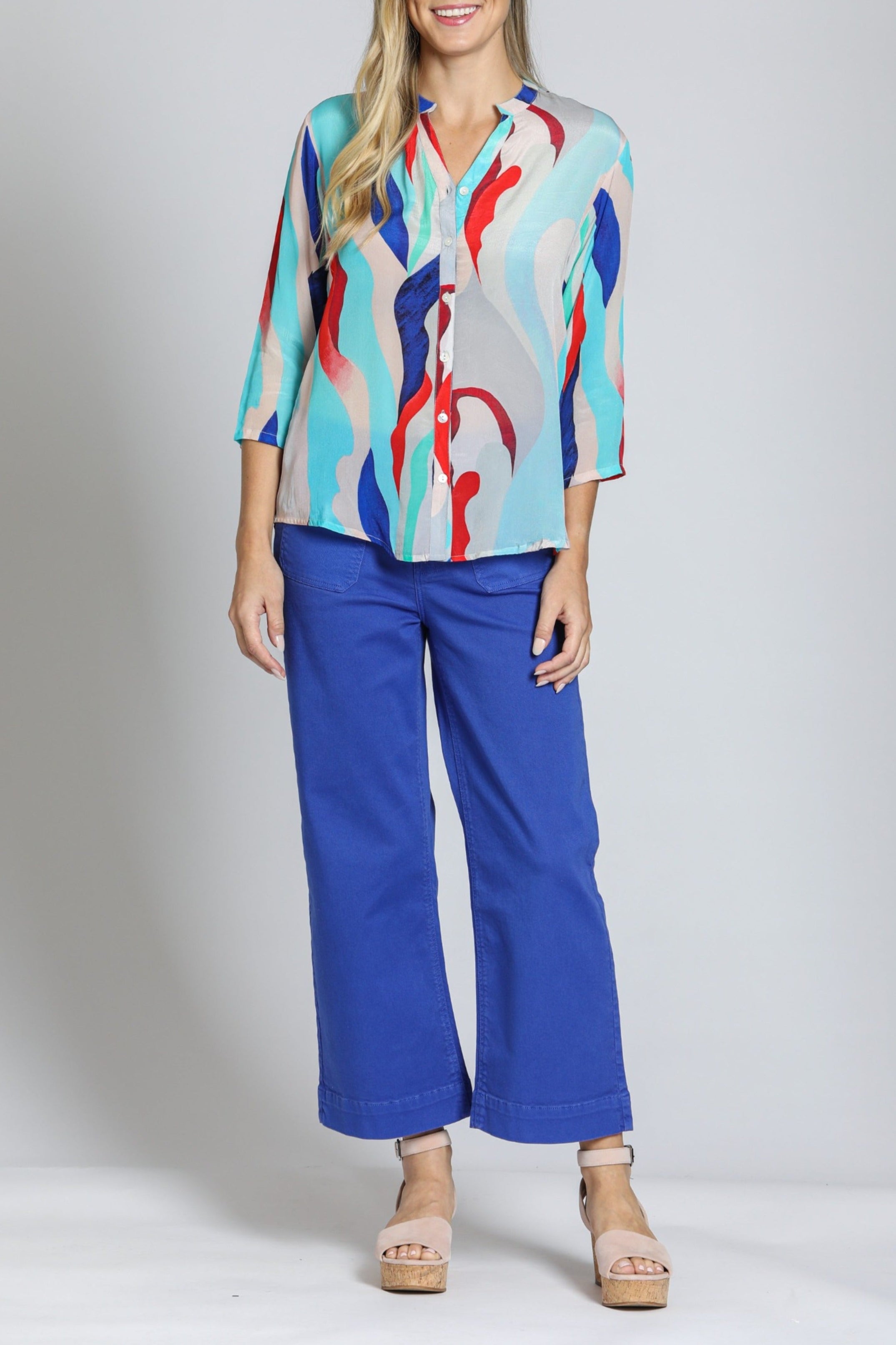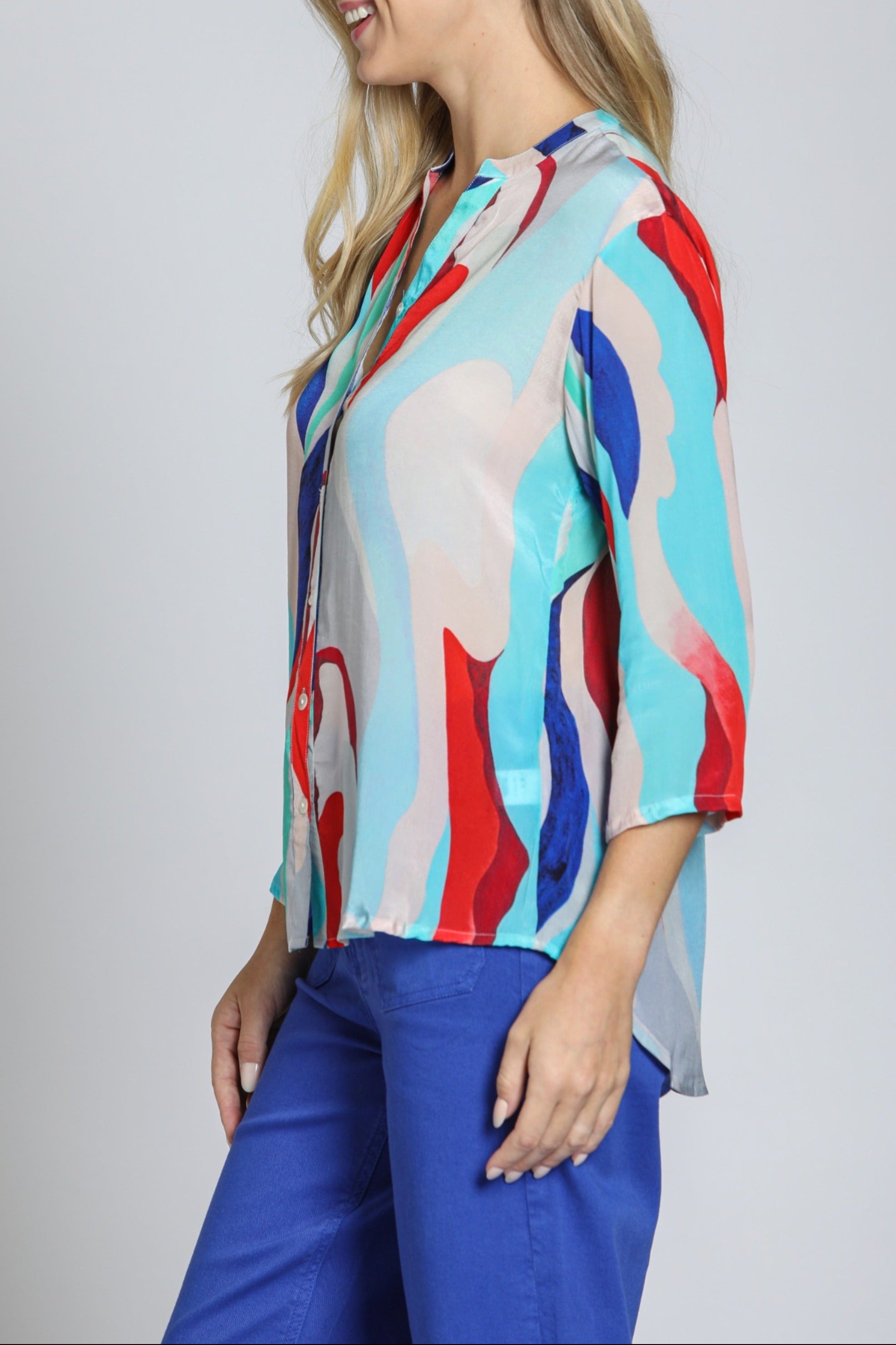 3/4 Sleeve Mandarin Collar Button-up