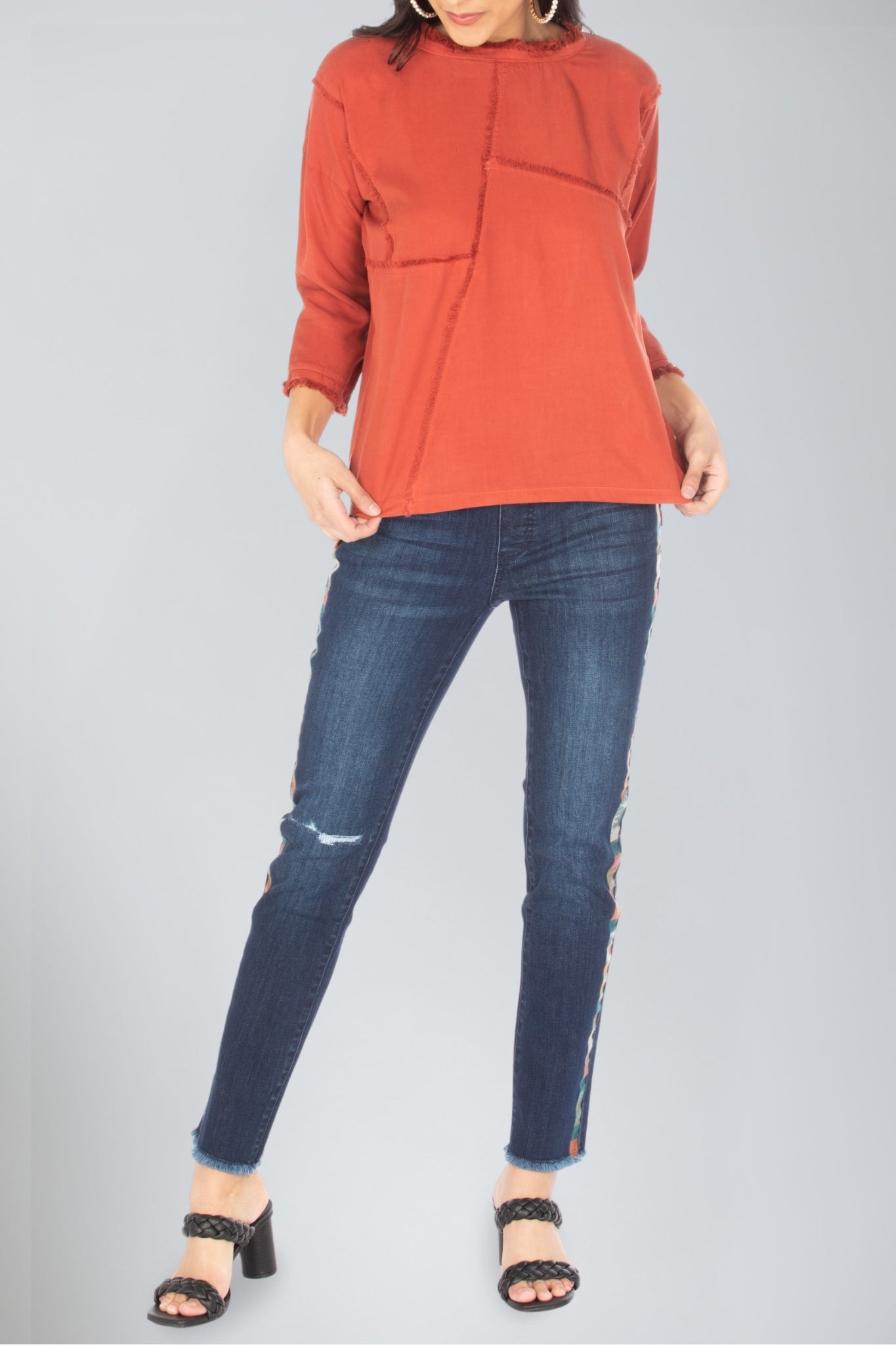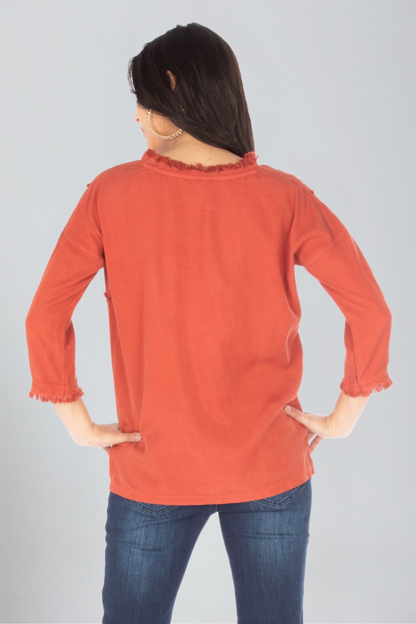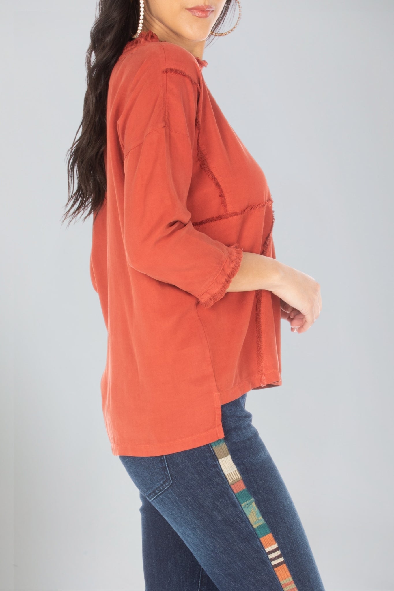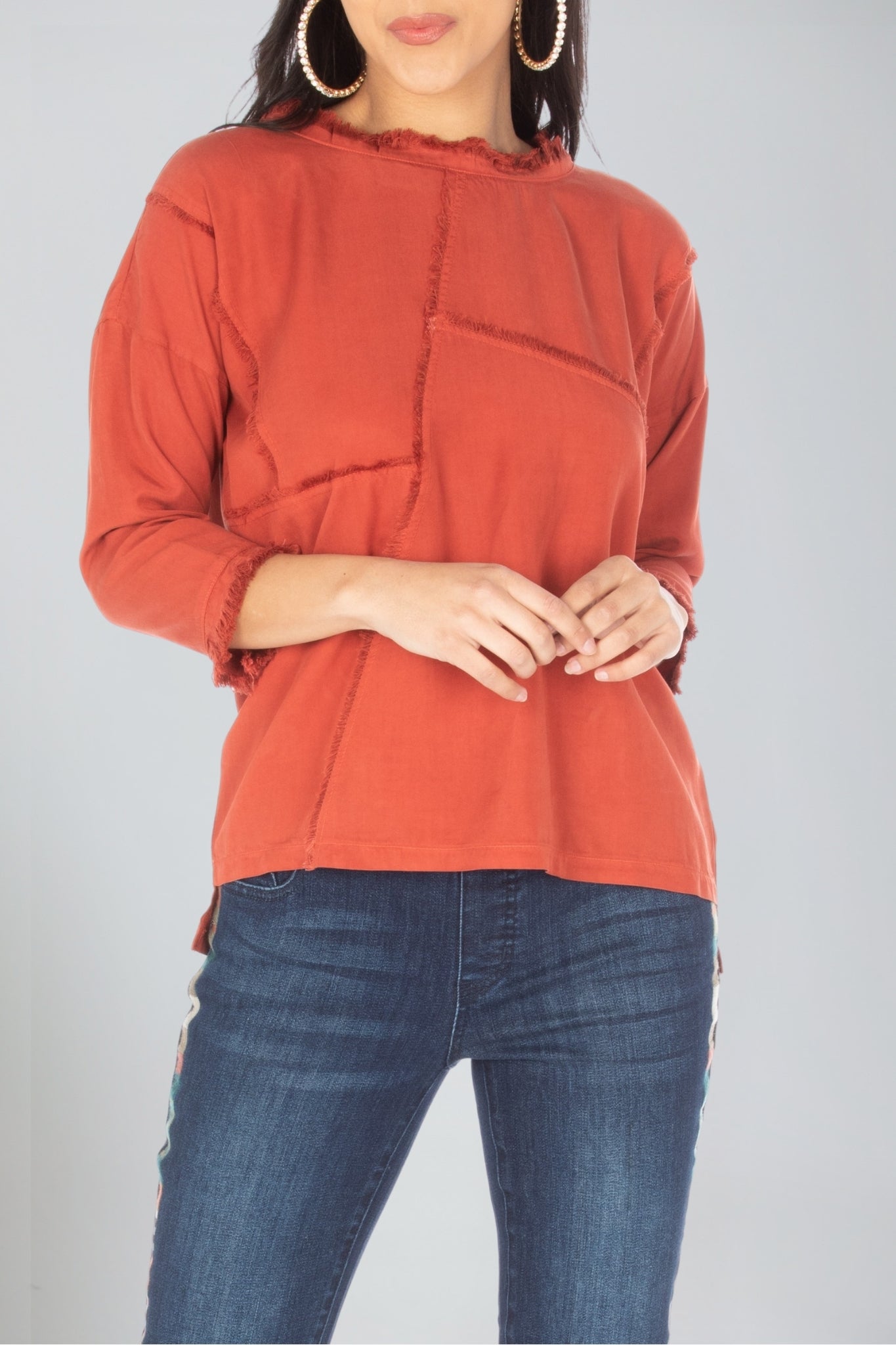 3/4 sleeve patched tee, featuring frayed seams for a unique touch. Crafted with 100% Tencel for breathable wear, this stylish top will complete any casual outfit.
