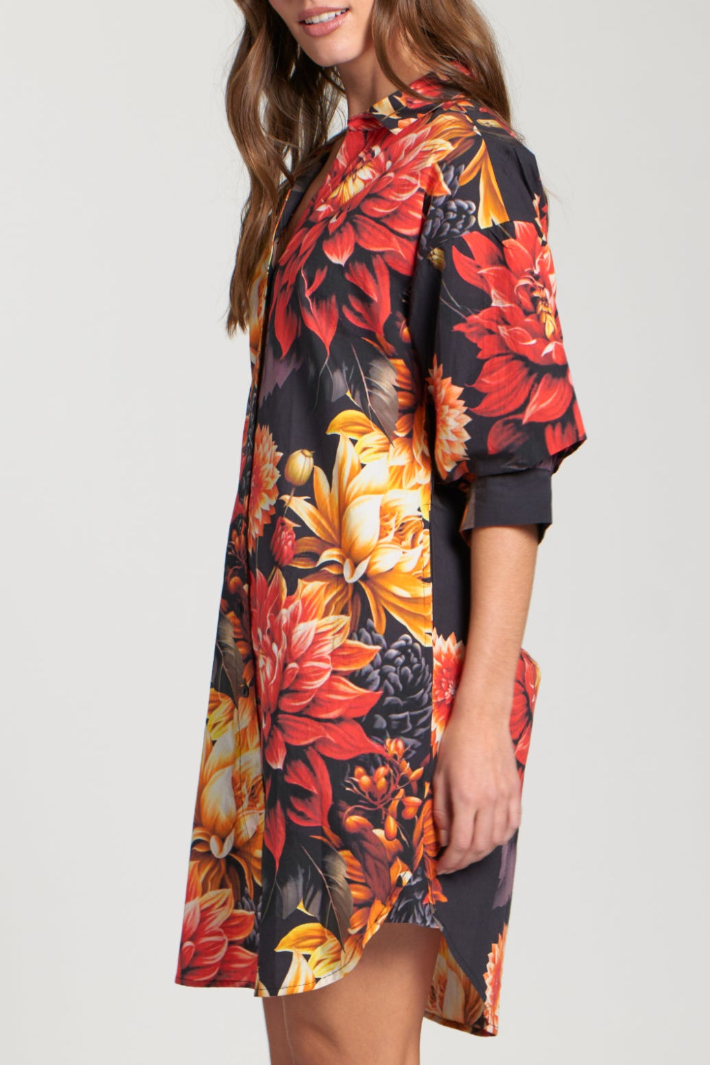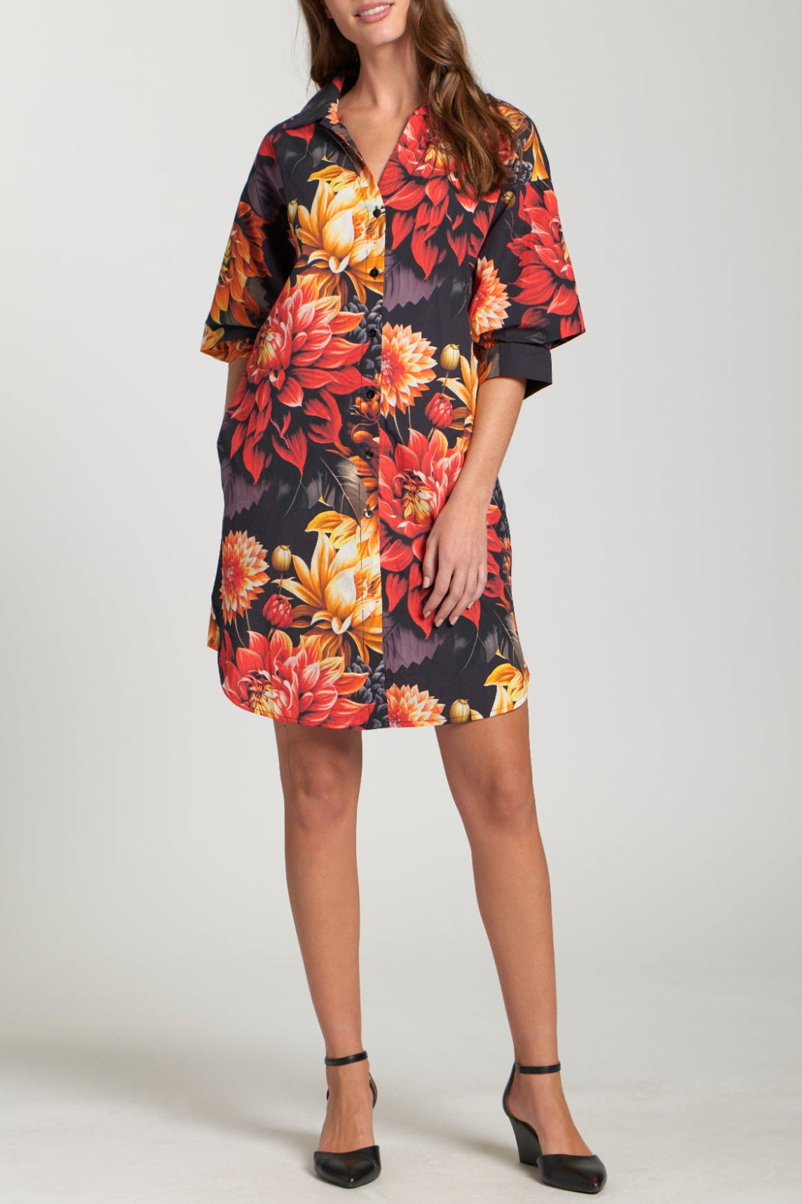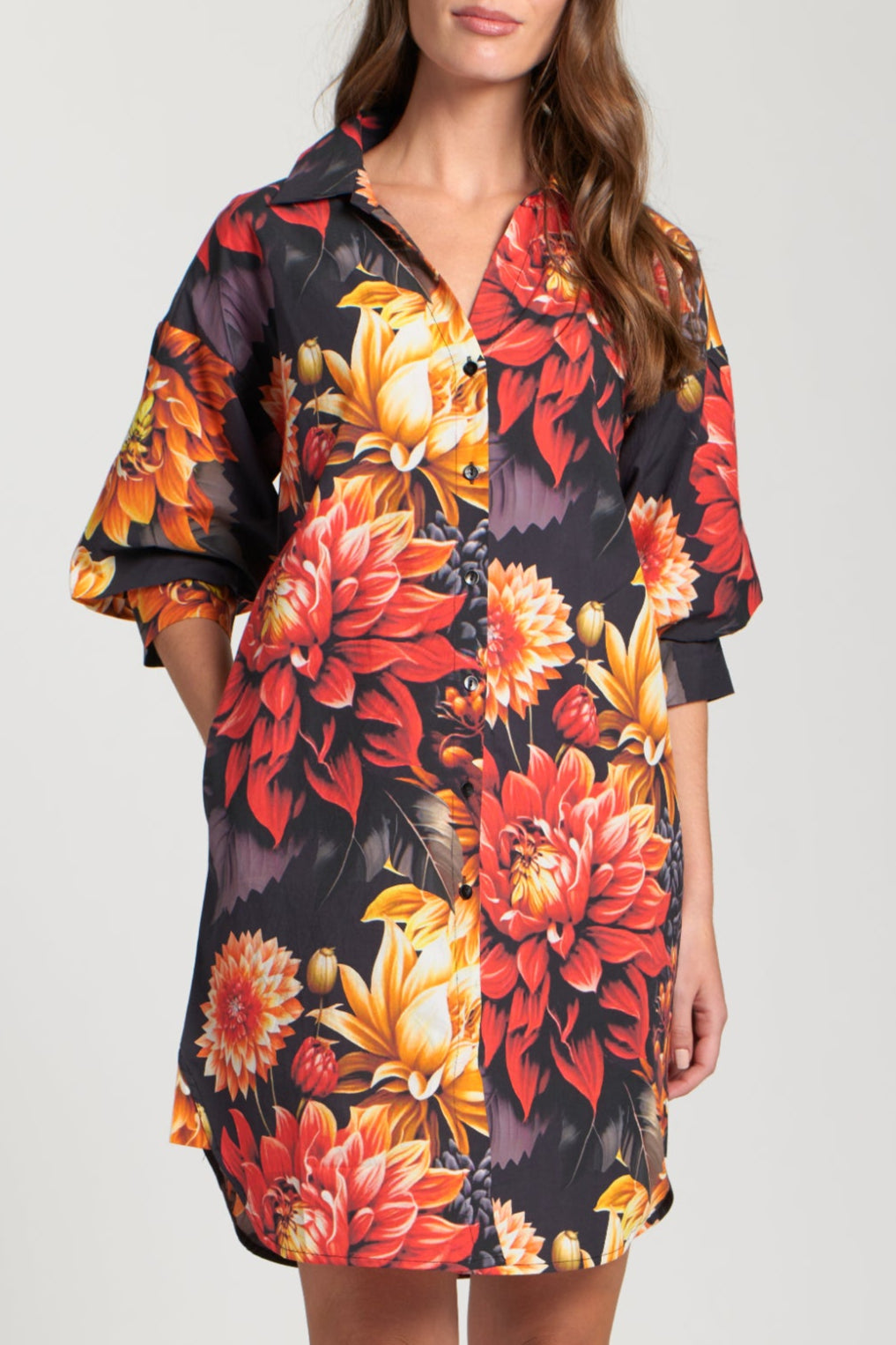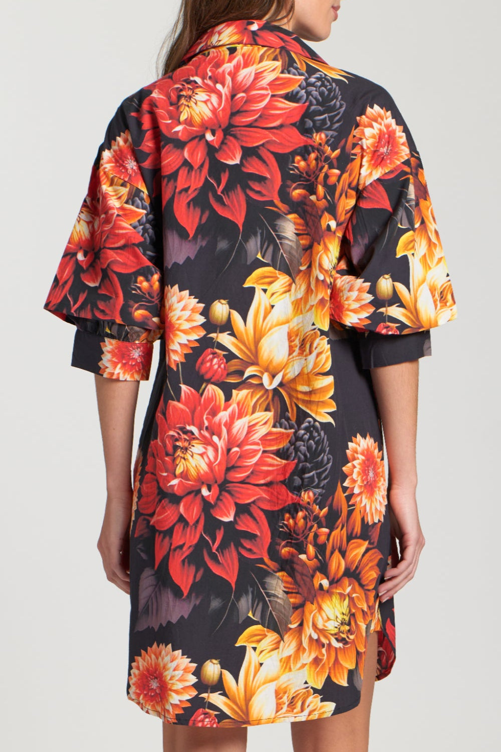 This vibrant floral shirt dress features a lively mix of red, peach, and blue hues with a tropical-inspired print. Designed with a button-down front, puff sleeves, and a waist tie for a flattering fit, it's perfect for a chic and effortless look.