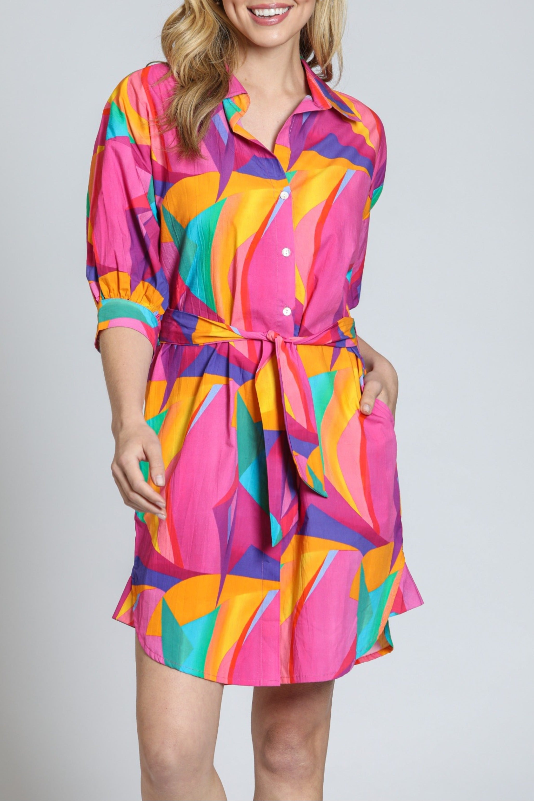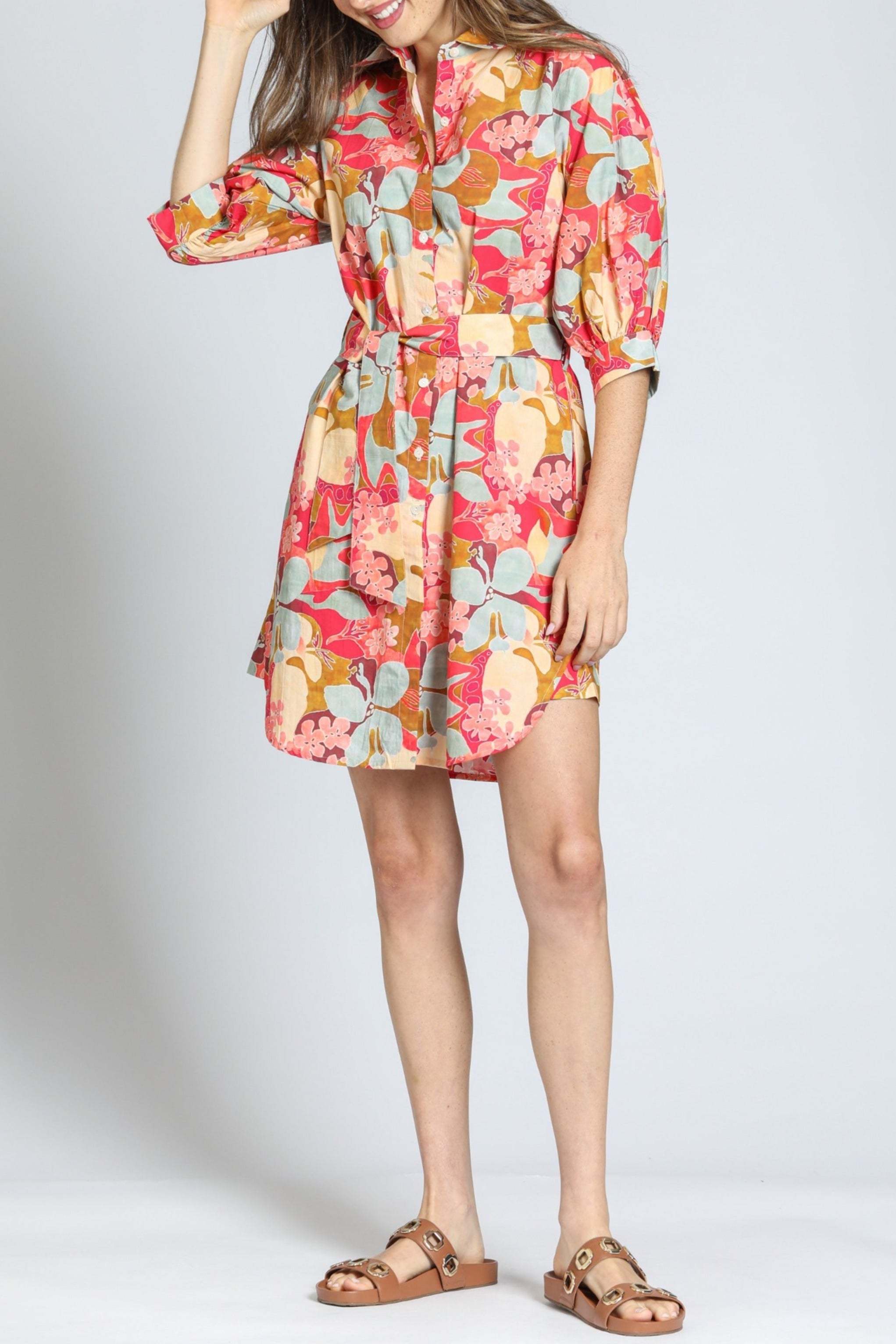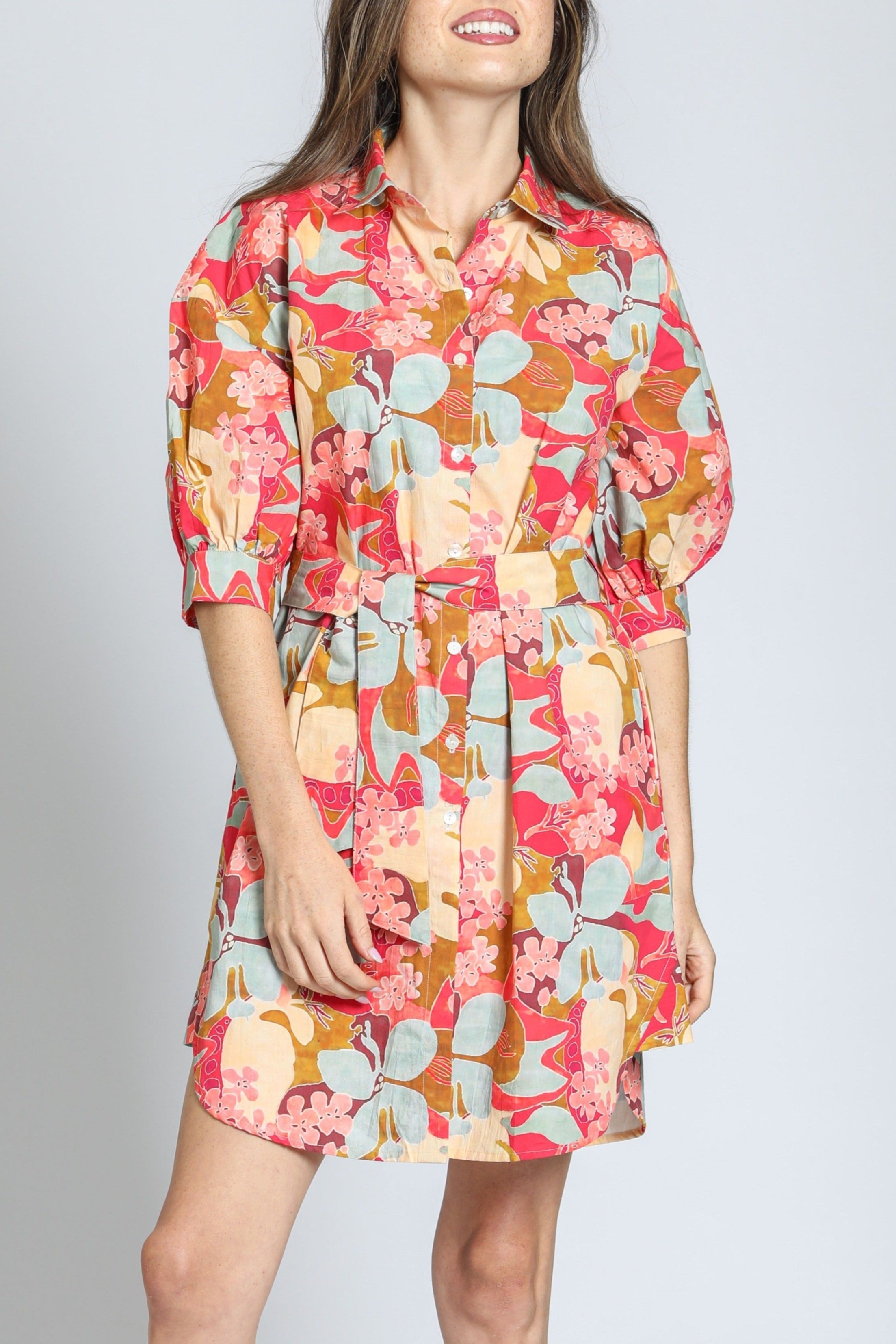This vibrant floral shirt dress features a lively mix of red, peach, and blue hues with a tropical-inspired print. Designed with a button-down front, puff sleeves, and a waist tie for a flattering fit, it's perfect for a chic and effortless look.