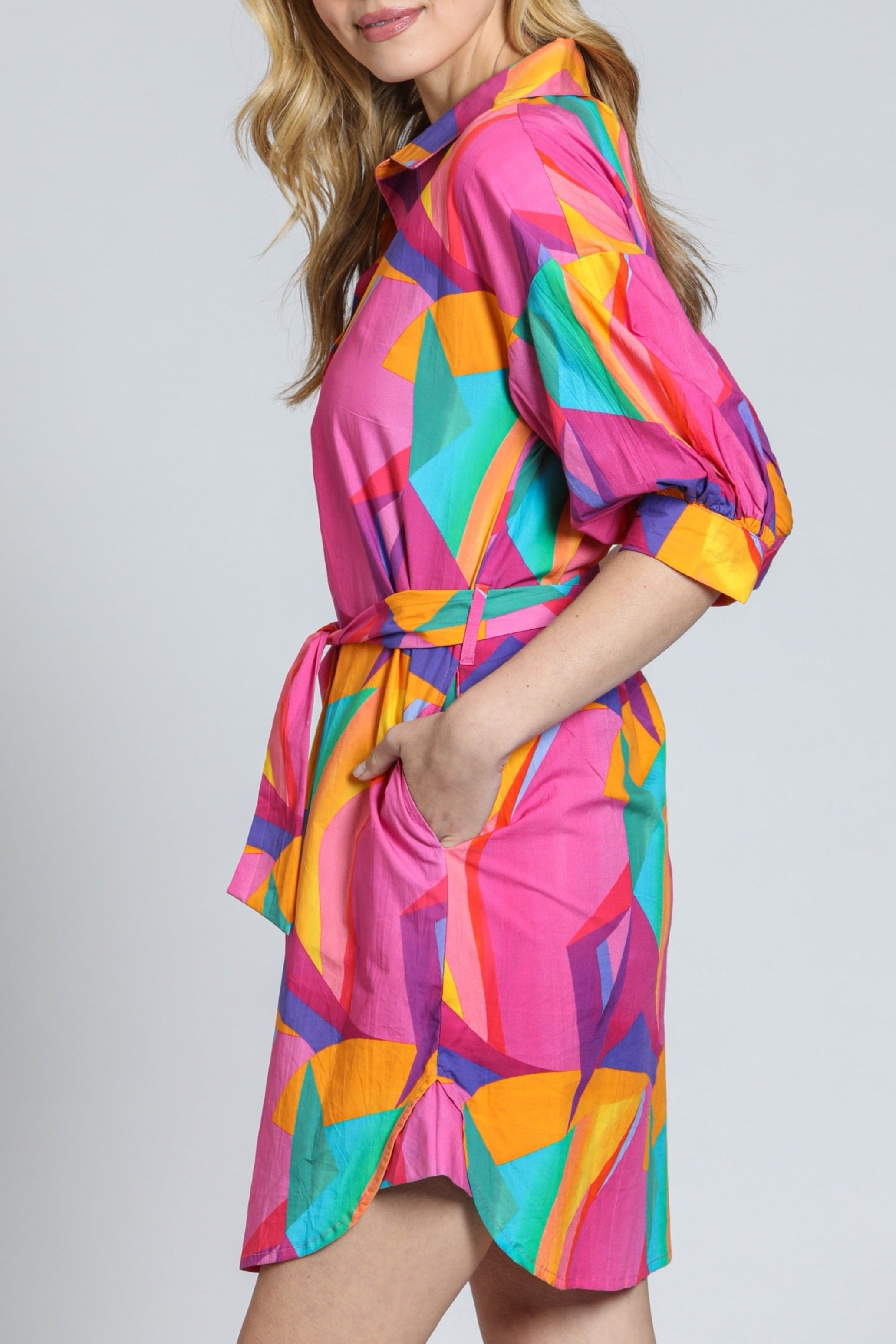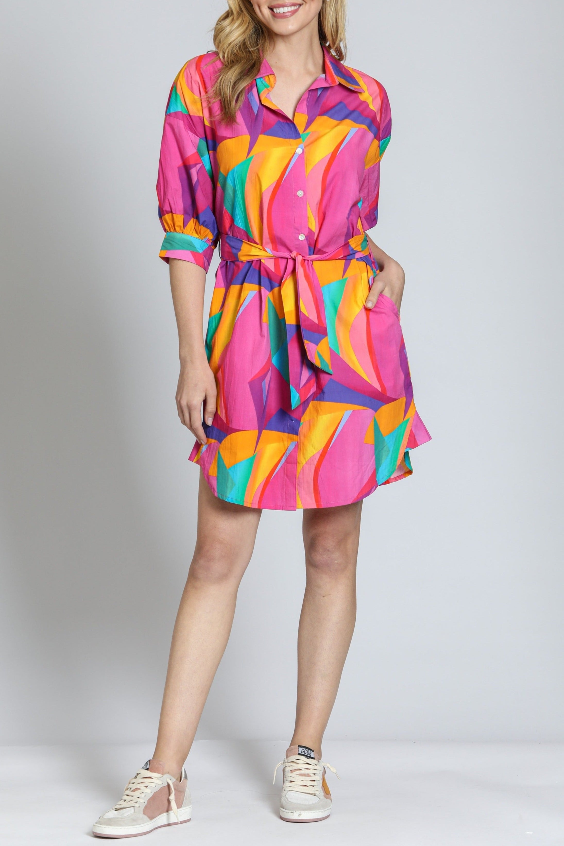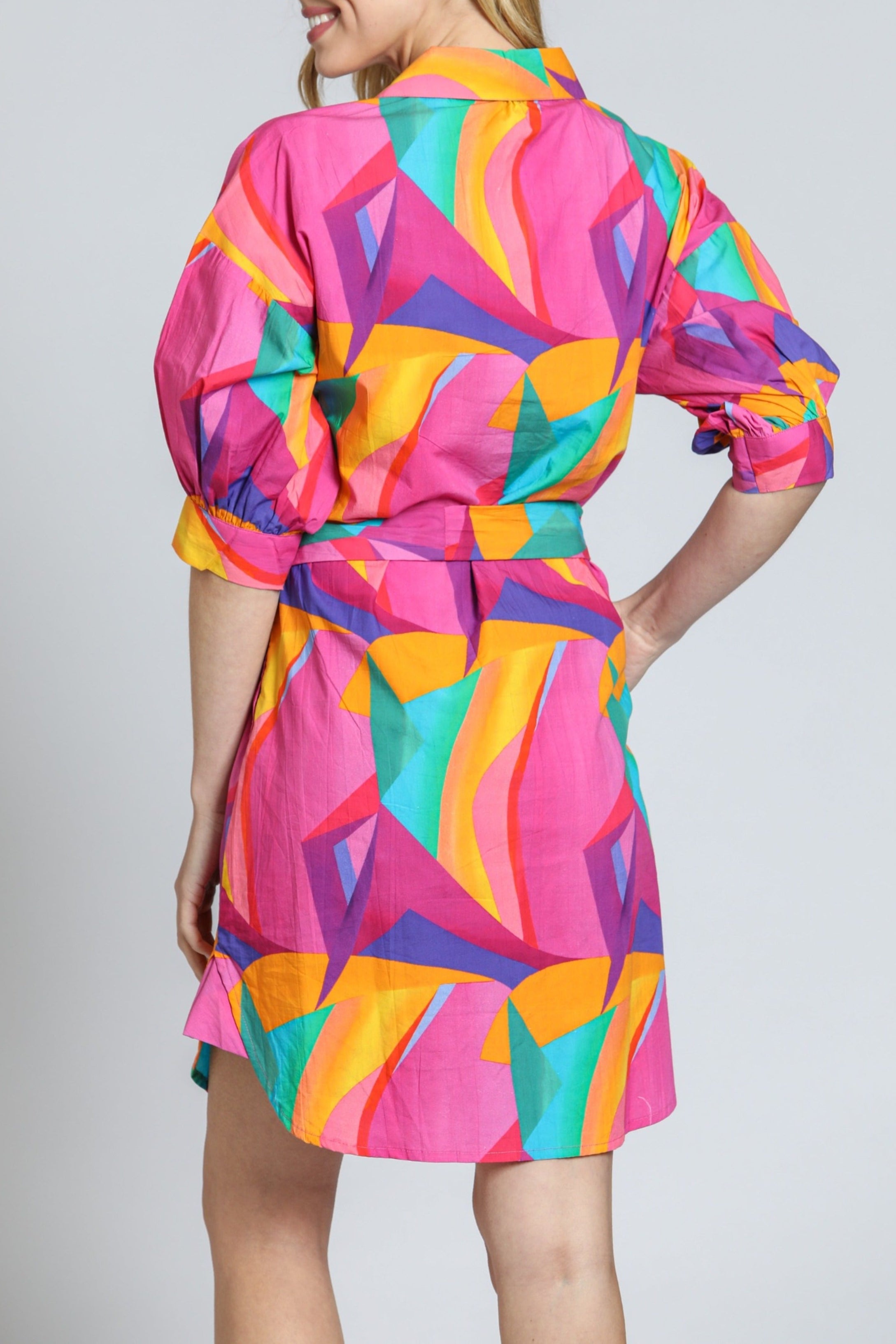 This vibrant floral shirt dress features a lively mix of red, peach, and blue hues with a tropical-inspired print. Designed with a button-down front, puff sleeves, and a waist tie for a flattering fit, it's perfect for a chic and effortless look.