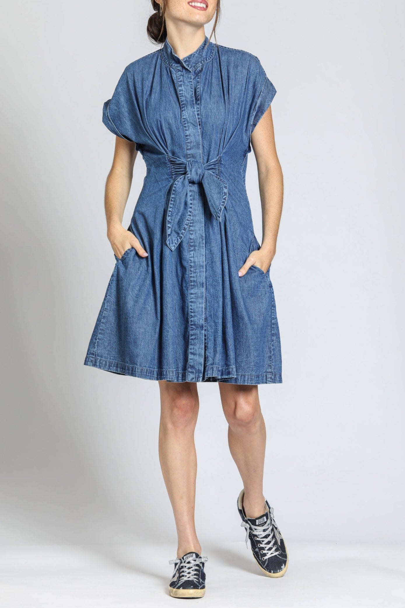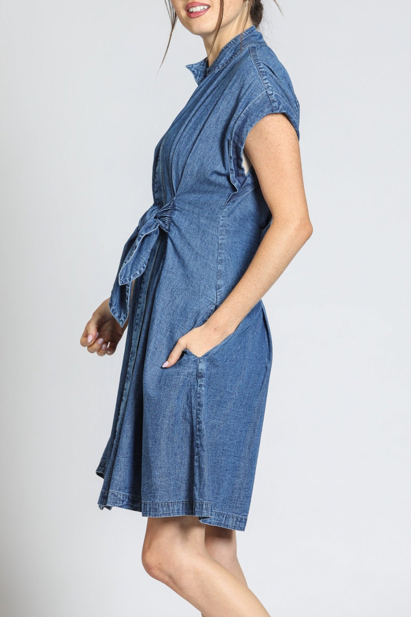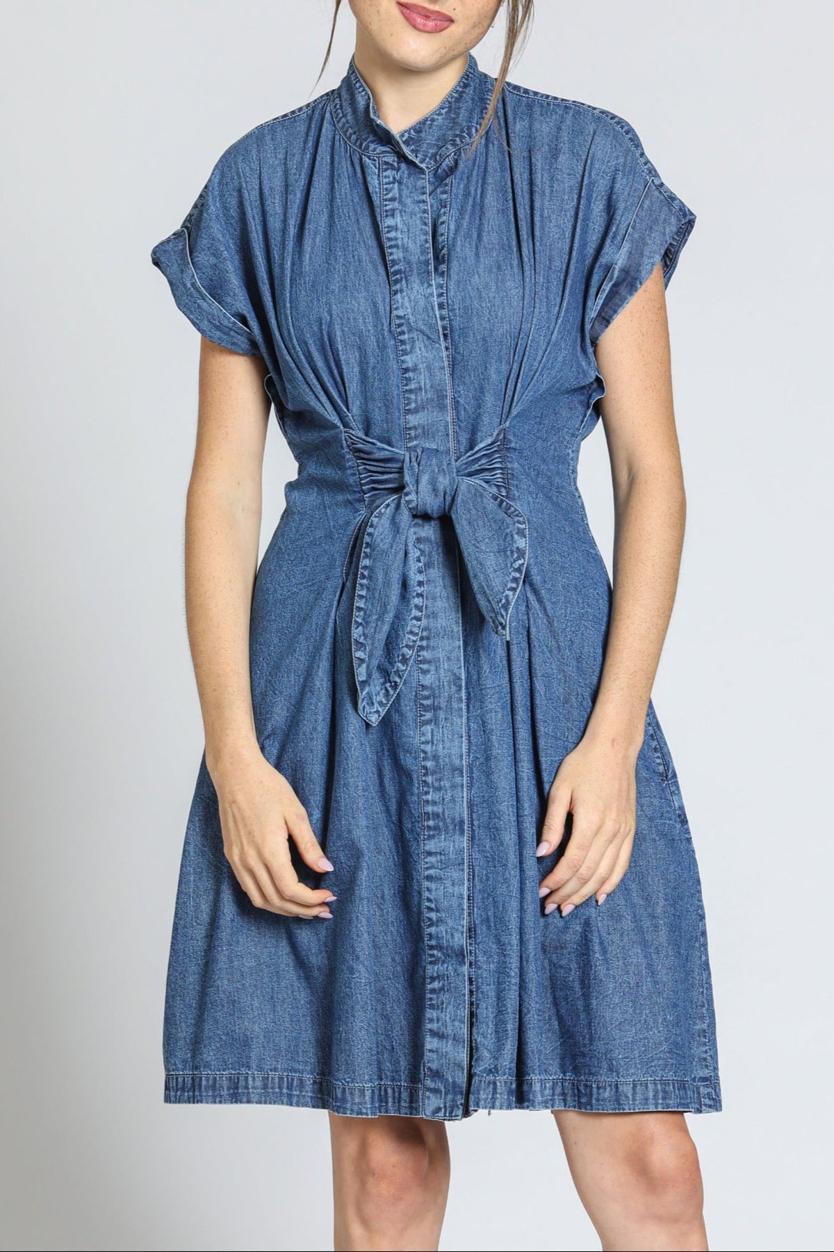 This chic button-front shirt dress features a flattering silhouette with adjustable ties for a custom fit. Effortlessly stylish and versatile, it's perfect for both casual and dressy occasions.