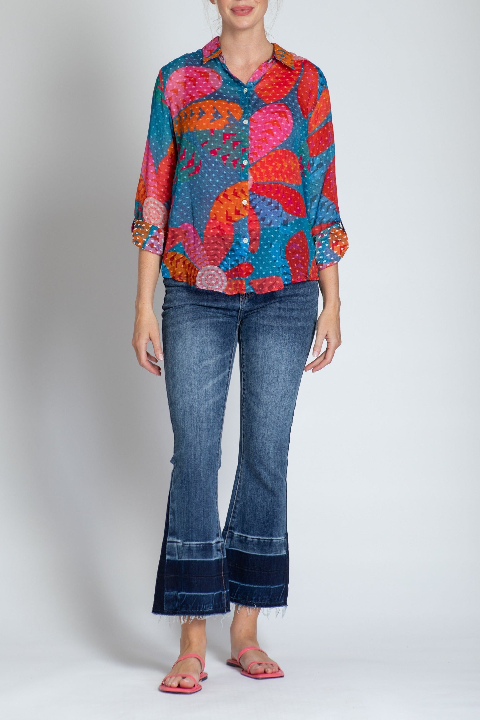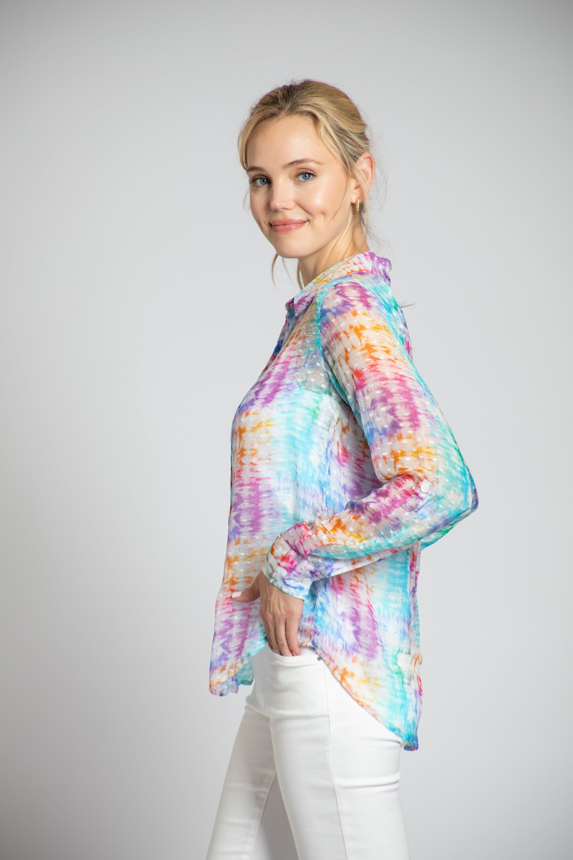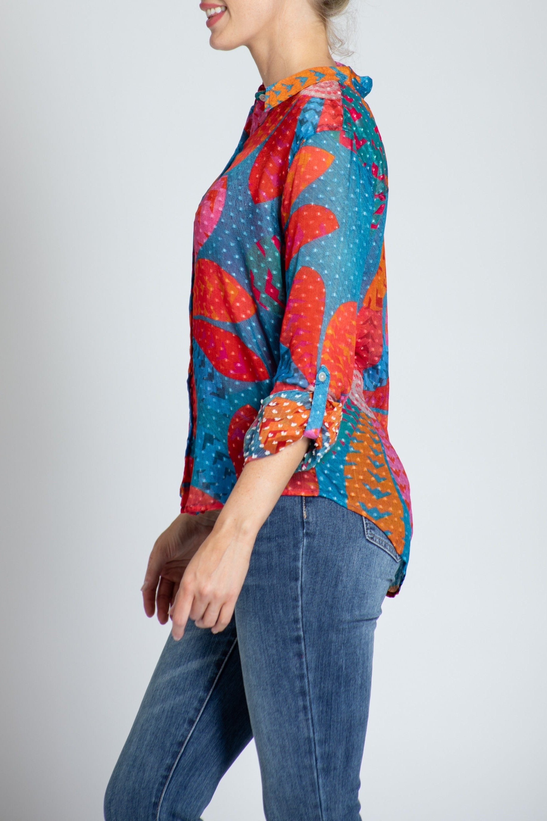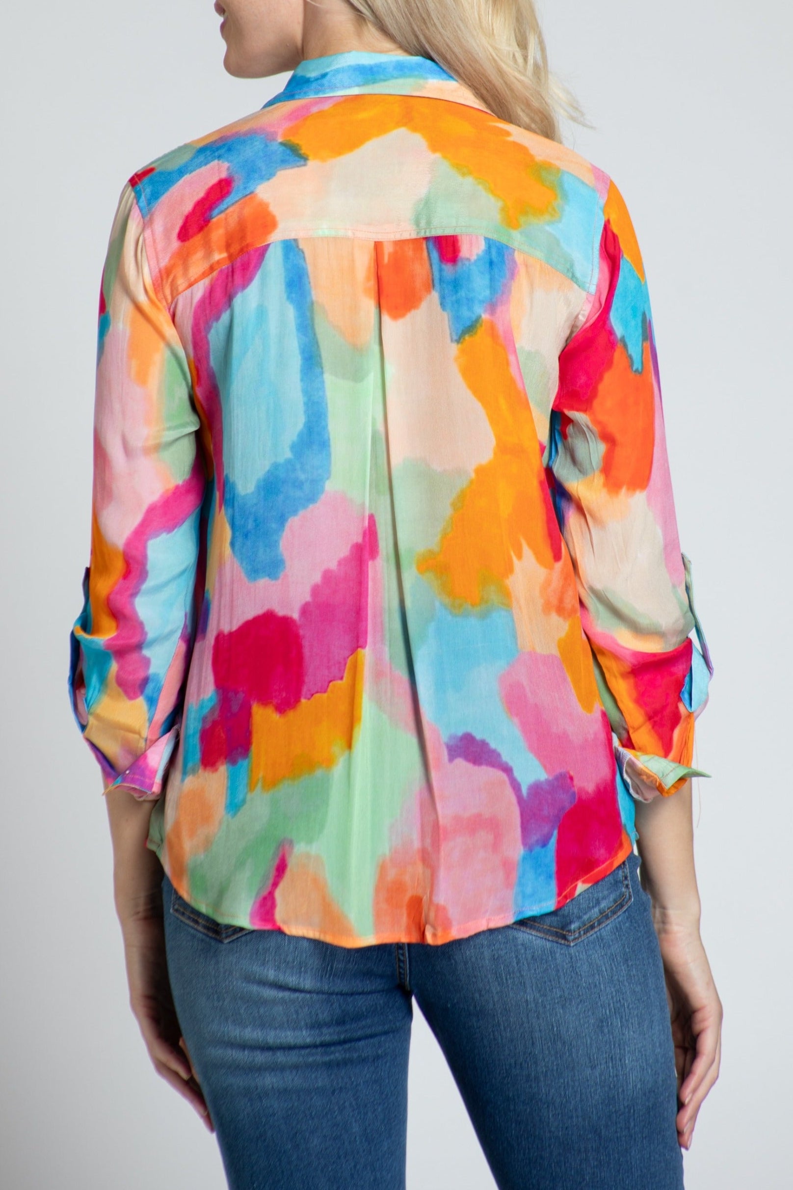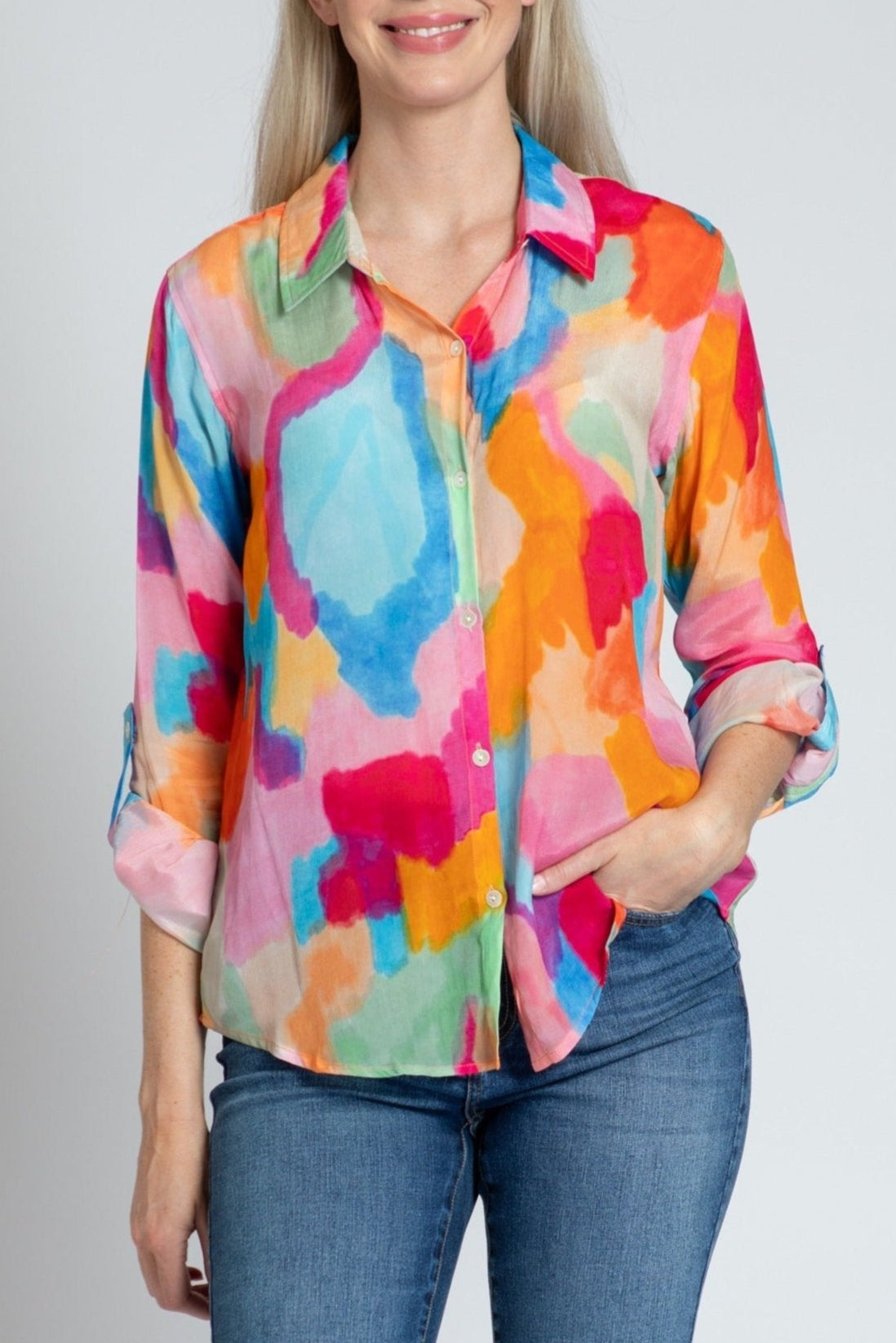 A long sleeve button-up is a style essential, and this easy piece has captured our attention thanks to the print details and effortless look. We love the beautiful prints flowing on the fabric, rolled up tab sleeves, flattering silhouette and every other detail we need to snap up this easy blouse and wear it on repeat in every season. Slip on this button-up shirt and fall in love with our flattering silhouette, relaxed fit and breathtaking print designs. Nothing beats a basic with a splash of colors.
