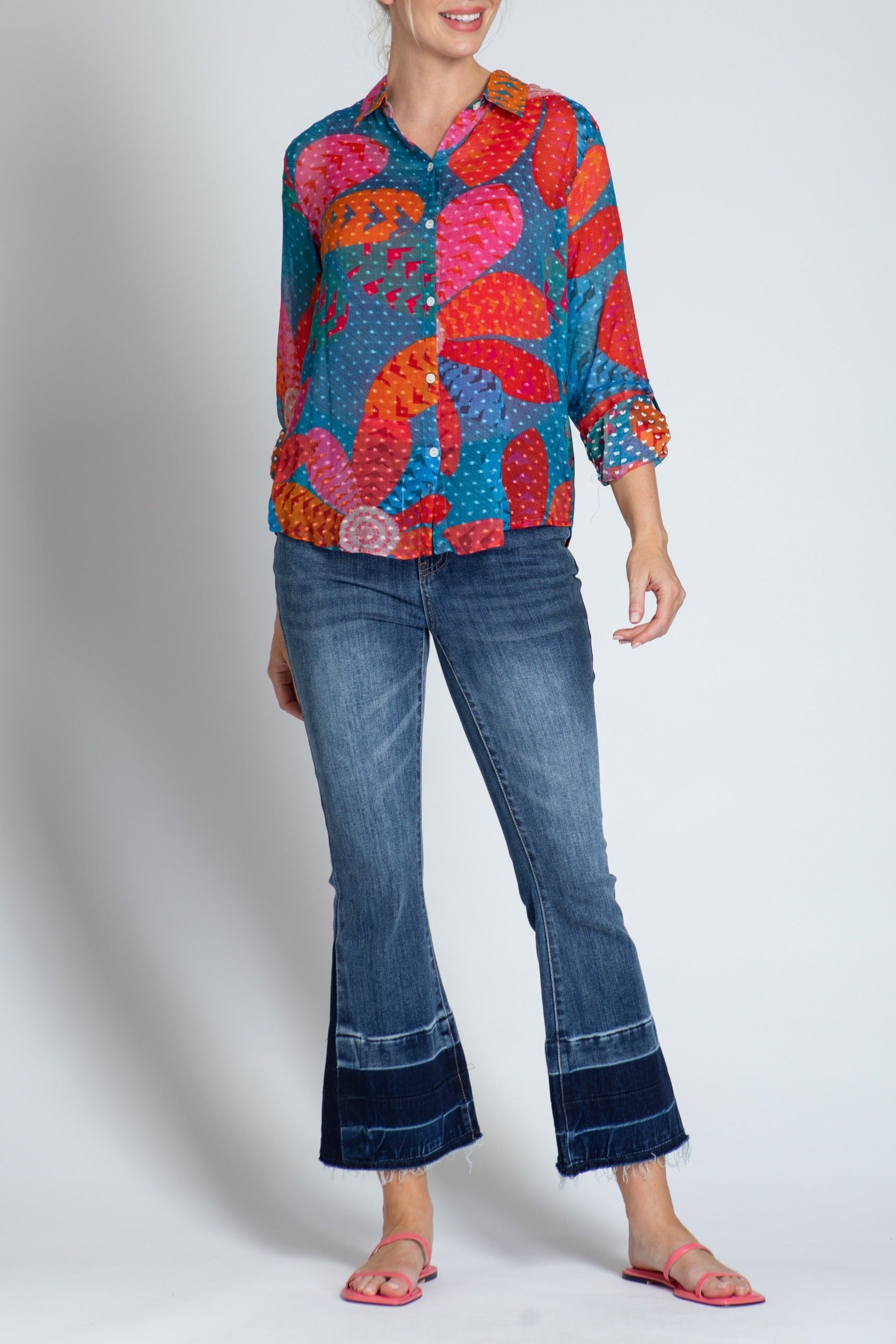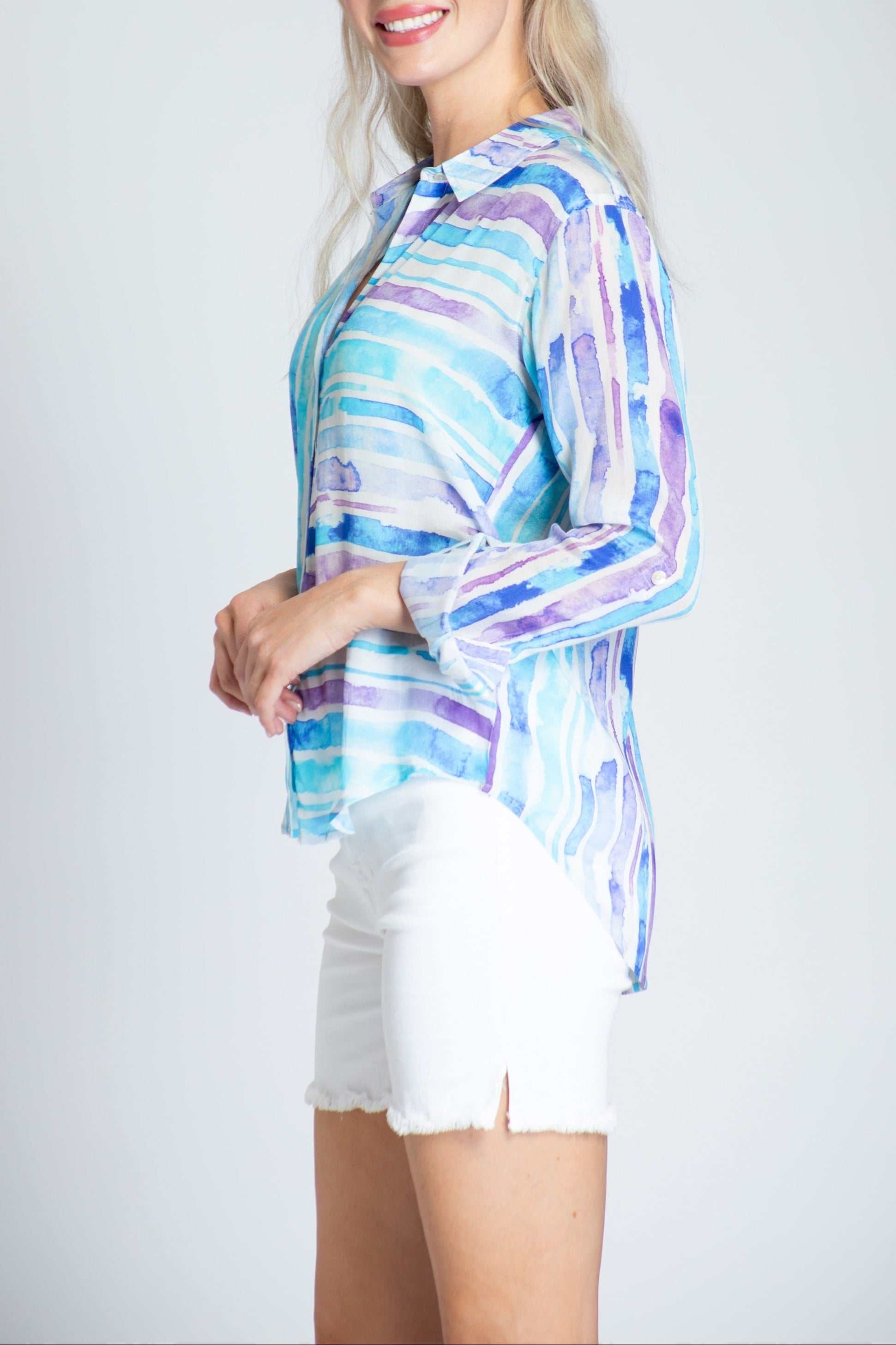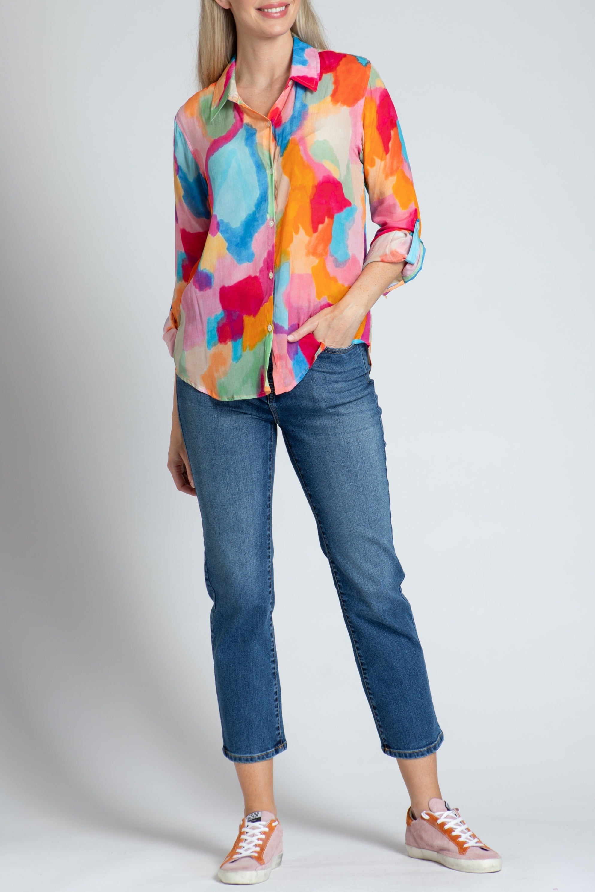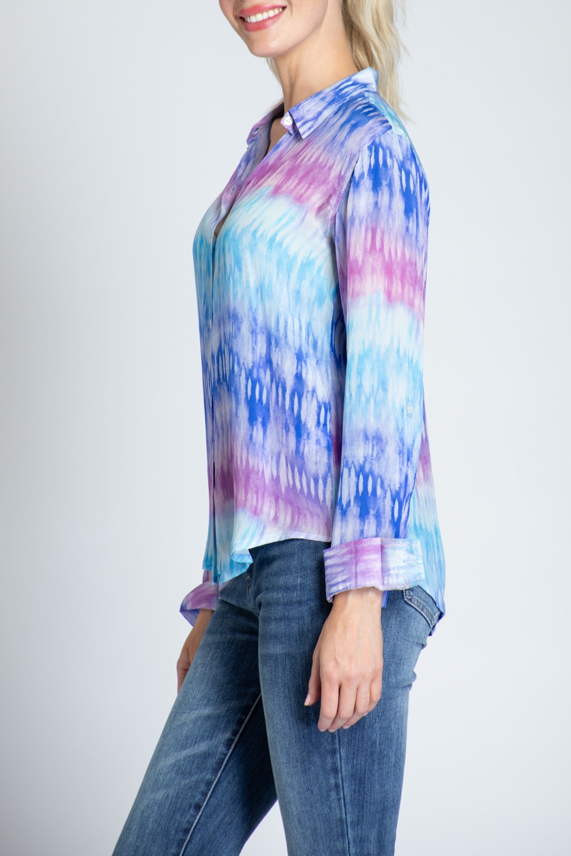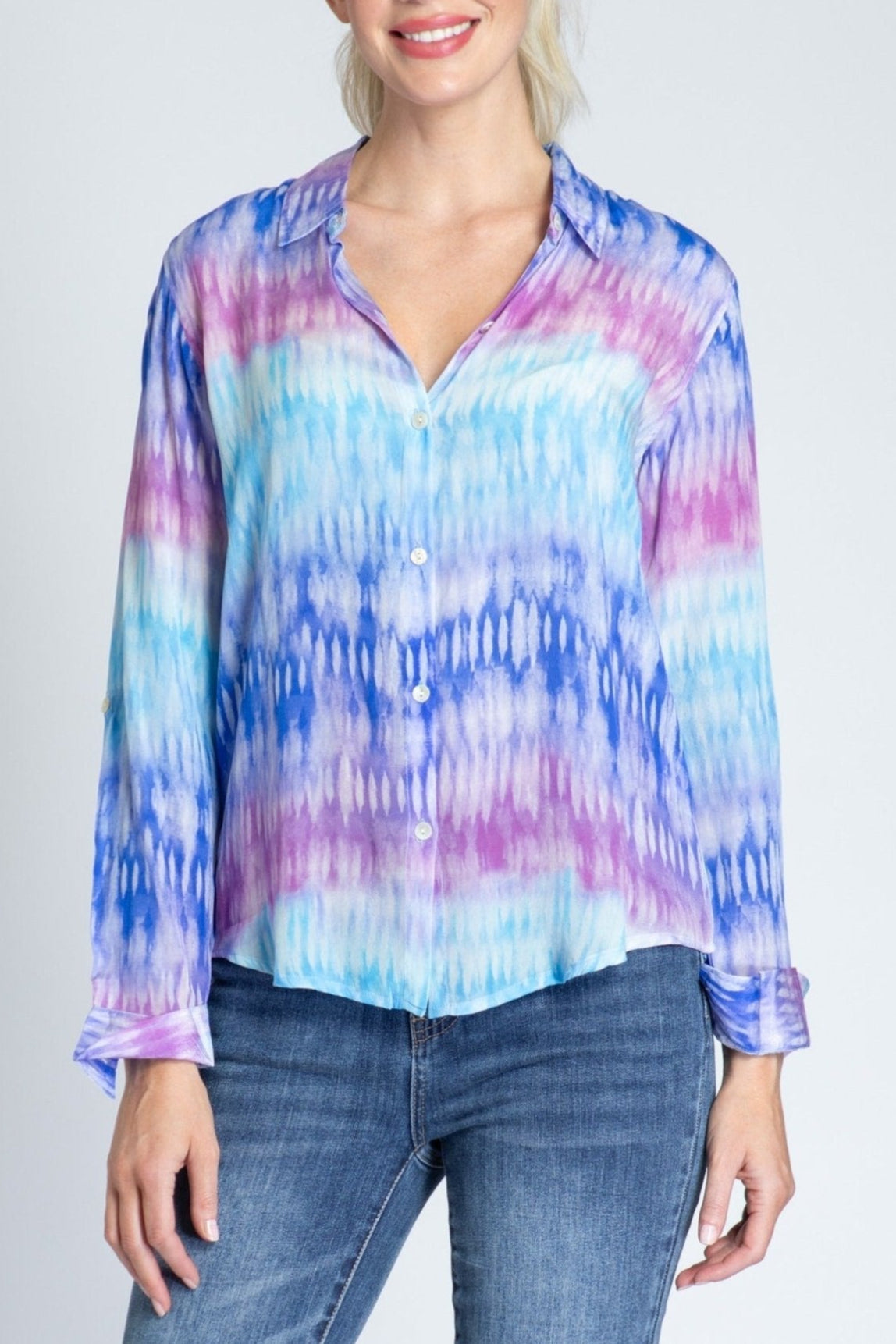 A long sleeve button-up is a style essential, and this easy piece has captured our attention thanks to the print details and effortless look. We love the beautiful prints flowing on the fabric, rolled up tab sleeves, flattering silhouette and every other detail we need to snap up this easy blouse and wear it on repeat in every season. Slip on this button-up shirt and fall in love with our flattering silhouette, relaxed fit and breathtaking print designs. Nothing beats a basic with a splash of colors.
