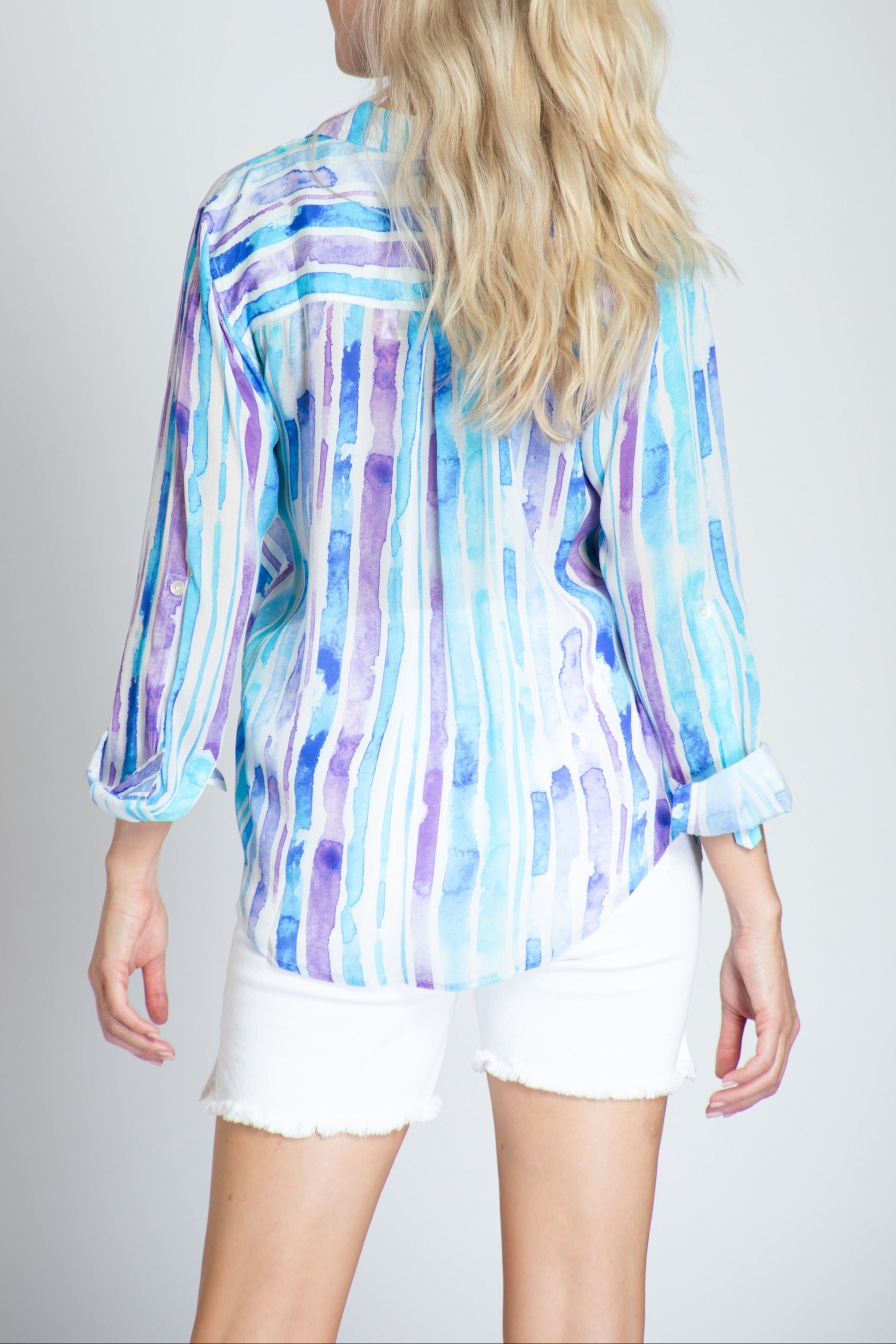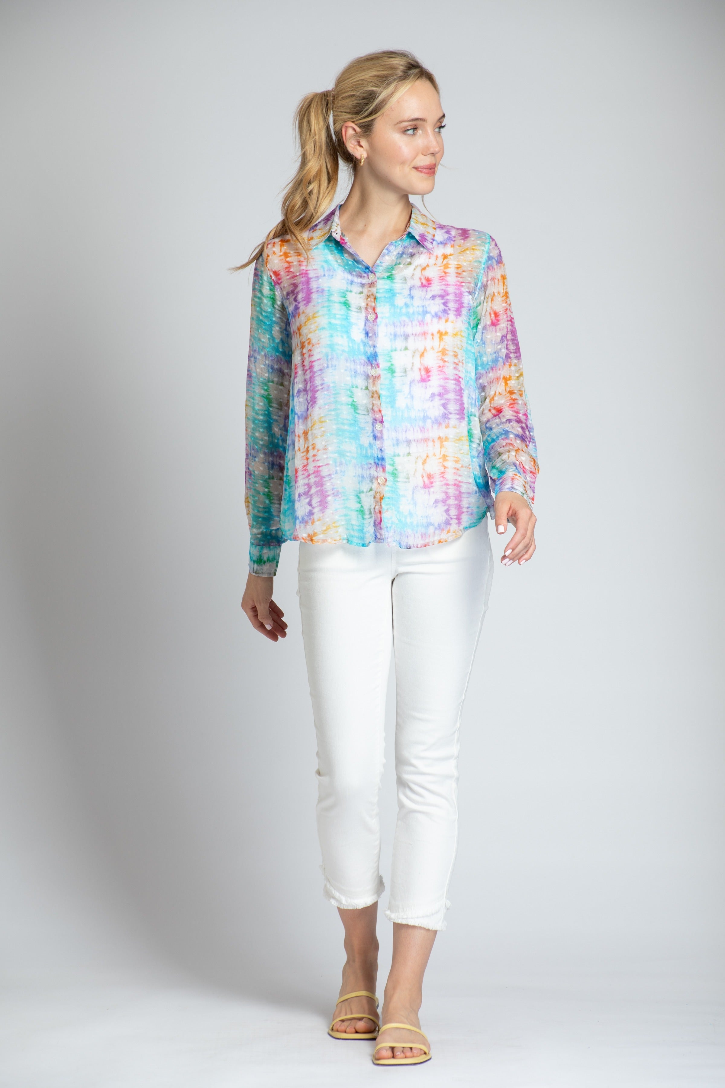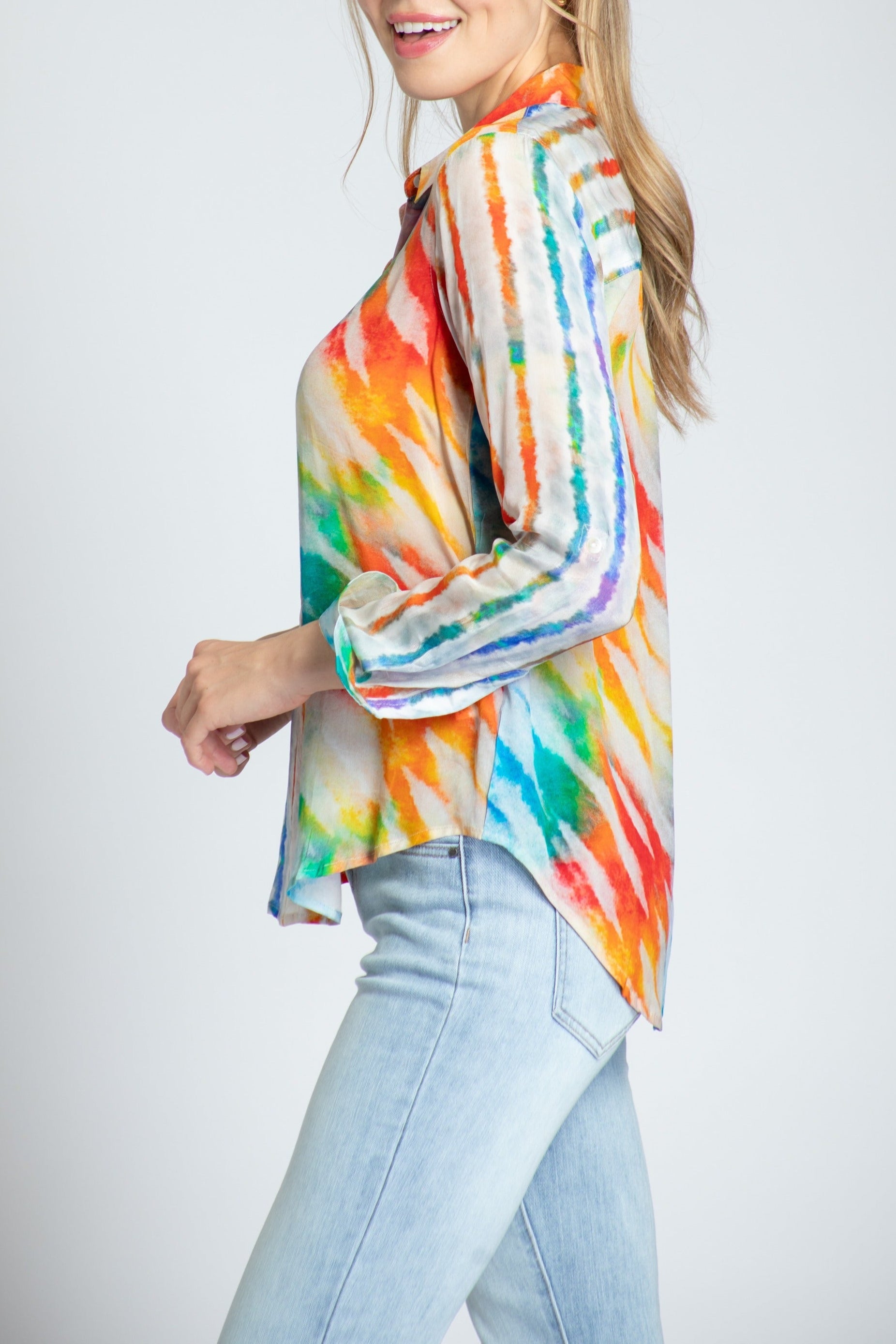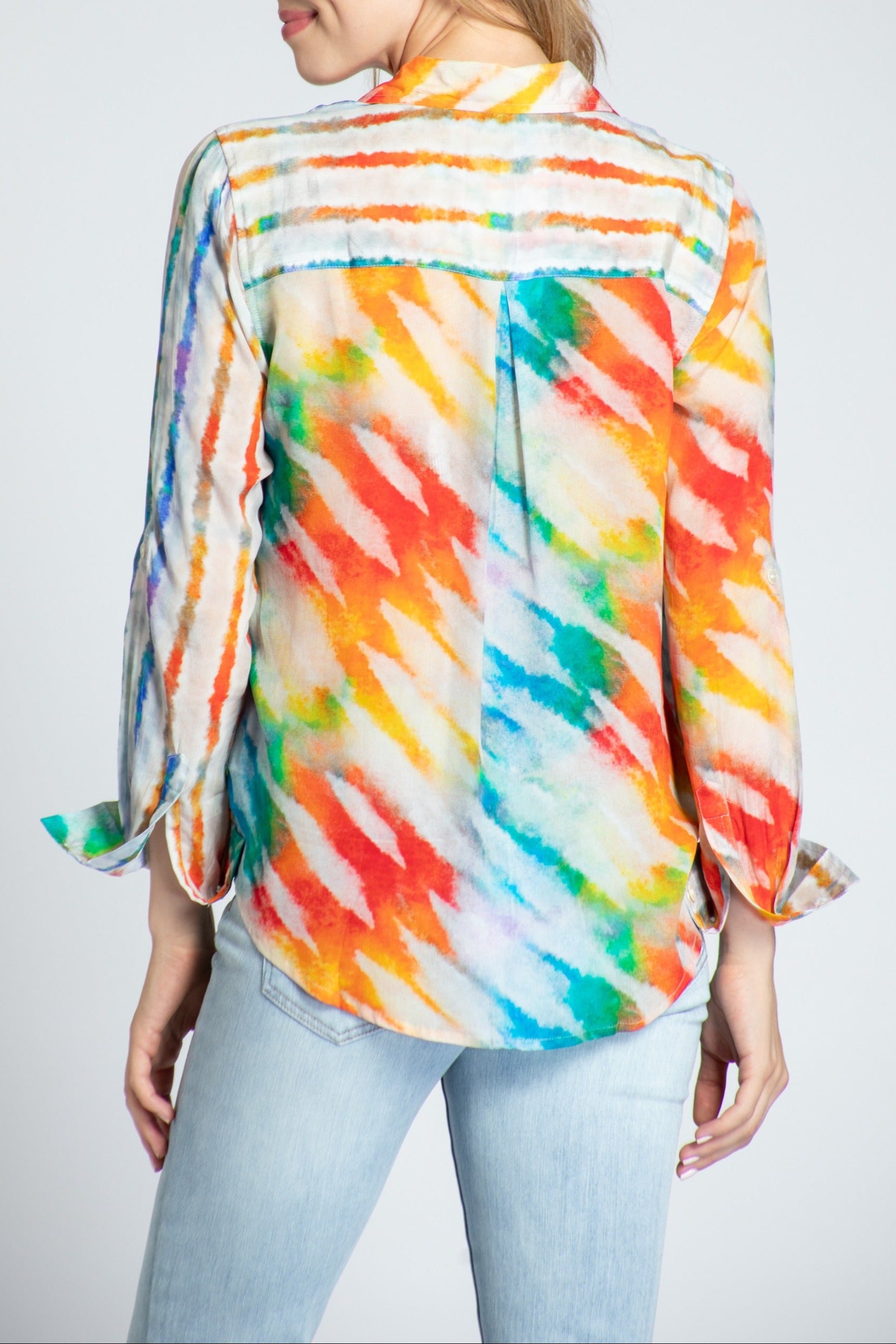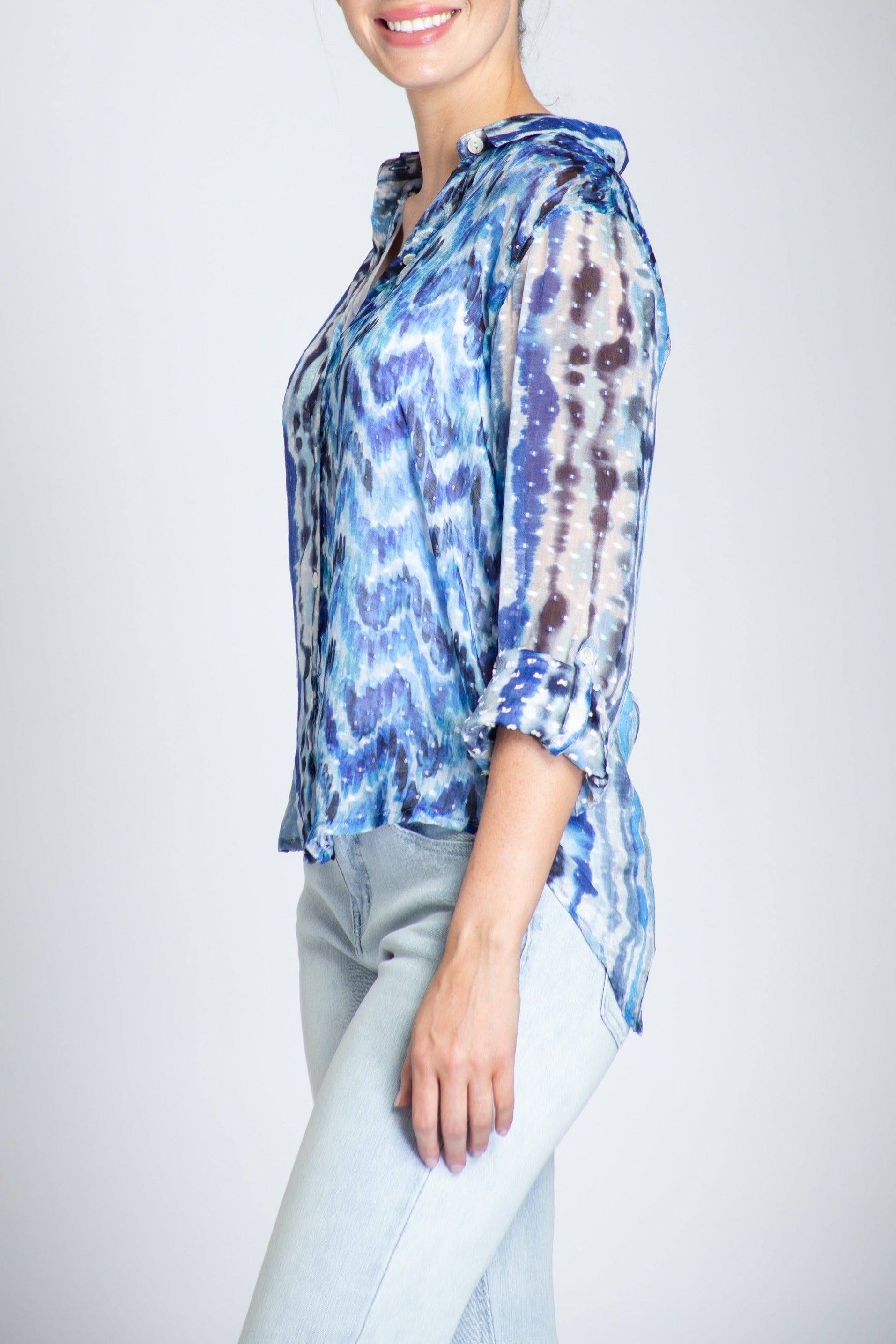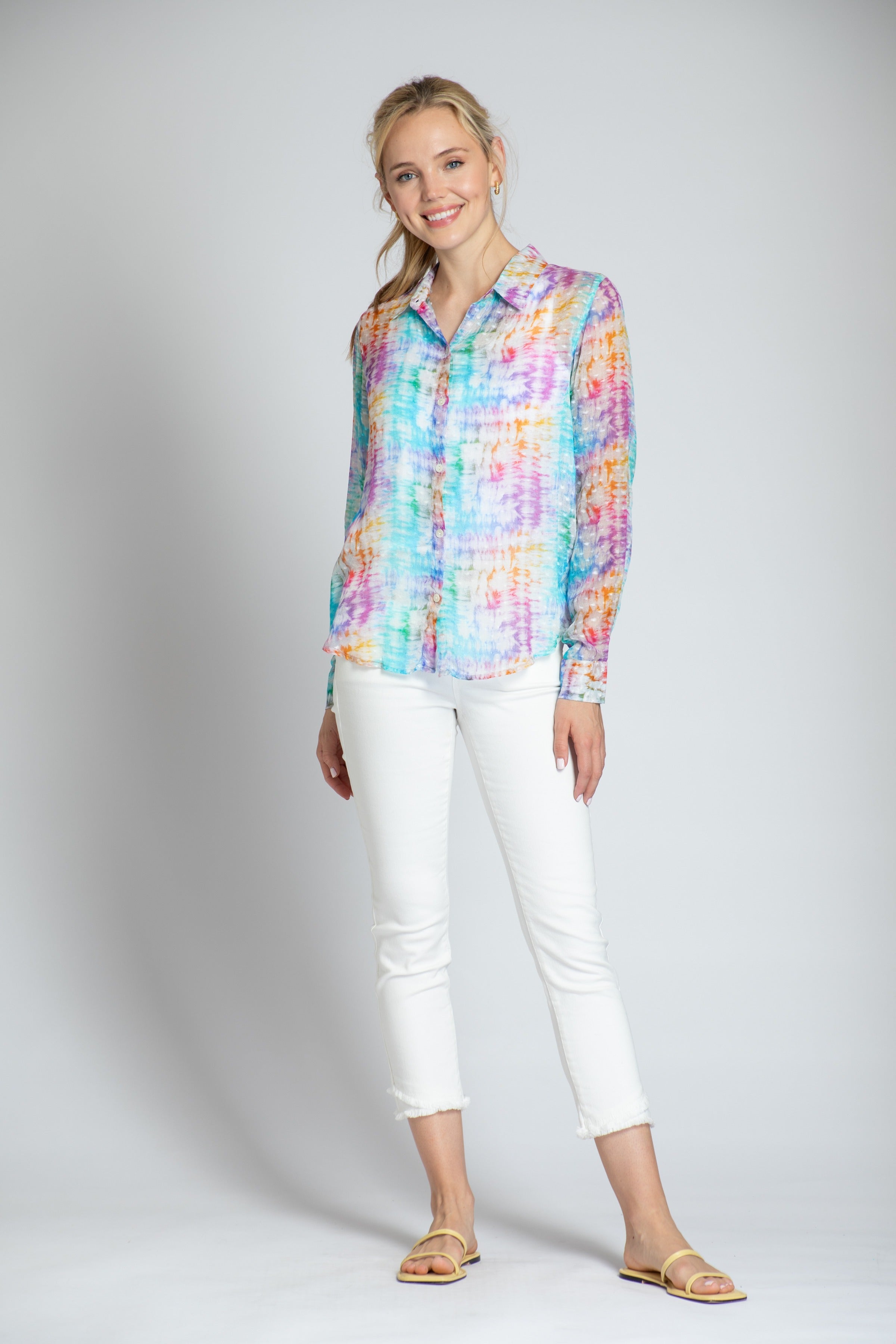 A long sleeve button-up is a style essential, and this easy piece has captured our attention thanks to the print details and effortless look. We love the beautiful prints flowing on the fabric, rolled up tab sleeves, flattering silhouette and every other detail we need to snap up this easy blouse and wear it on repeat in every season. Slip on this button-up shirt and fall in love with our flattering silhouette, relaxed fit and breathtaking print designs. Nothing beats a basic with a splash of colors.