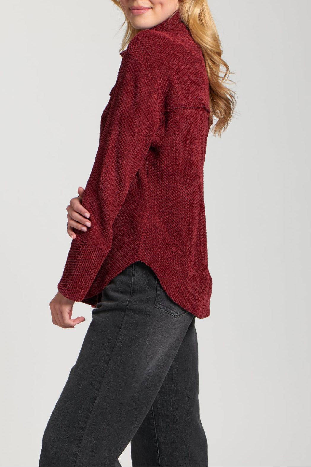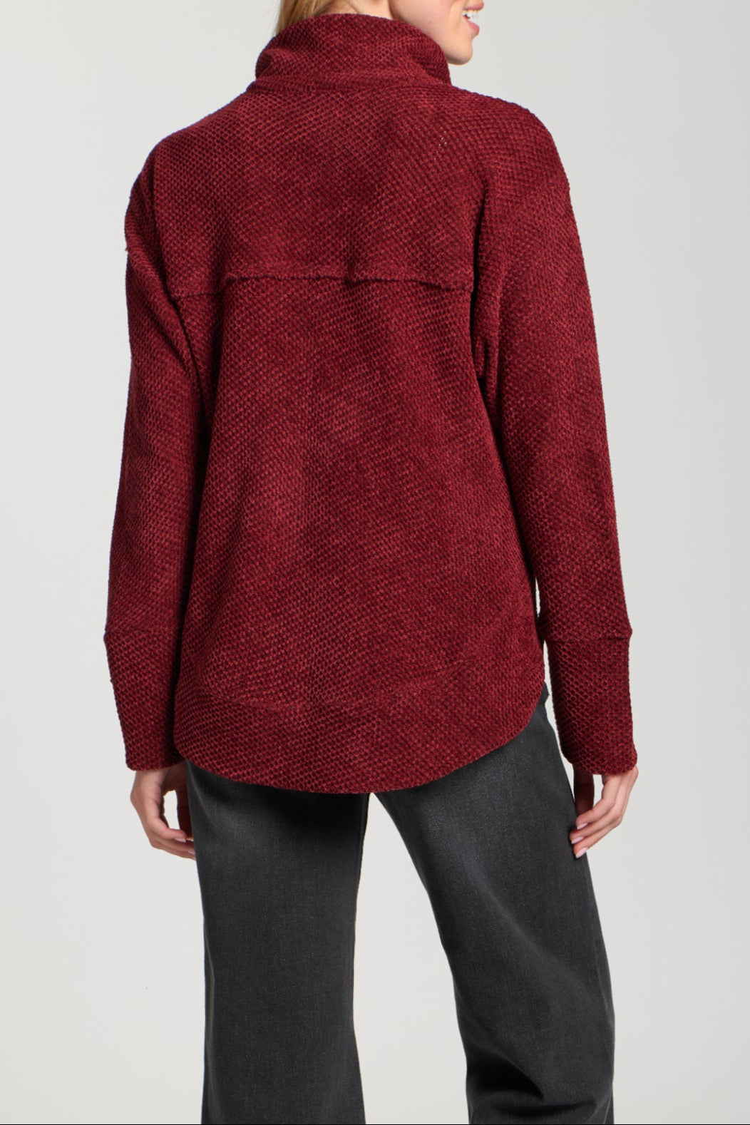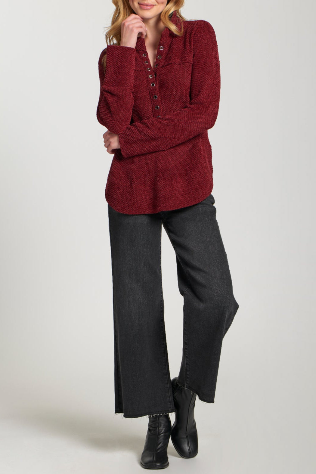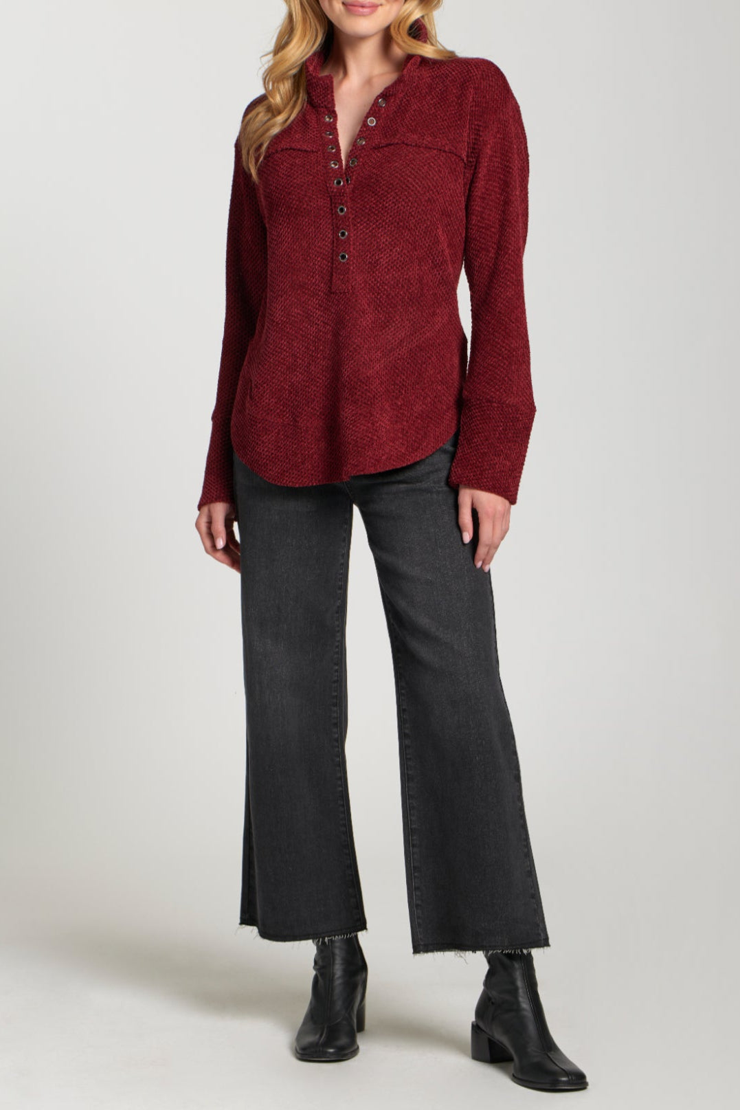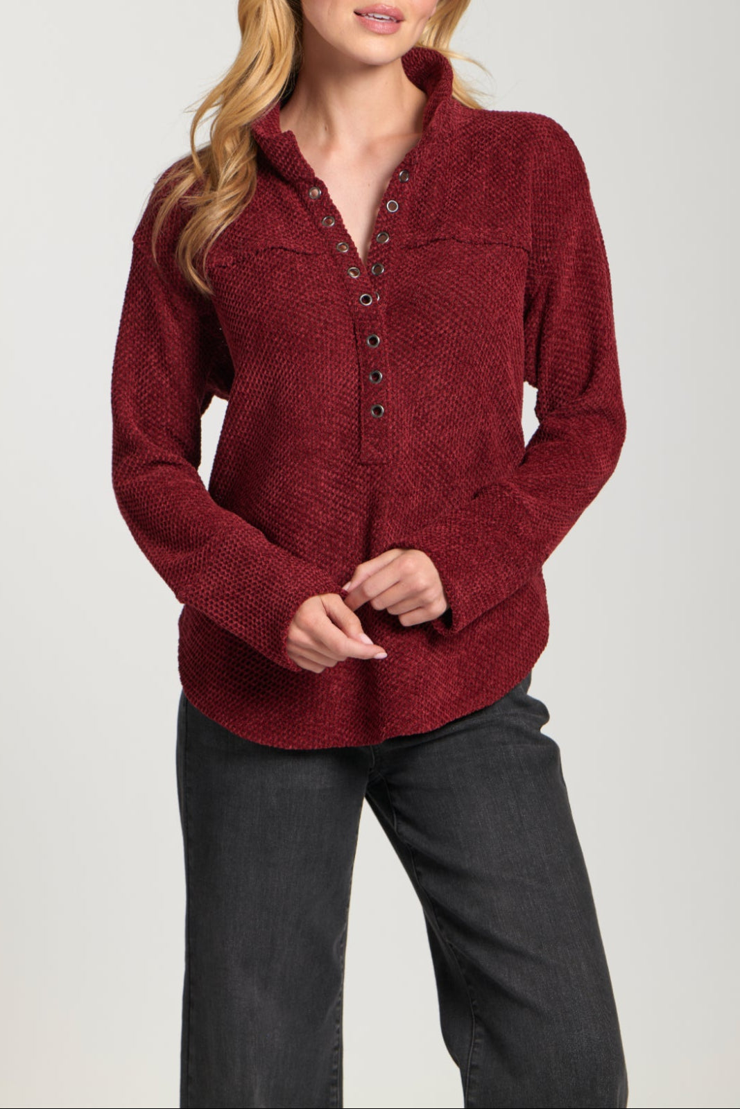Wrap yourself in comfort and style with our gorgeous Chenille Henley. Crafted from a plush, soft chenille fabric, this top offers a luxurious texture and a rich, appealing color, making it the perfect piece for cooler weather.