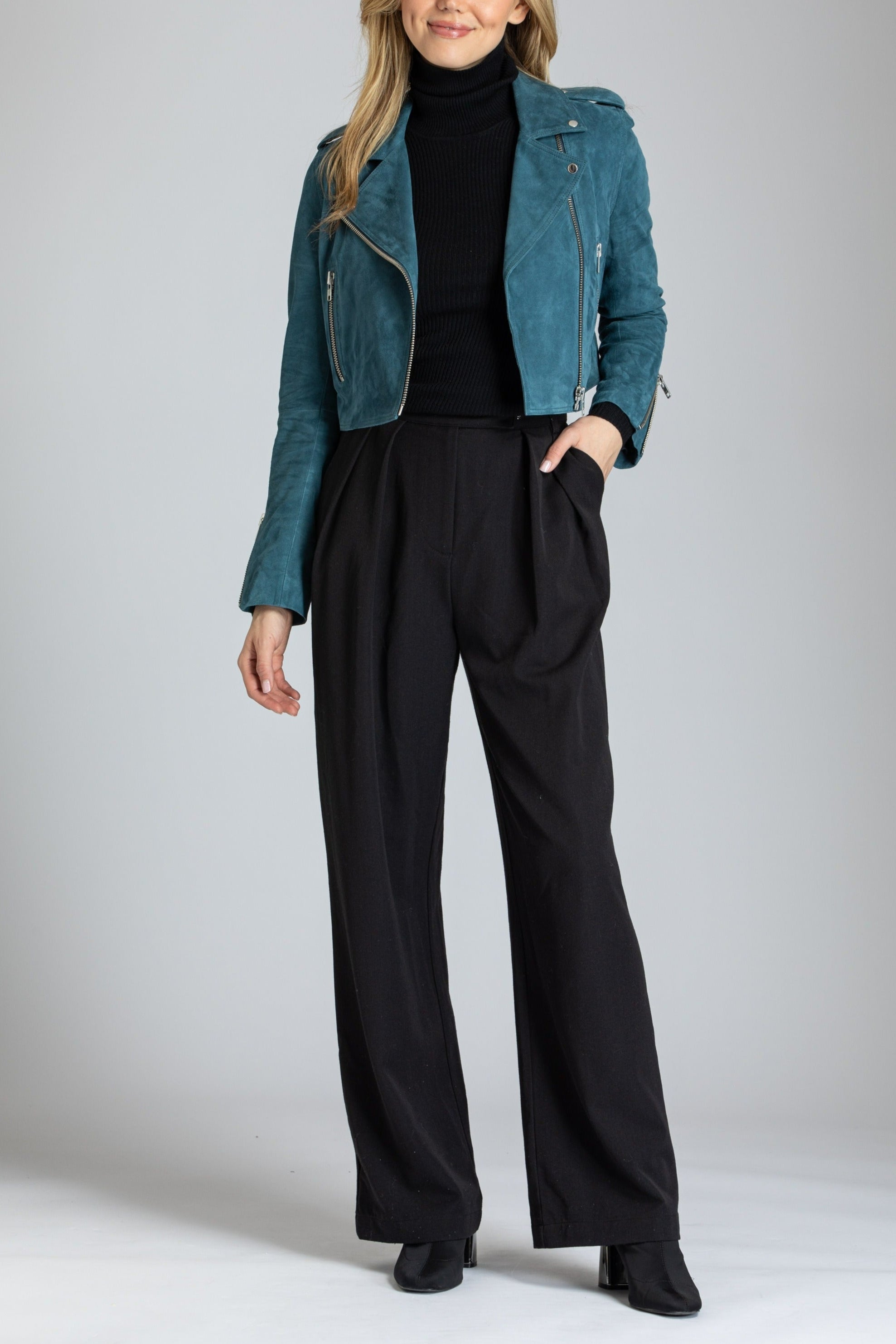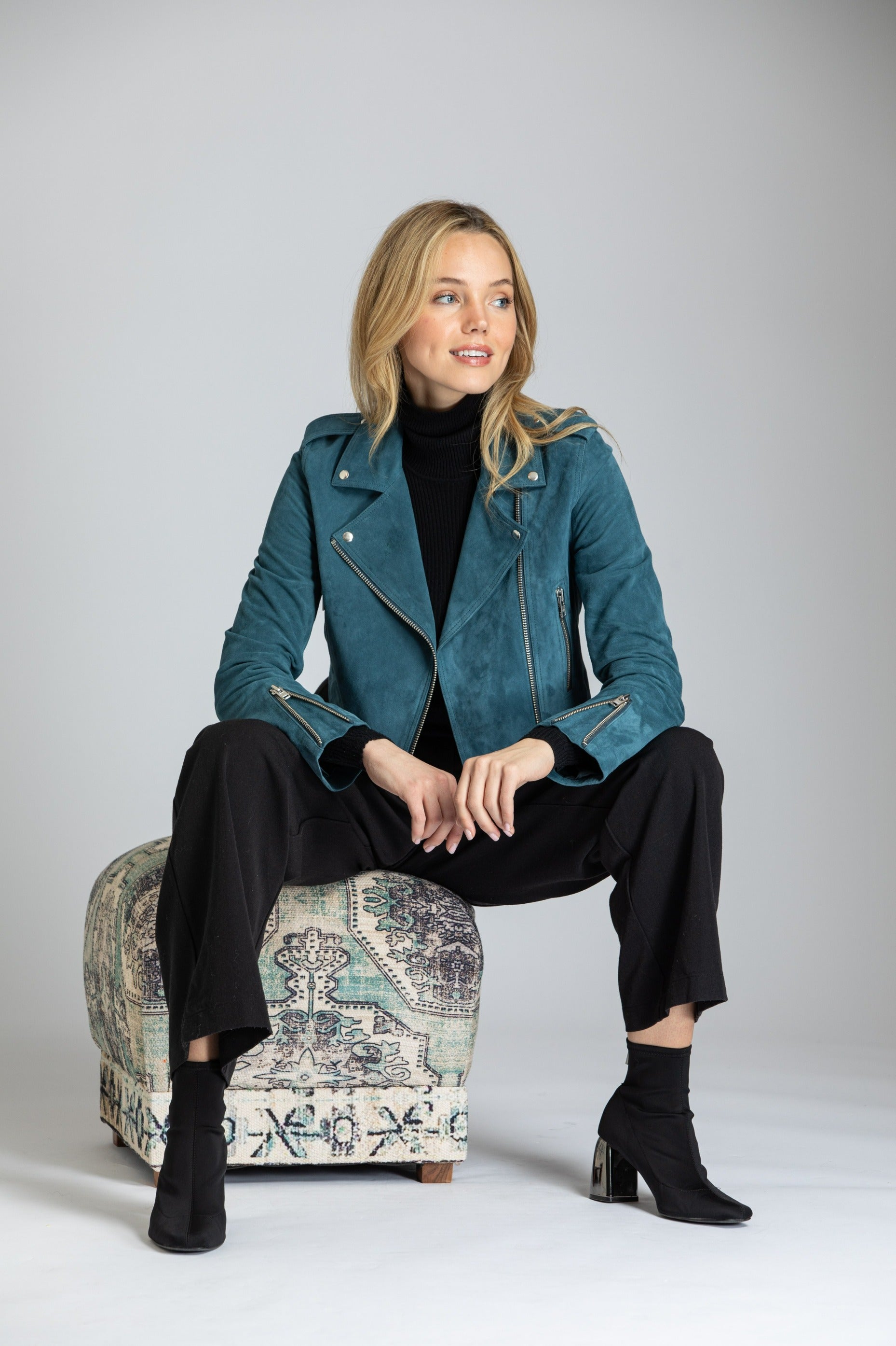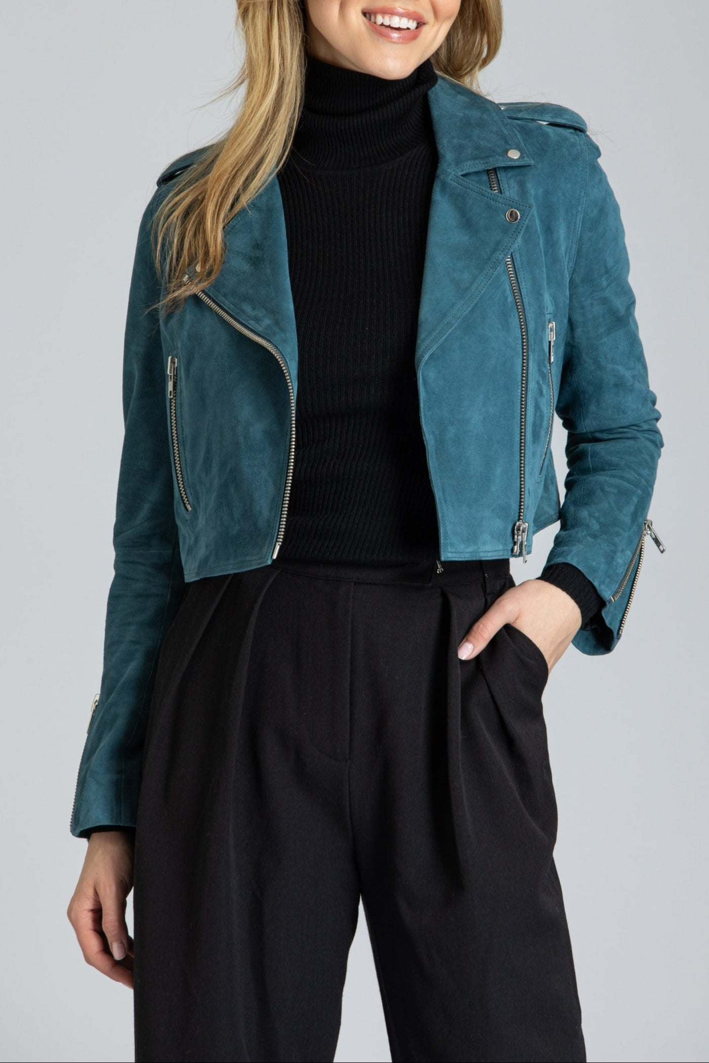 Chic and edgy, the Cropped Goat Suede Jacket with Zipper Detail is a modern must-have for any wardrobe. Crafted from luxurious goat suede, this jacket features sleek zipper accents that add a bold, contemporary touch. The cropped silhouette enhances versatility, making it perfect for layering over dresses, high-waisted jeans, or tailored trousers for a polished yet effortless look.