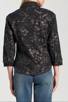 Give your outerwear an elegant twist with this sophisticated Patterned Denim Jacket, featuring a unique metallic-effect overlay on a rich dark background. This figure-flattering jacket combines the classic structure of denim with a refined three-quarter sleeve length enhanced by a trendy scrunch detail for a comfortable, stay-put fit. It includes traditional denim jacket elements like a collared neckline and flap pockets, making it a polished and distinctive layering piece that instantly elevates any casual or smart-casual outfit.