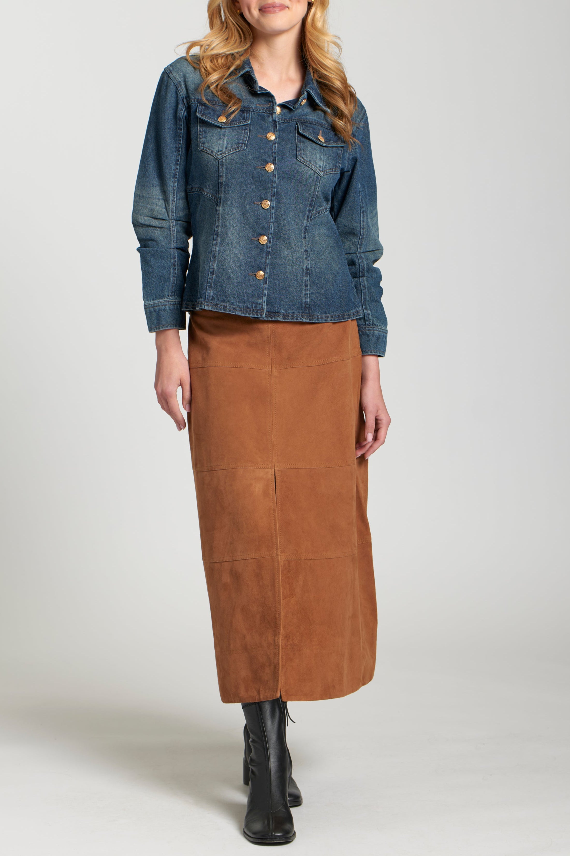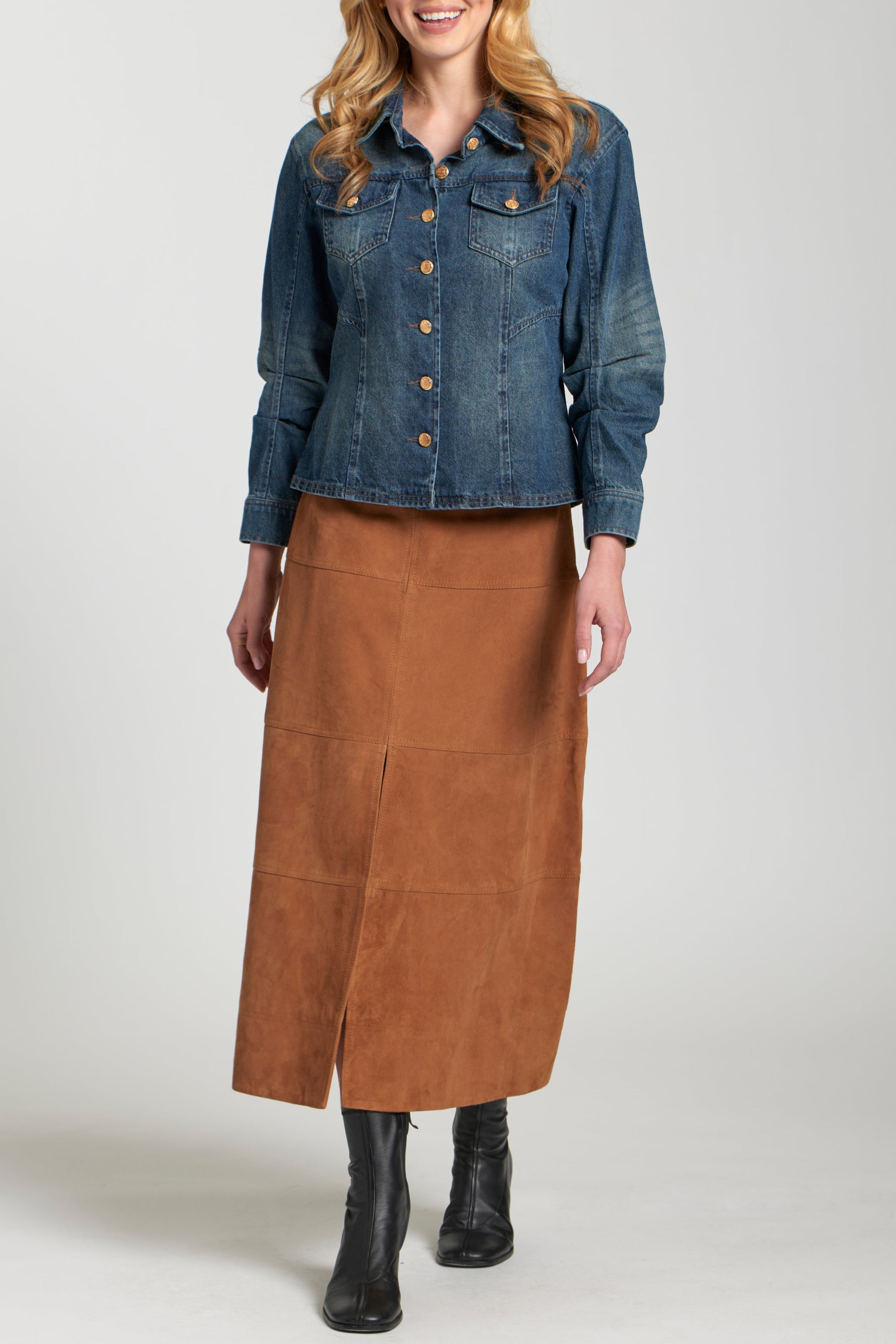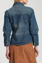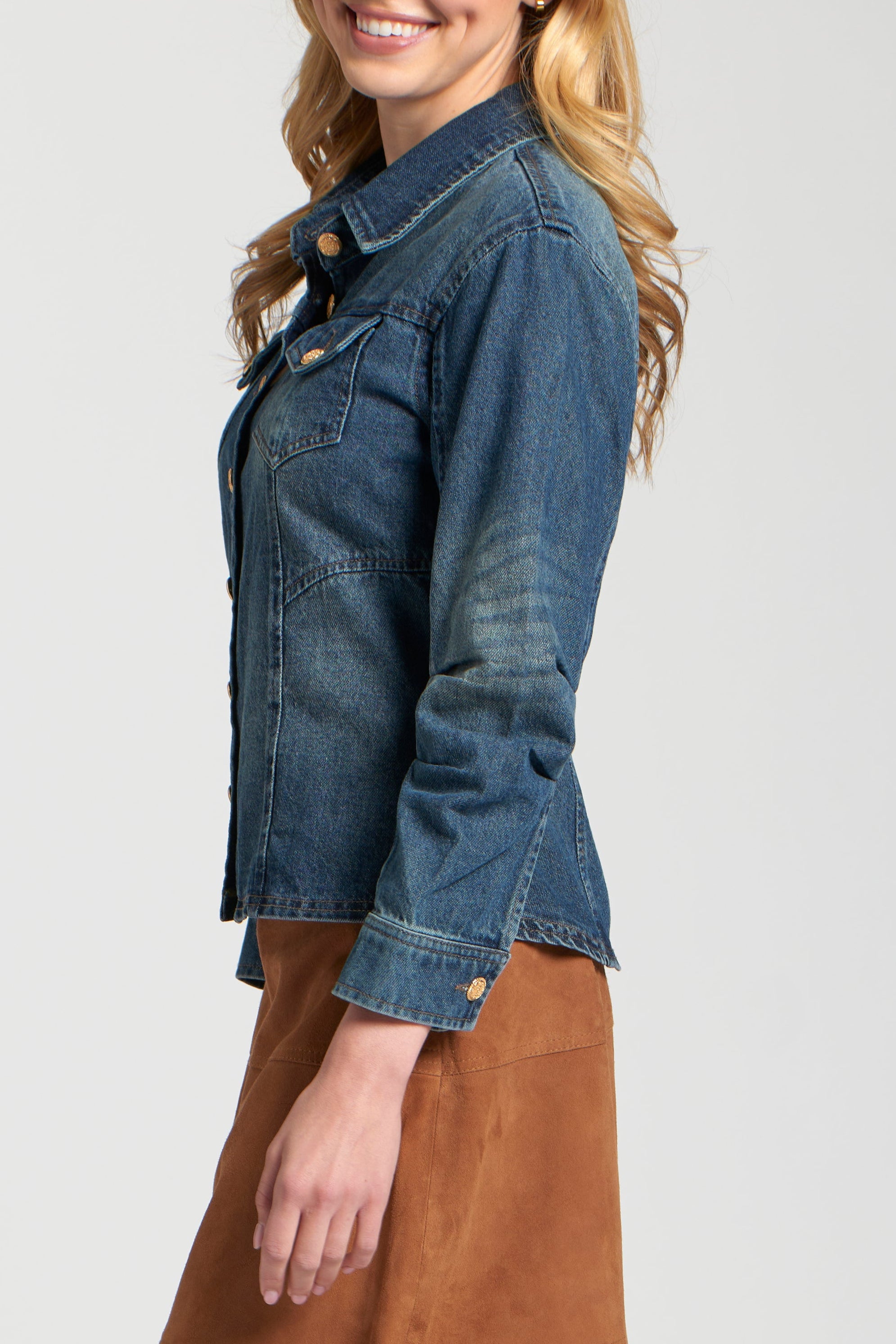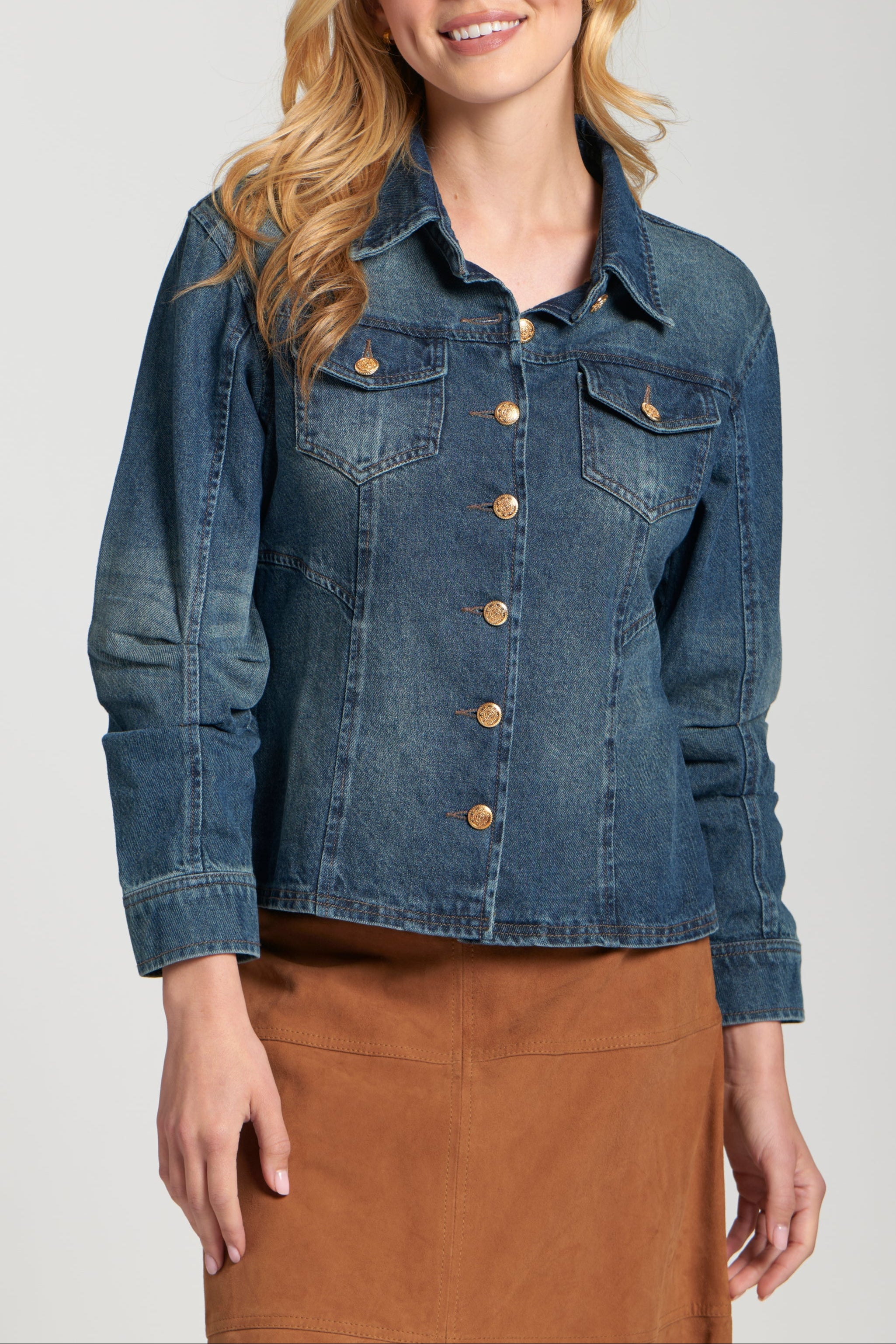 Layer up in timeless style with this classic Denim Jacket with Scrunched Sleeves. This versatile jacket features a traditional point collar, a full button-front closure with elegant gold-tone buttons, and functional chest flap pockets. The unique scrunch detailing on the long sleeves adds a touch of modern flair and comfort, making this medium-wash denim jacket a perfect and effortlessly chic addition to any casual ensemble.
