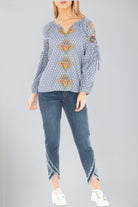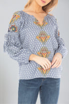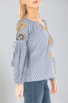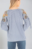 Add a touch of bohemian charm to your wardrobe with this Dobby Embroidery Top with Bishop Sleeves. Crafted from lightweight, textured fabric, it features intricate embroidery that enhances its artisanal appeal. The flowing bishop sleeves add a romantic, feminine touch, making it perfect for casual outings, brunch dates, or even workwear when paired with tailored pants. This versatile top combines comfort and elegance, offering a relaxed fit that’s flattering and easy to style. Pair it with jeans for a laid-back look or a skirt for a more polished ensemble.