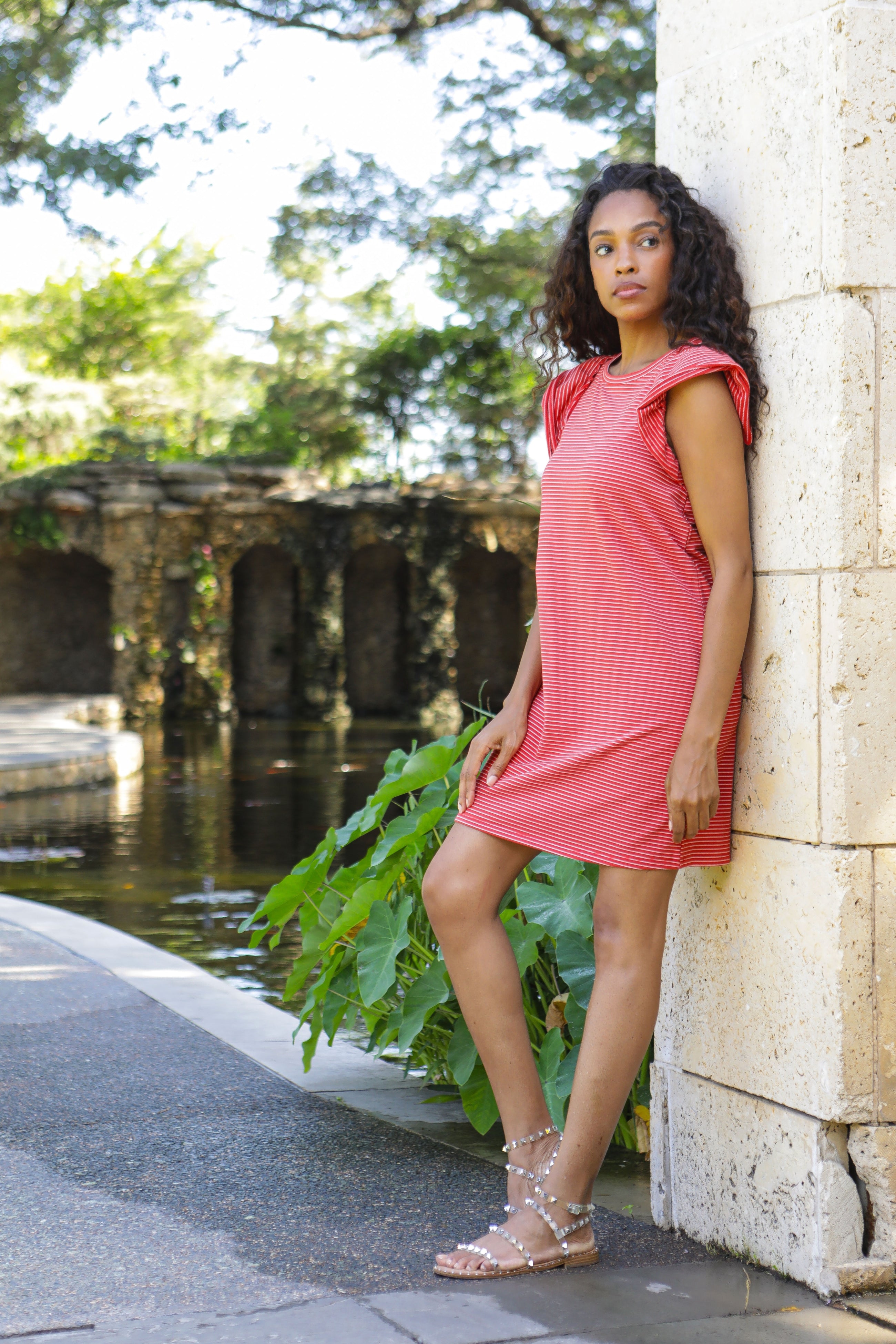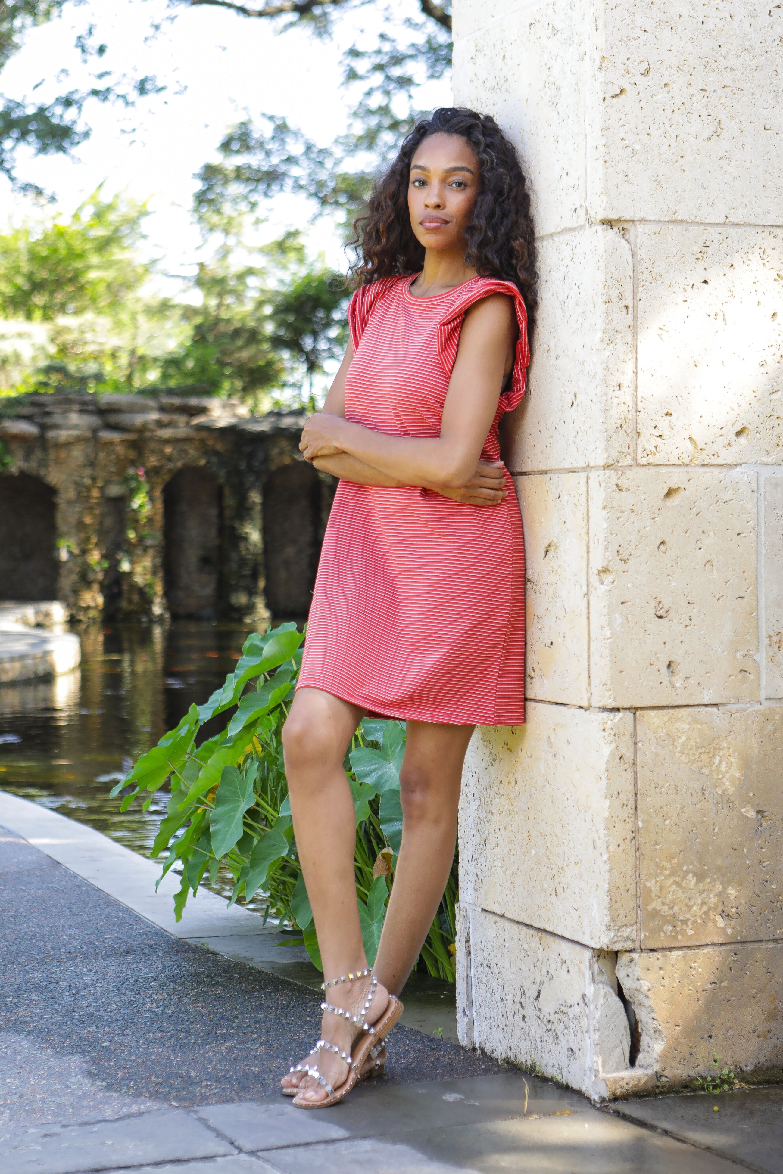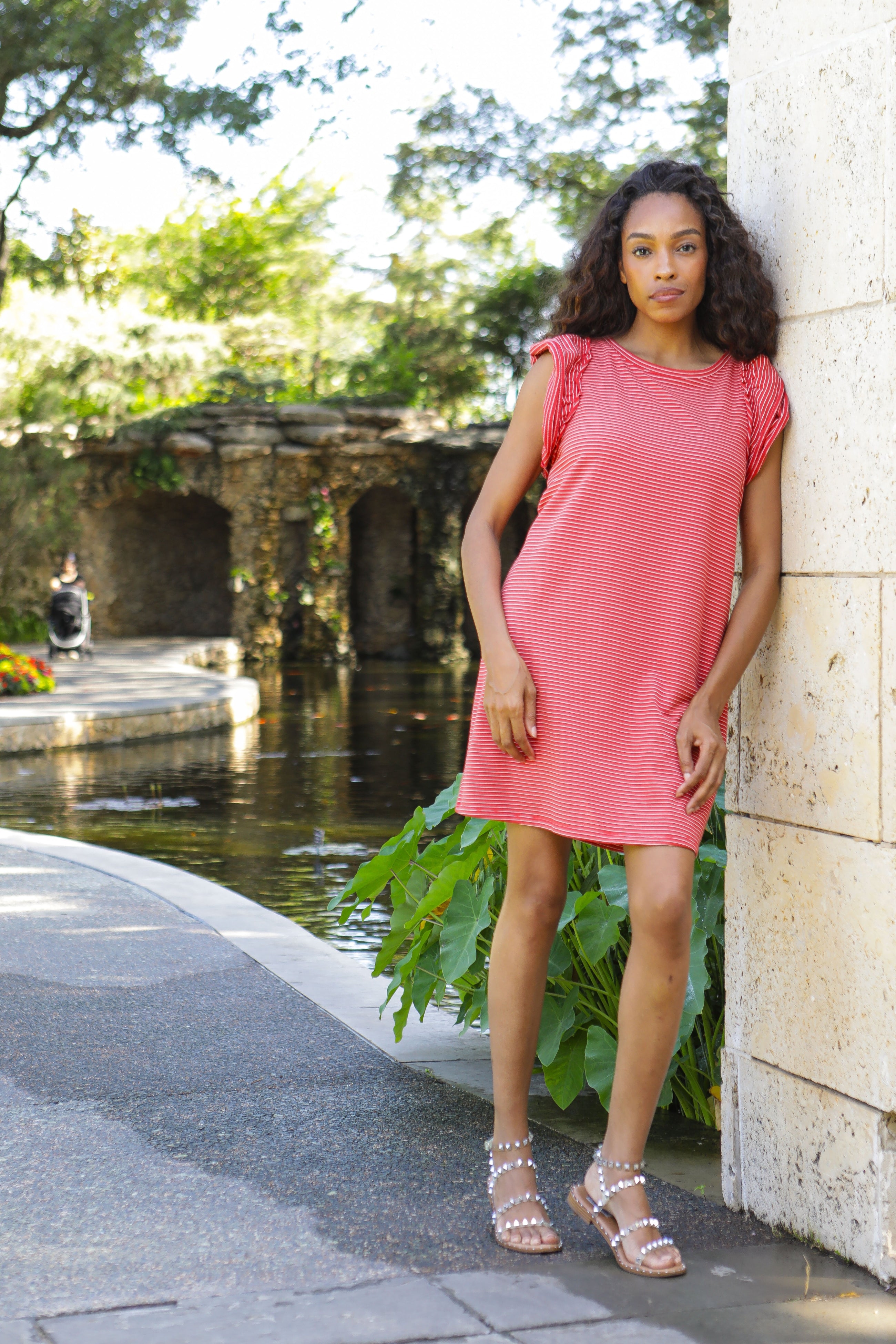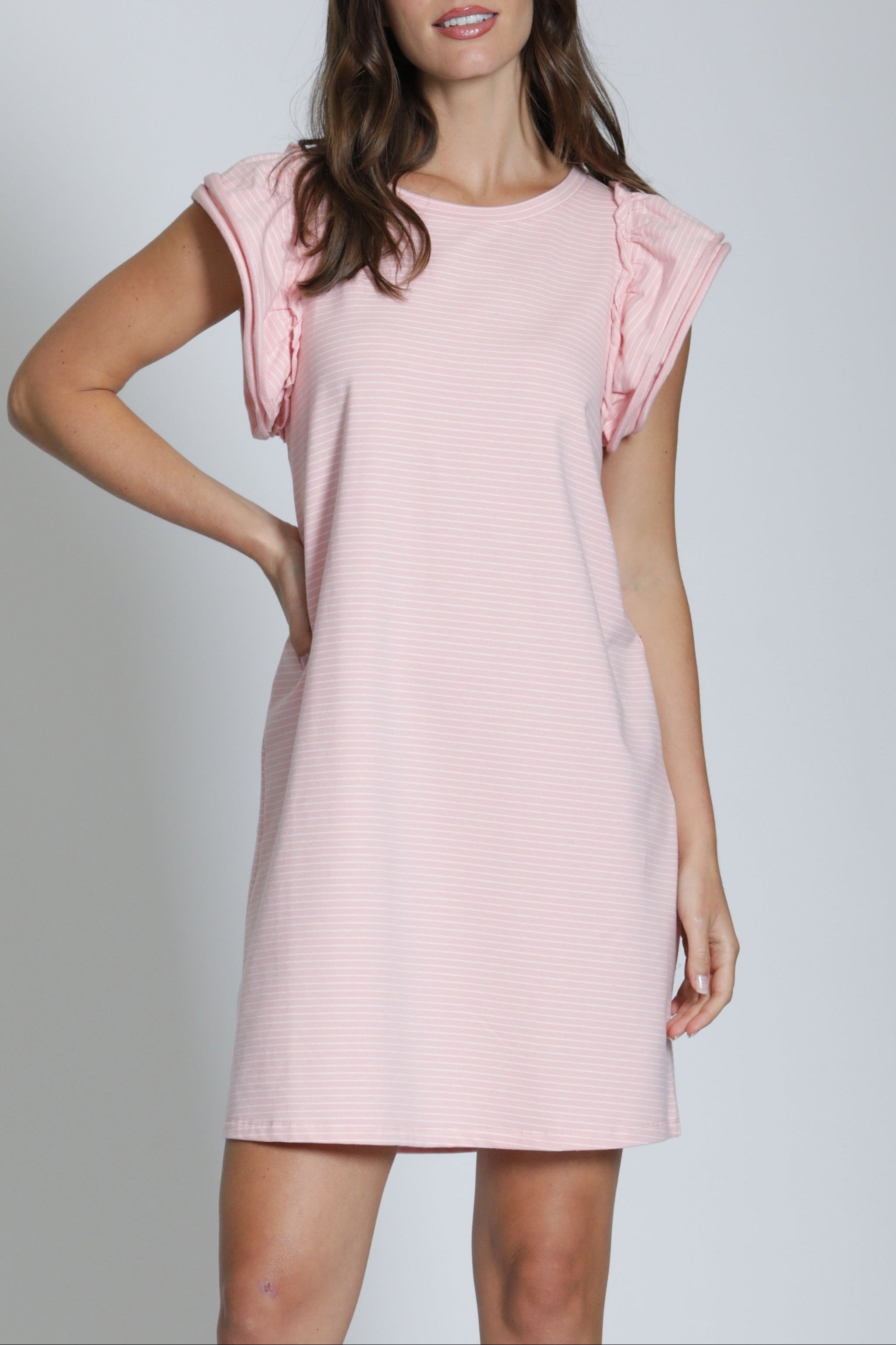 Keep it kicked back in a throw-on-and-go dress crafted in soft cotton and finished with a double flounce at the sleeves.