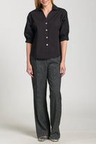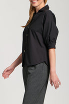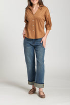 Elevate your casual wardrobe with this soft faux suede button-down blouse in a warm camel tone. Perfect for effortless style, this blouse combines a structured silhouette with relaxed elegance. The lightweight suede texture adds sophistication, while the puffed elbow-length sleeves and curved hemline lend a touch of femininity. Ideal for pairing with denim or tailored trousers for a polished, everyday look.