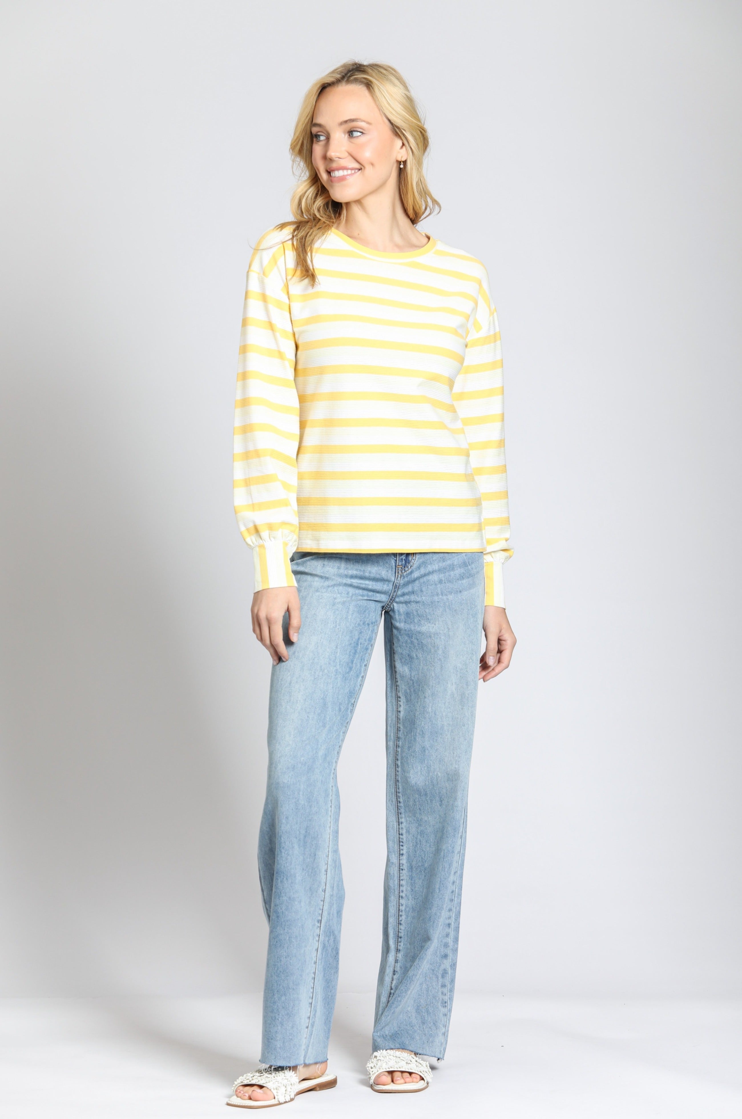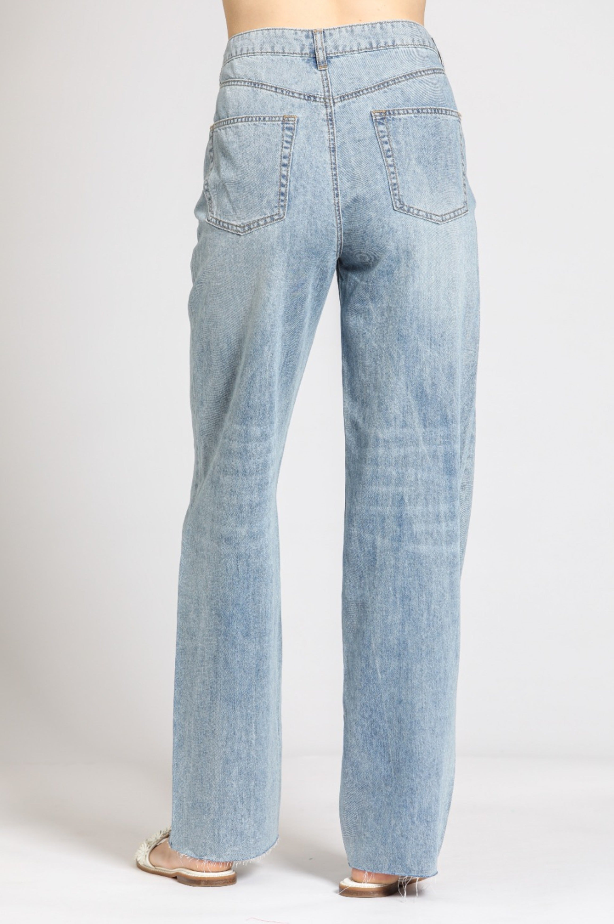 These high-waisted, wide-leg jeans feature a light indigo wash with a relaxed fit for effortless style. Designed with a classic five-pocket construction and subtle seam details, they offer a vintage-inspired yet modern look. Perfect for casual or dressed-up styling!