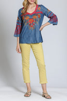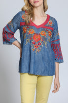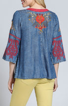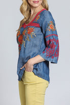 This boho-inspired denim top features vibrant floral embroidery with striking red and orange hues. The V-neckline and three-quarter sleeves with intricate lace accents add a touch of elegance. Perfect for a casual yet stylish look.