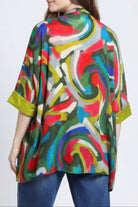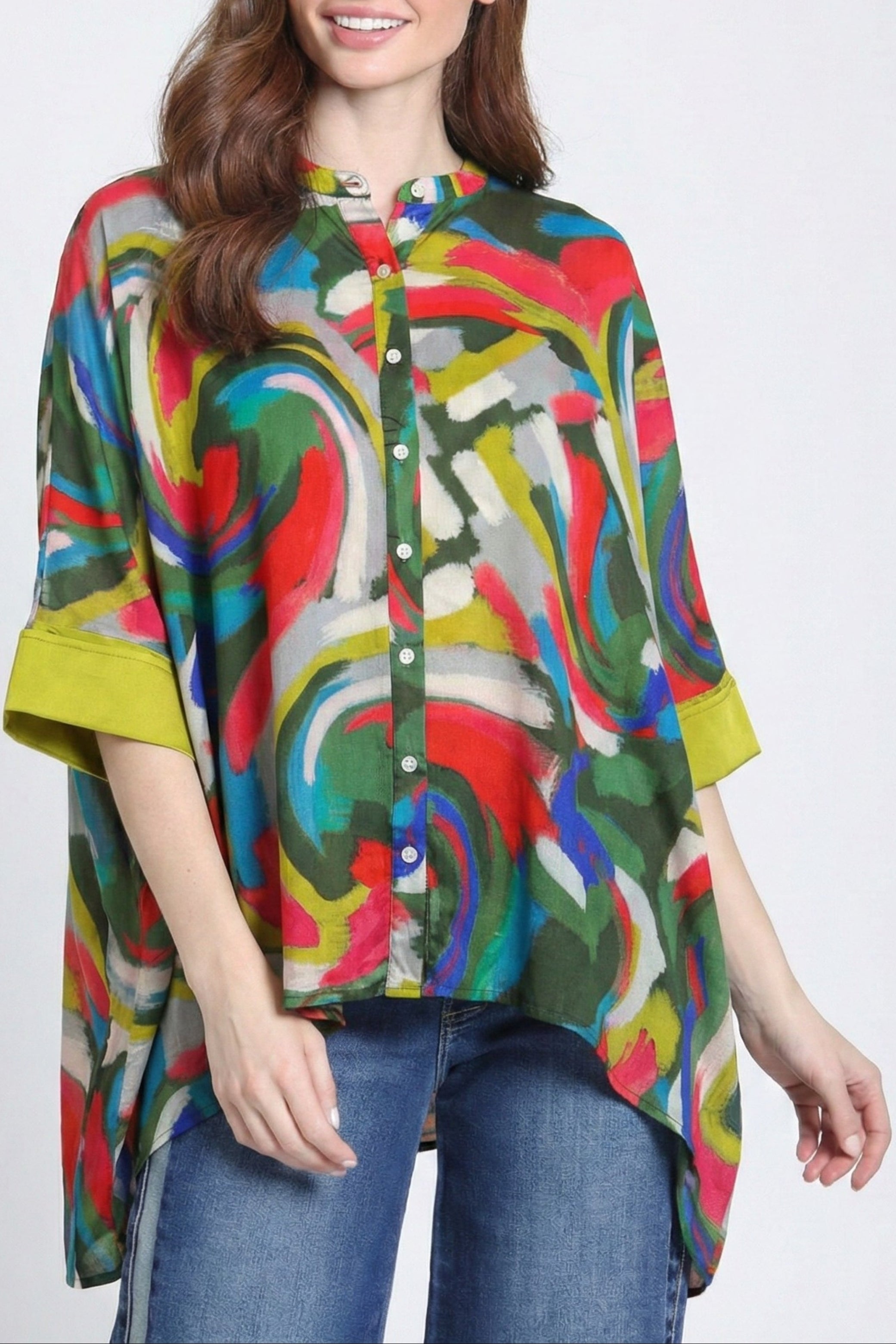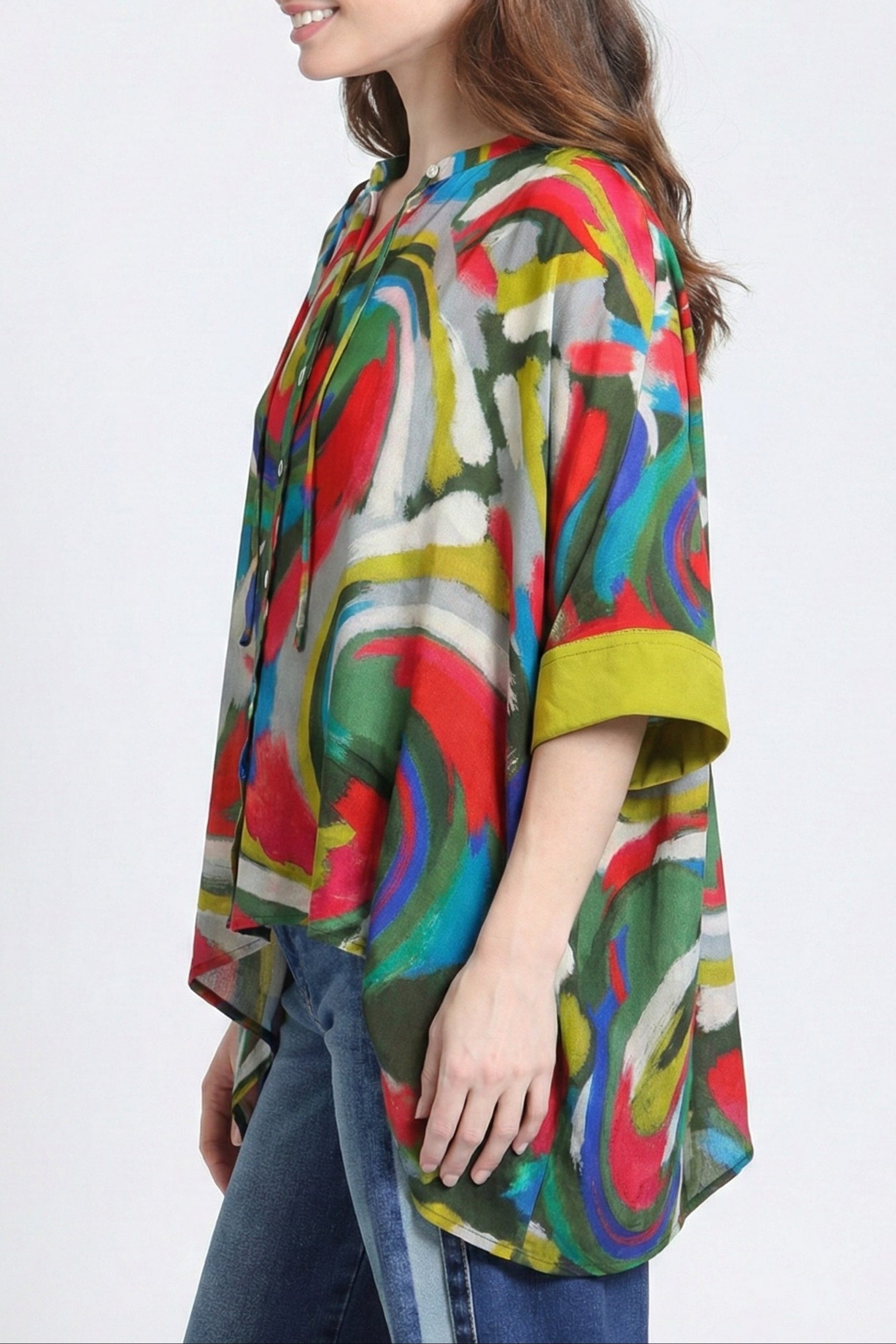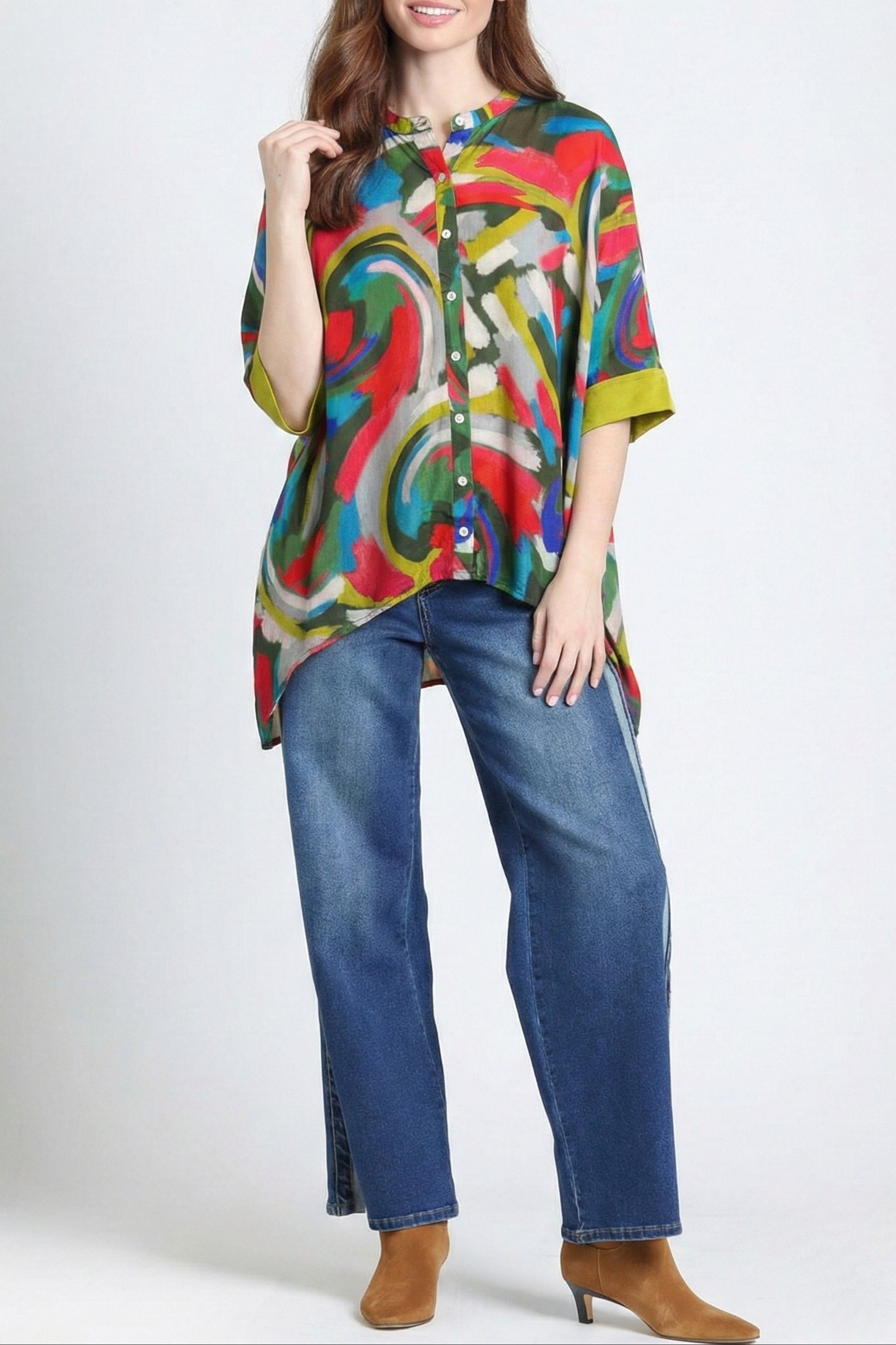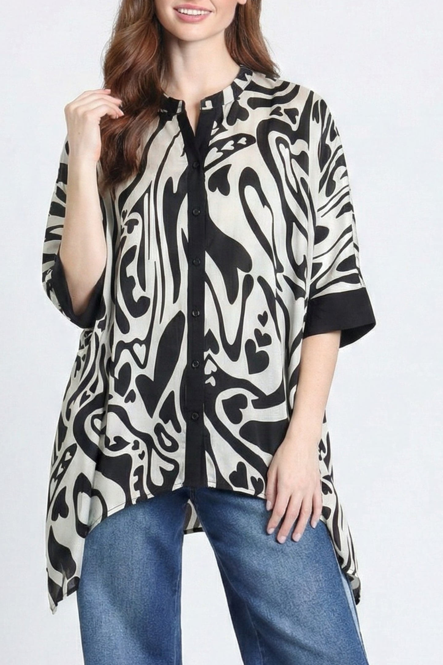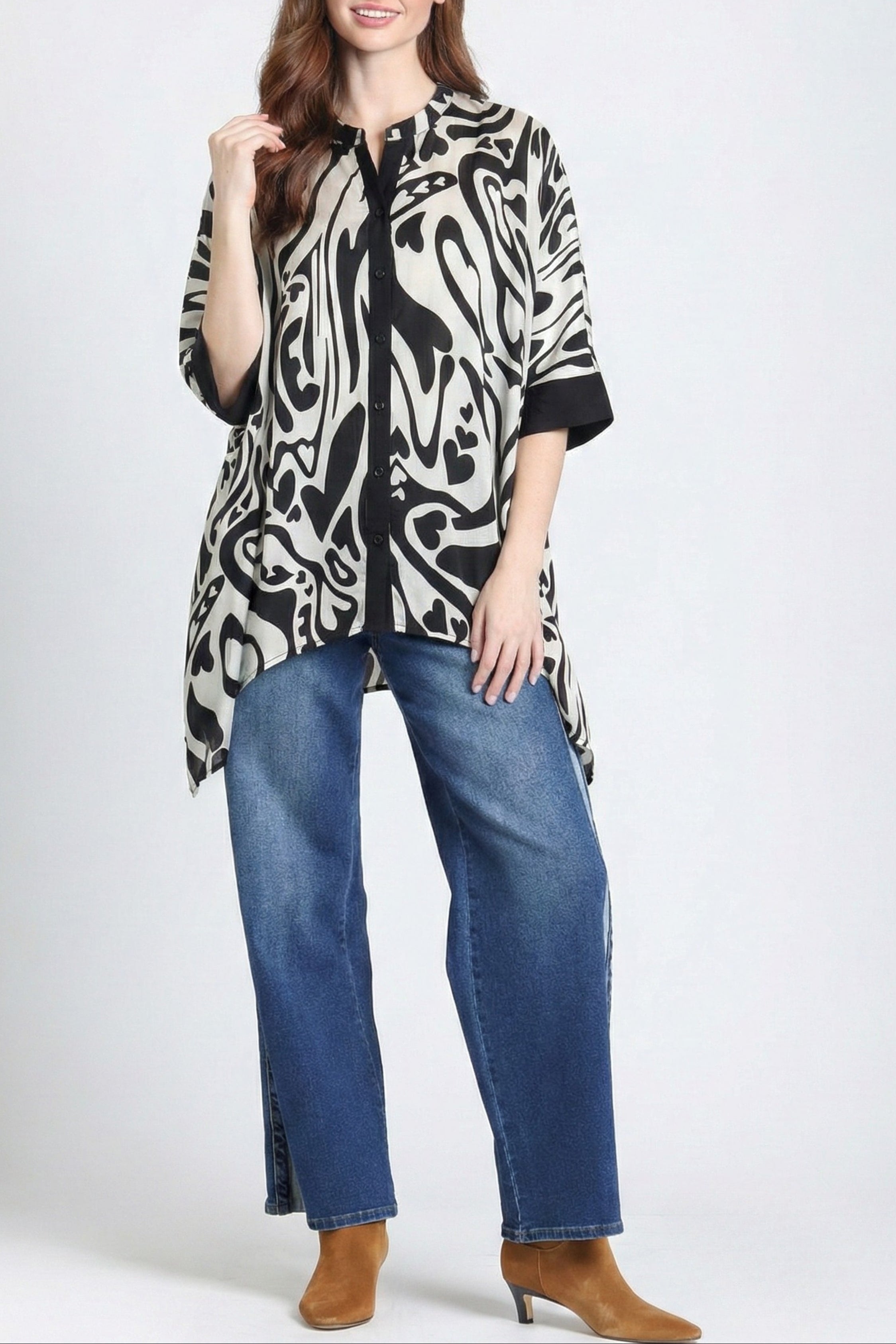 A swirling heart pattern makes a stunning statement on this light and airy tunic that buttons up the front.