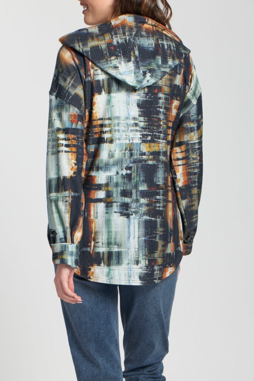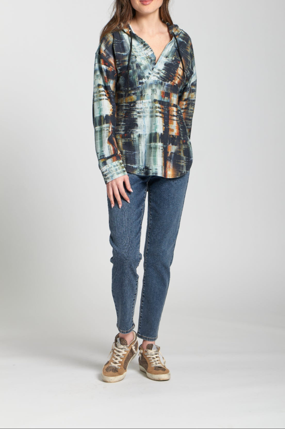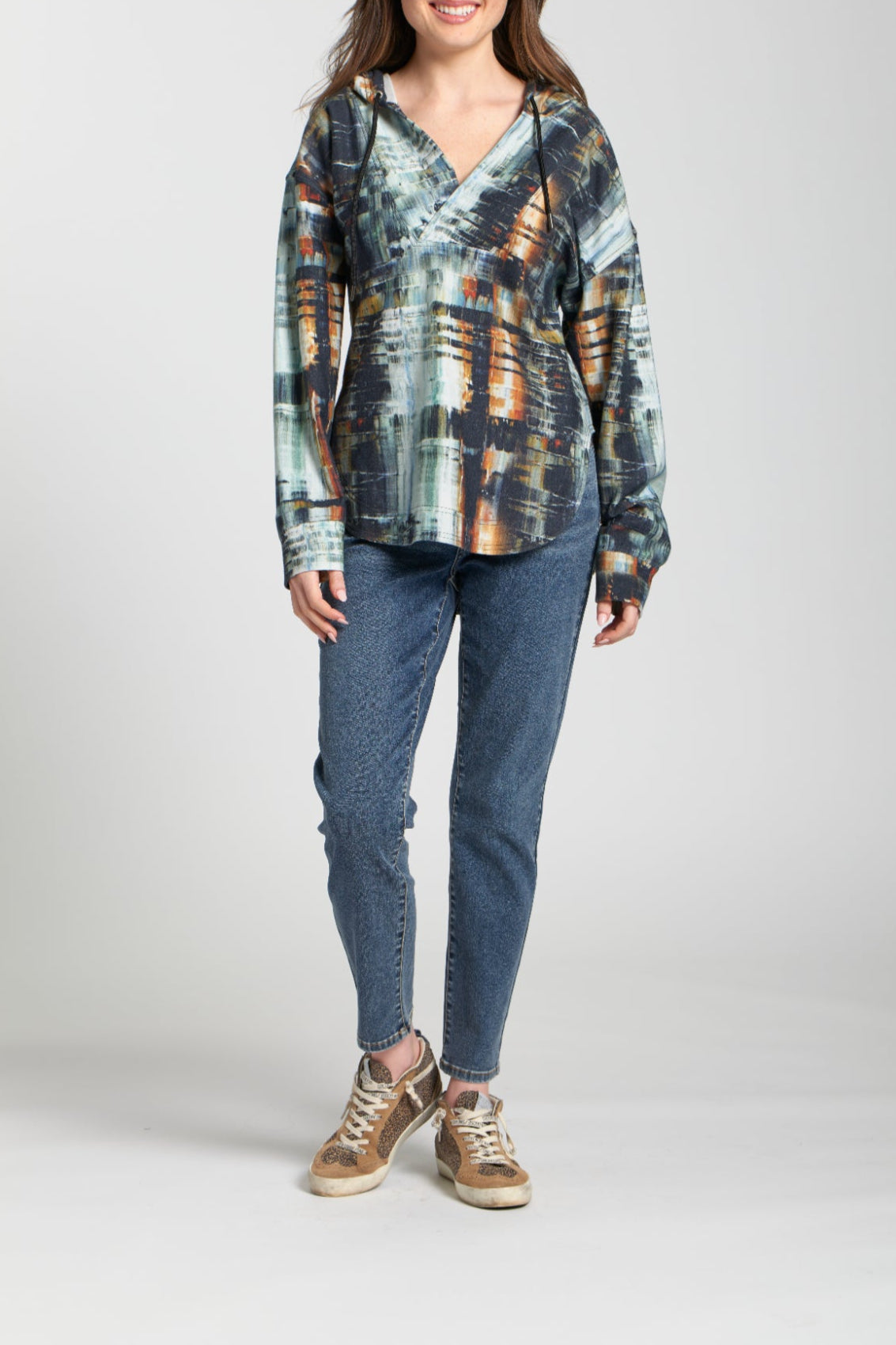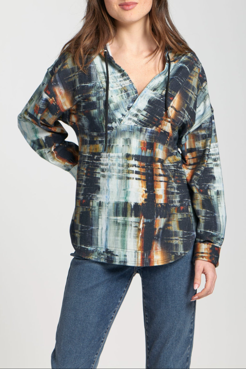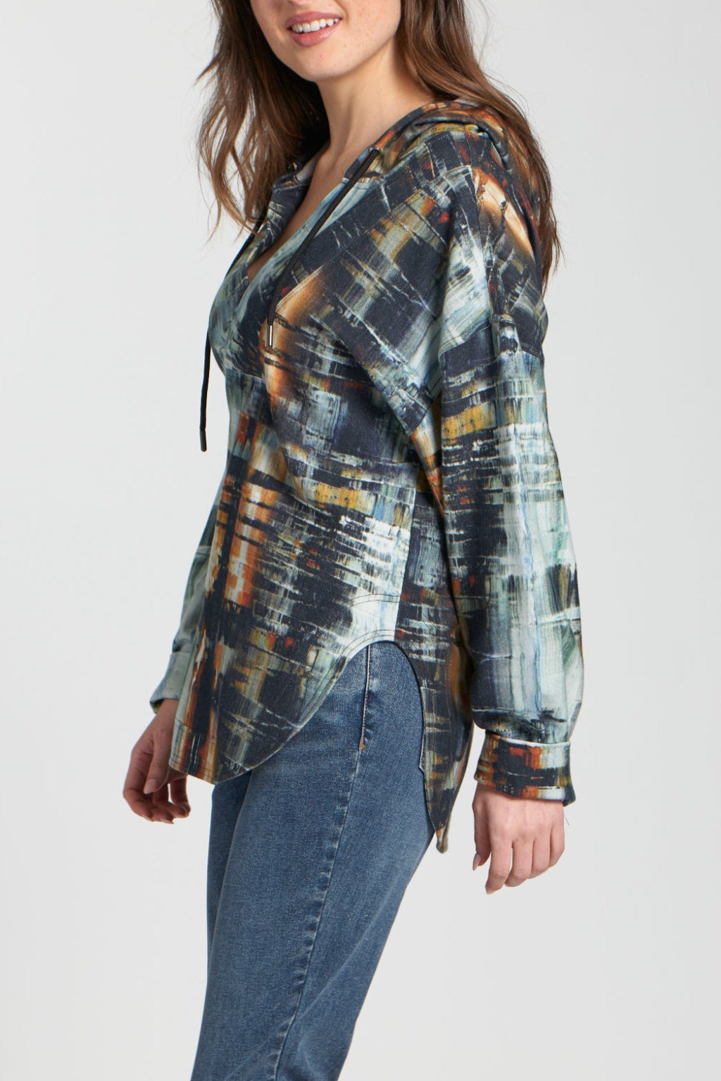 Add an artistic touch to your casual wardrobe with this unique printed tunic. Crafted from lightweight woven rayon fabric, it offers a soft drape and breathable comfort. Featuring a pull-over style with no closure, it has long sleeves with buttoned cuffs for a refined finish. The neckline is a V-neck with an attached hood and adjustable drawstring ties, lending a laid-back, sporty vibe. Designed with a rounded high-low hemline for a flattering silhouette. No pockets to maintain a sleek and minimal appearance.