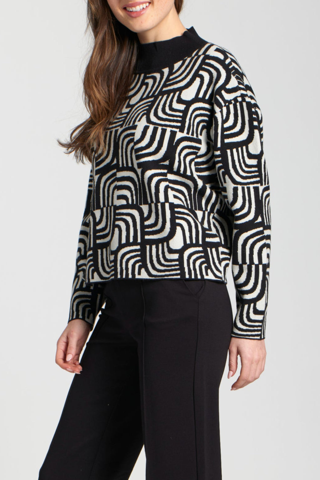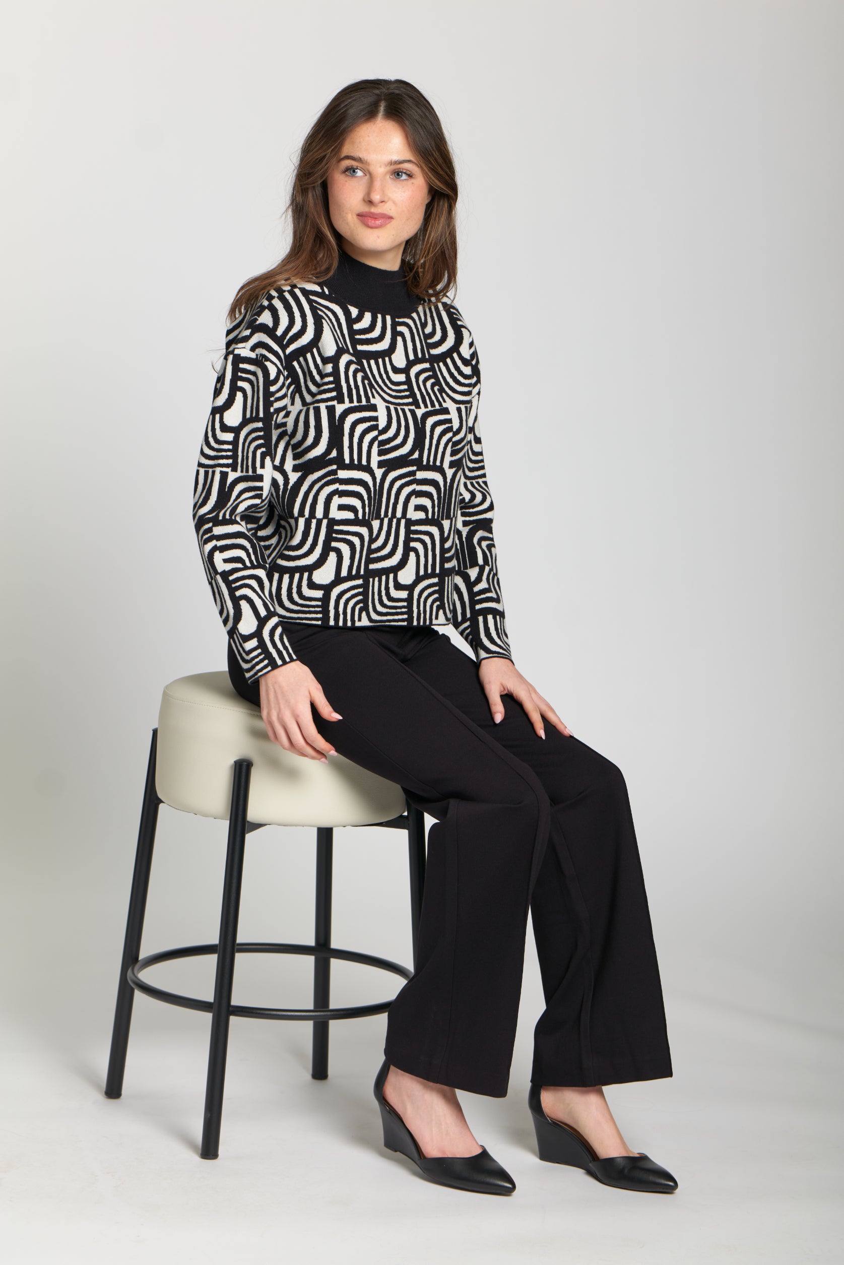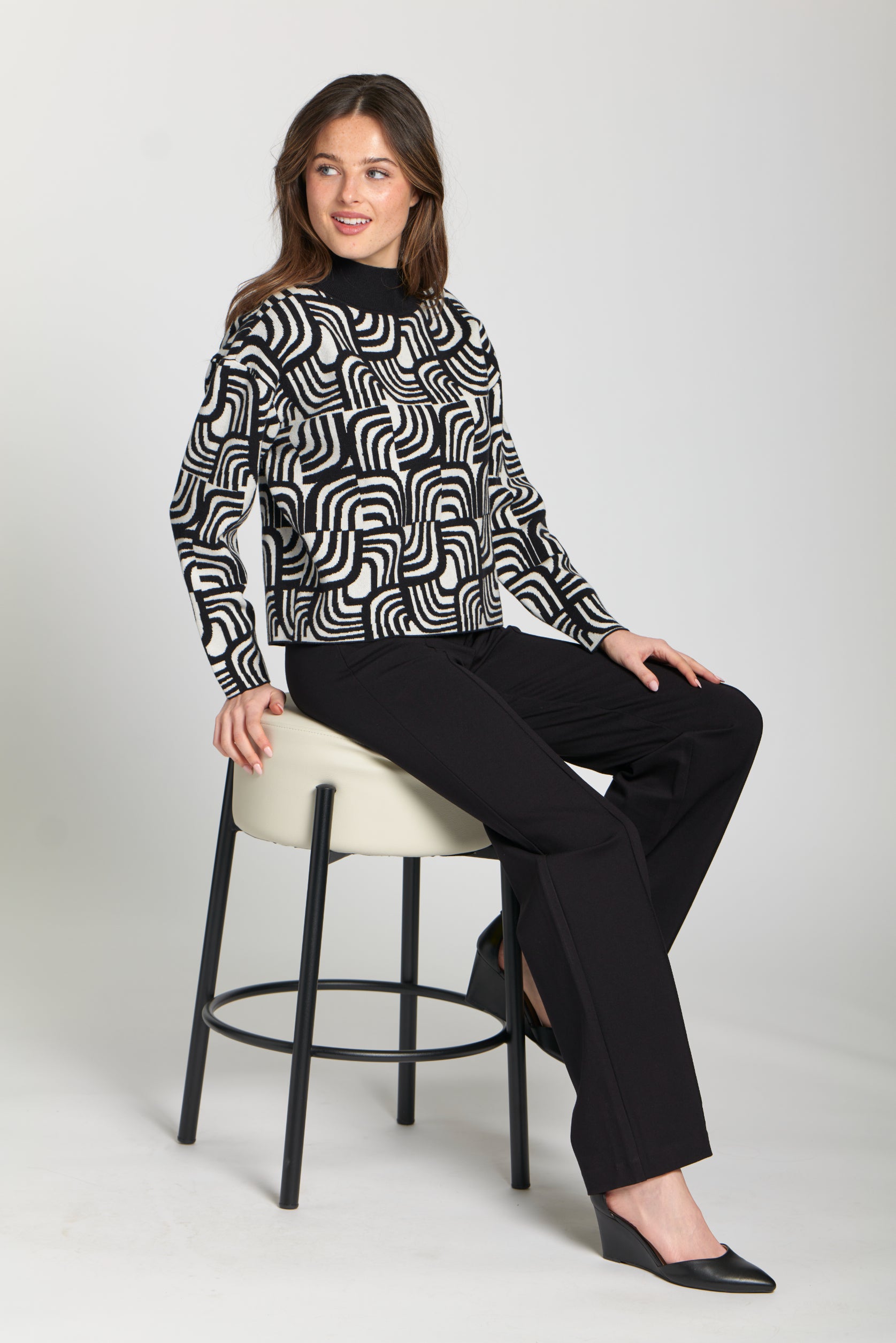 Embrace bold style with this sophisticated Interlocking Curves Jacquard Sweater. This striking piece features a captivating black and white geometric pattern that's sure to turn heads. Crafted from a comfortable jacquard knit, this pullover includes a classic mock neck and a relaxed fit, making it an effortlessly chic option for both the office and elevated casual occasions. Its versatile monochrome design pairs perfectly with everything from tailored trousers, like those pictured, to your favorite denim.