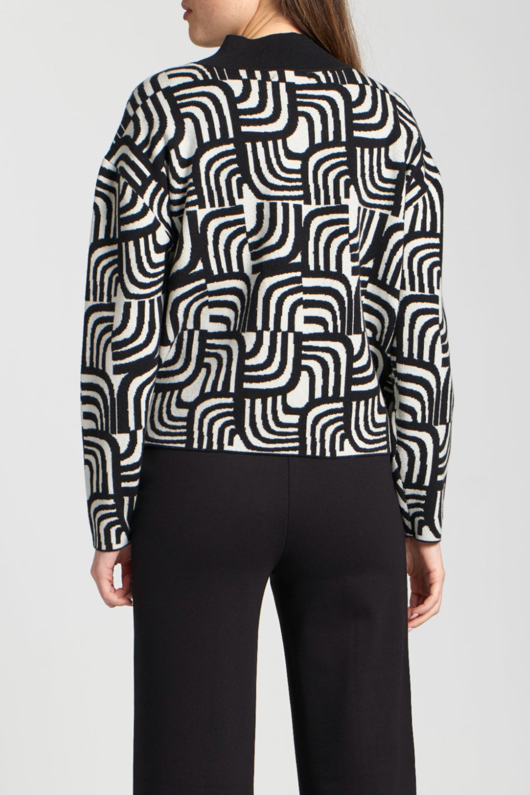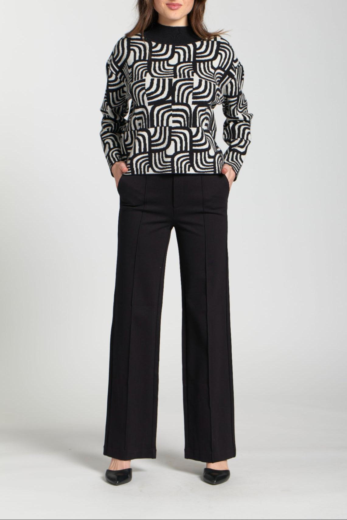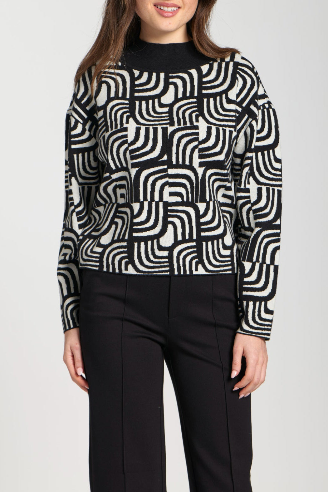 Embrace bold style with this sophisticated Interlocking Curves Jacquard Sweater. This striking piece features a captivating black and white geometric pattern that's sure to turn heads. Crafted from a comfortable jacquard knit, this pullover includes a classic mock neck and a relaxed fit, making it an effortlessly chic option for both the office and elevated casual occasions. Its versatile monochrome design pairs perfectly with everything from tailored trousers, like those pictured, to your favorite denim.