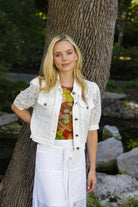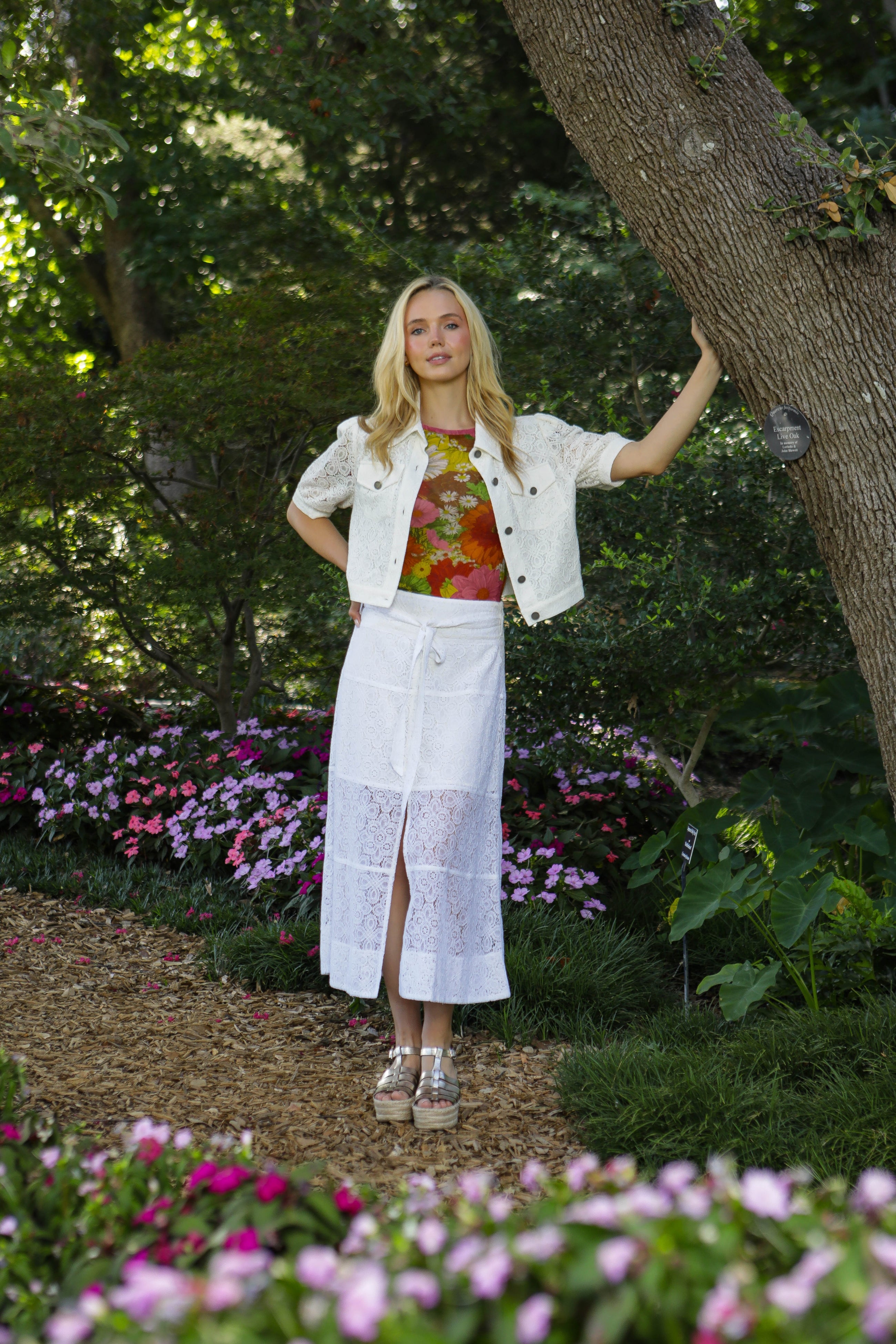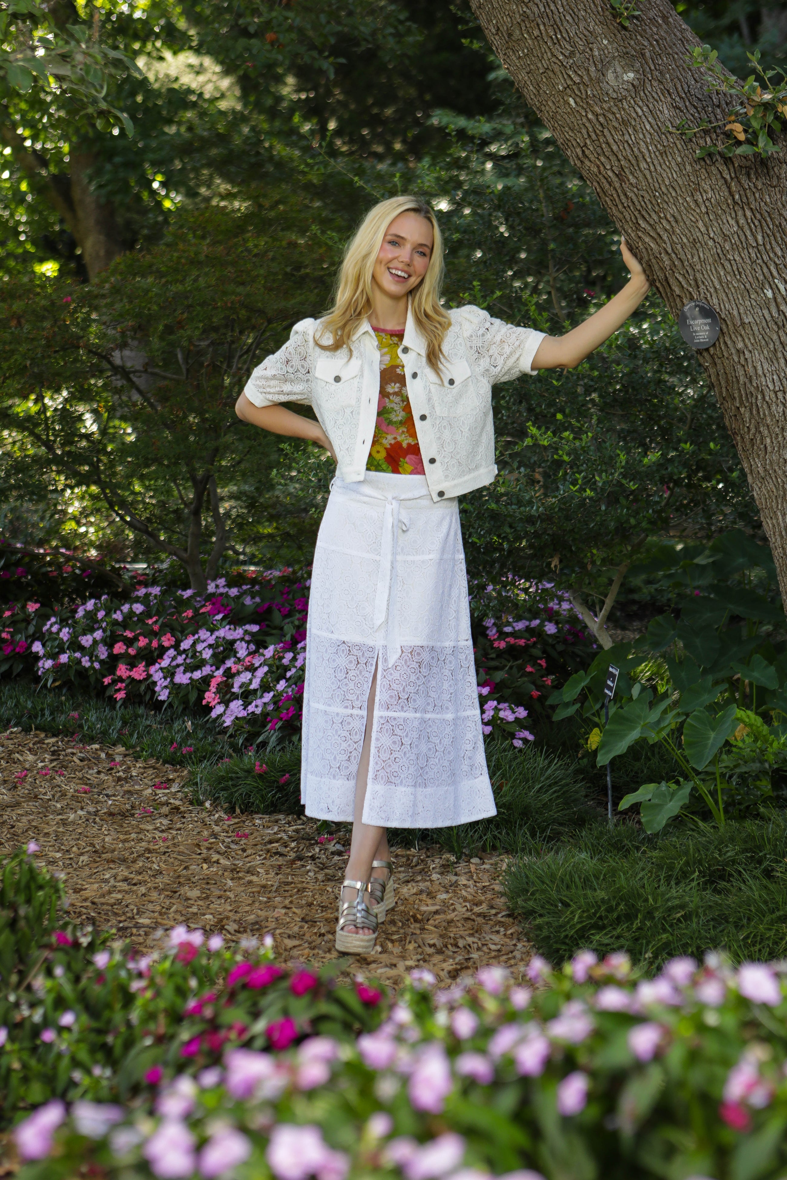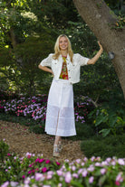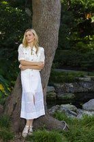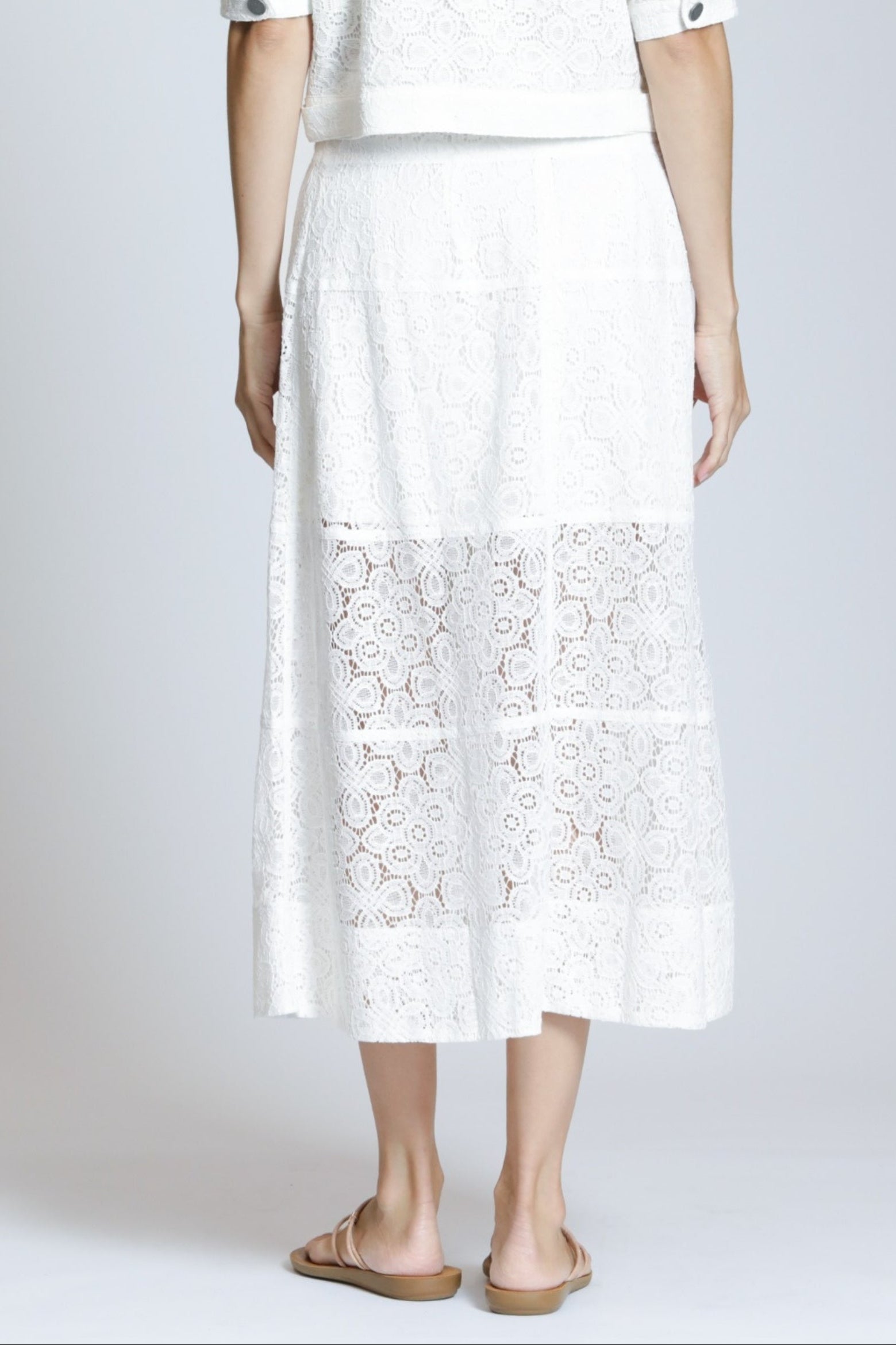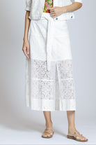 This elegant midi skirt is crafted from a delicate white lace overlay with an intricate floral pattern, featuring a flattering high-waisted pencil silhouette; the design maintains a structured shape and falls to a versatile midi length, while the combination of the luxurious texture and clean design makes it a beautiful and sophisticated piece for both casual and semi-dressy occasions.