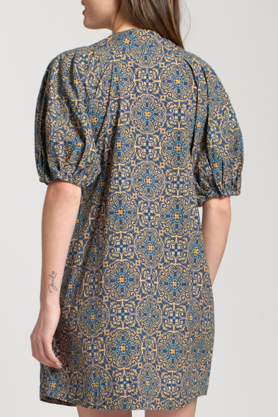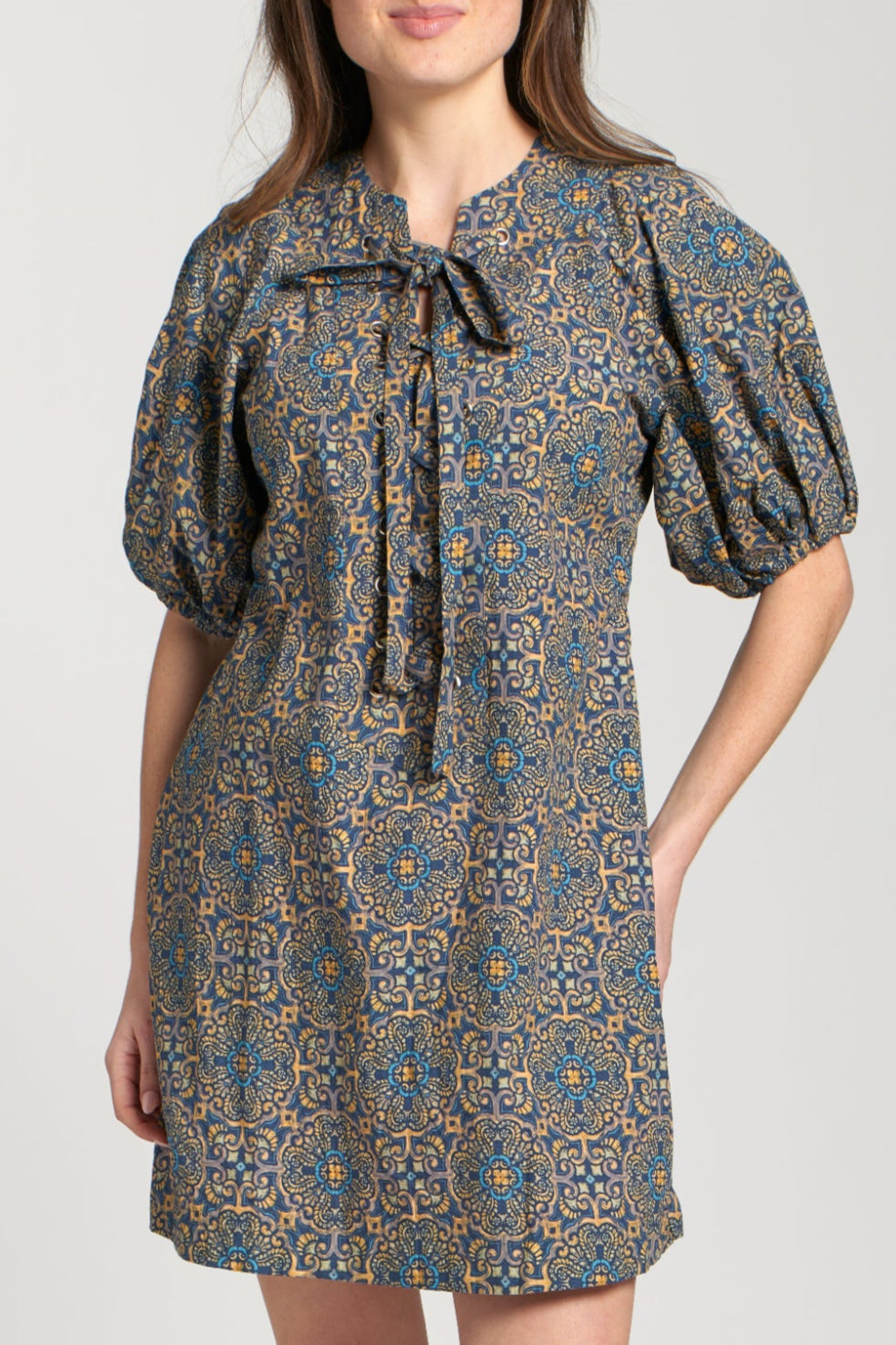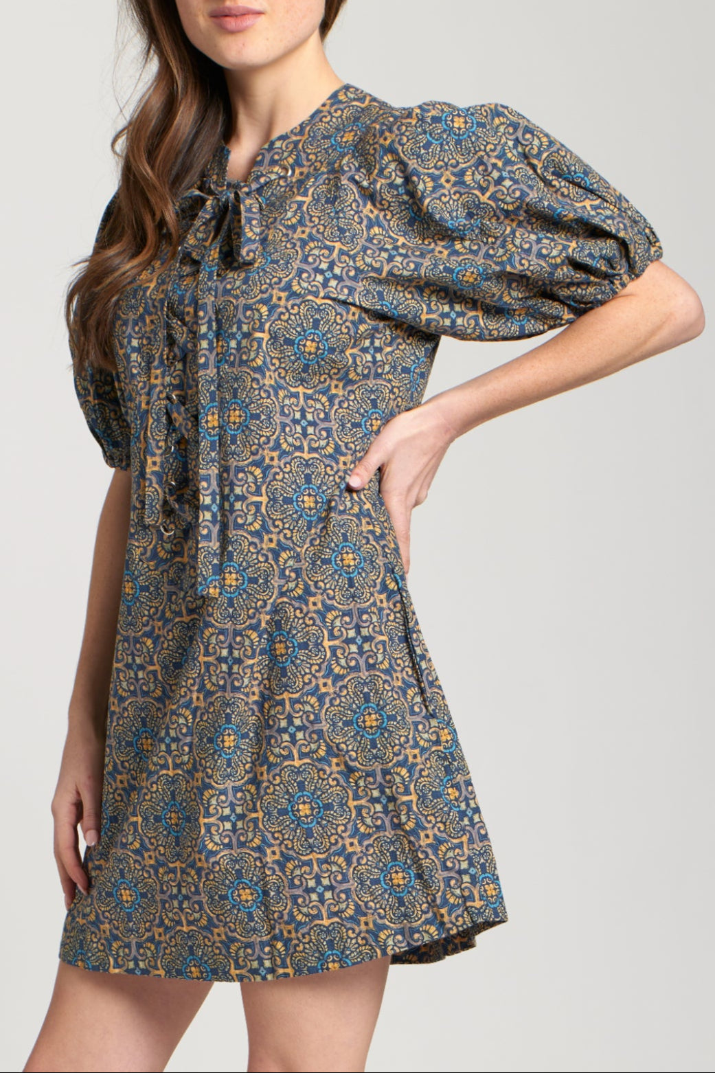 Elevate your style with this Laced Up Puffed Sleeve Dress. This unique mini-dress features a beautiful all-over pattern with a mix of blue, yellow, and brown tones. The high neckline adds a touch of sophistication, while the puffed short sleeves give it a playful, stylish silhouette.The laced-up front detail and tie-up bow offer a customizable fit and a charming, feminine touch. Perfect for a casual brunch or a weekend outing, this dress is an easy way to make a statement.