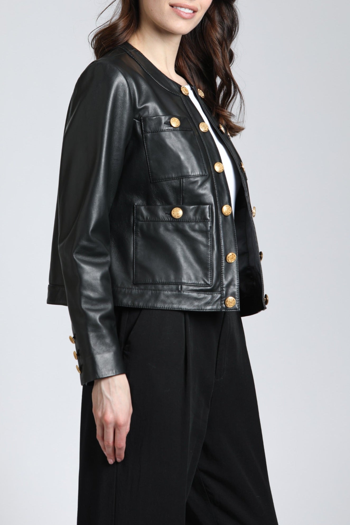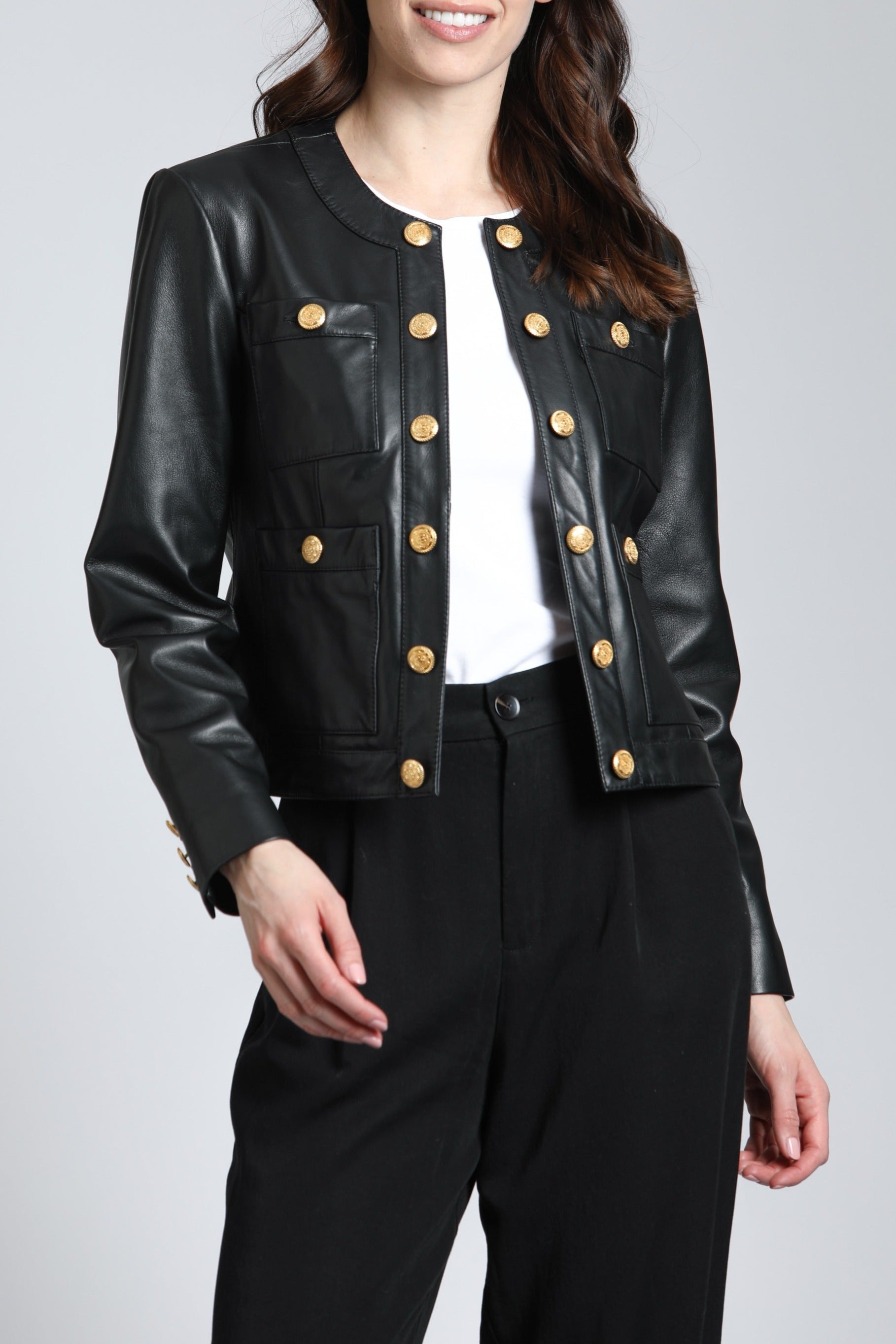 Sophisticated and timeless, the Lamb Leather Jacket with Gold Buttons blends luxe craftsmanship with refined elegance. Crafted from premium lamb leather, this jacket features a sleek, tailored fit accented by gleaming gold buttons for a touch of glamour. Whether dressed up or down, it’s the perfect statement piece to elevate any outfit with effortless style.