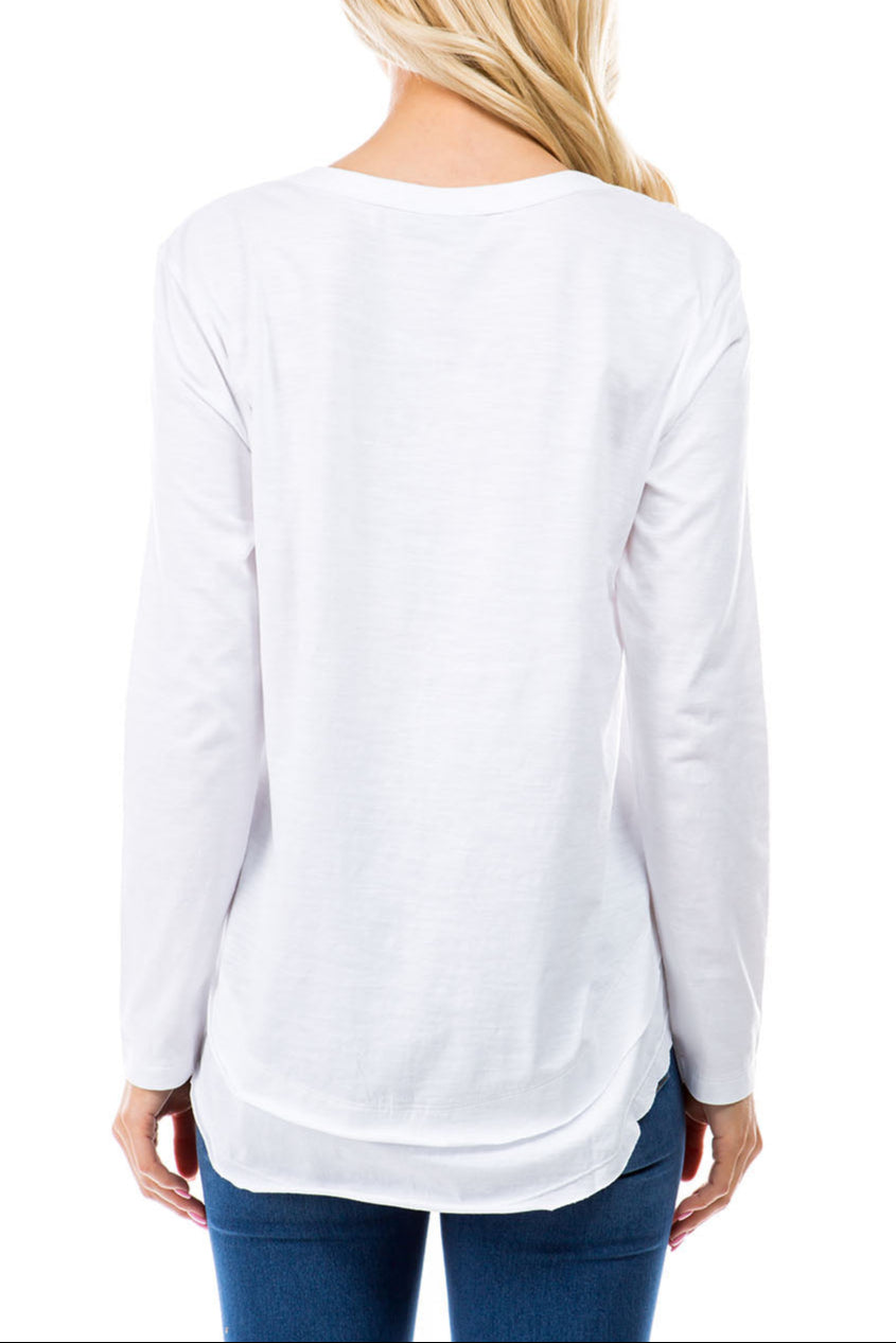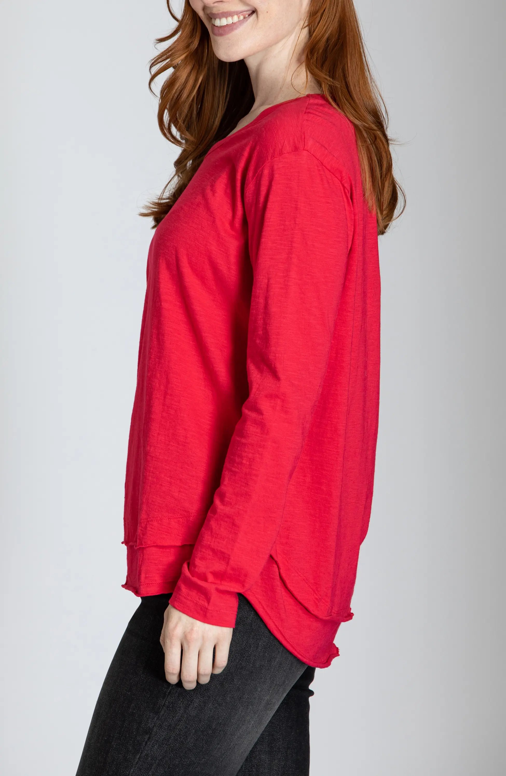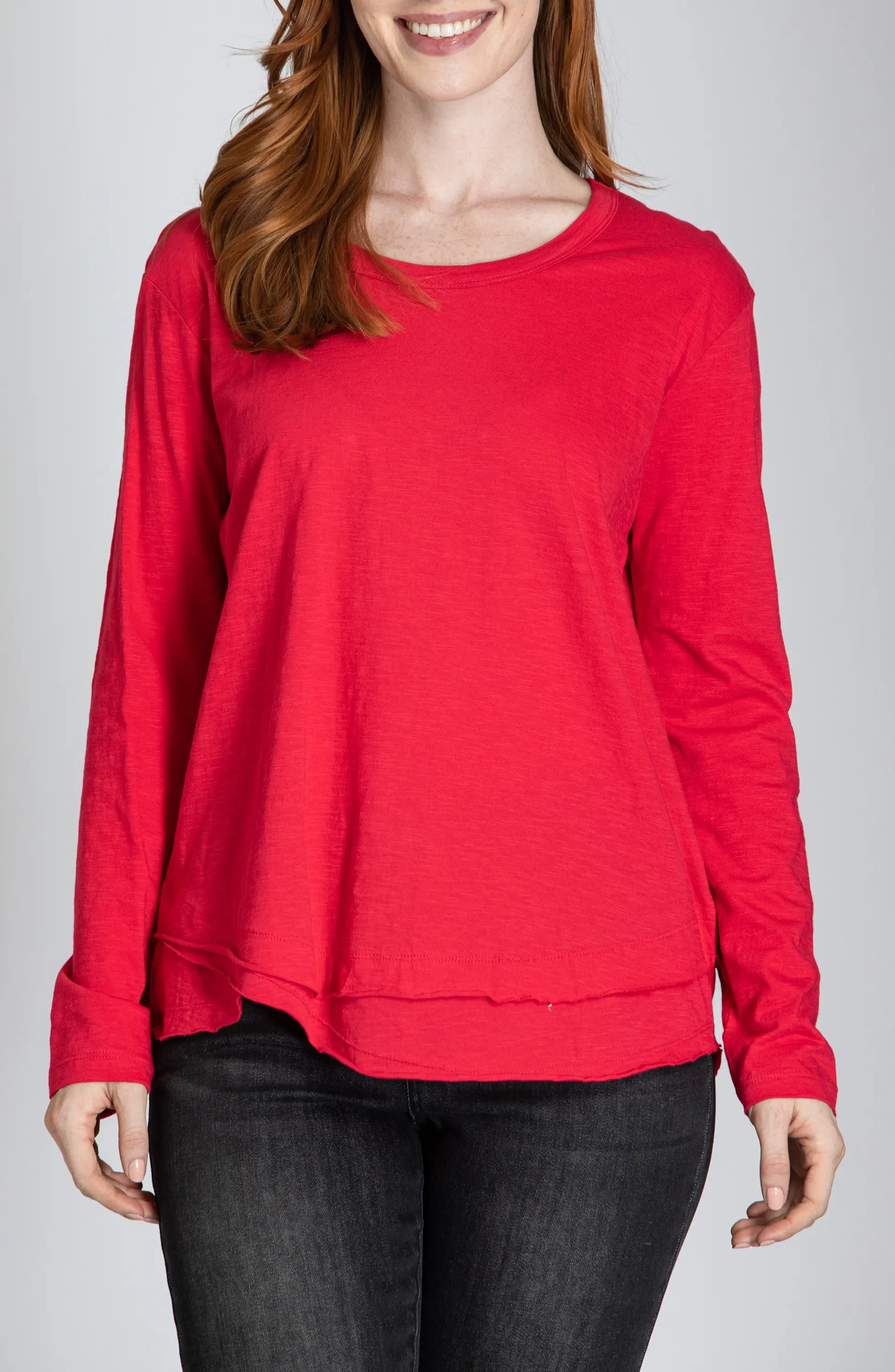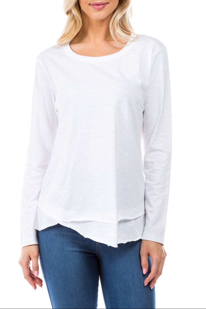 The gorgeous fit and on-trend design of our Long Sleeve Scoop Neck Tee is perfect for everything from sweet date nights to outdoor parties. The elegant construction, double layered asymmetrical hemline and ultra-soft fabrication add a chic touch to any look. This better-than-basic blouse pairs well with everything from denims to leggings.