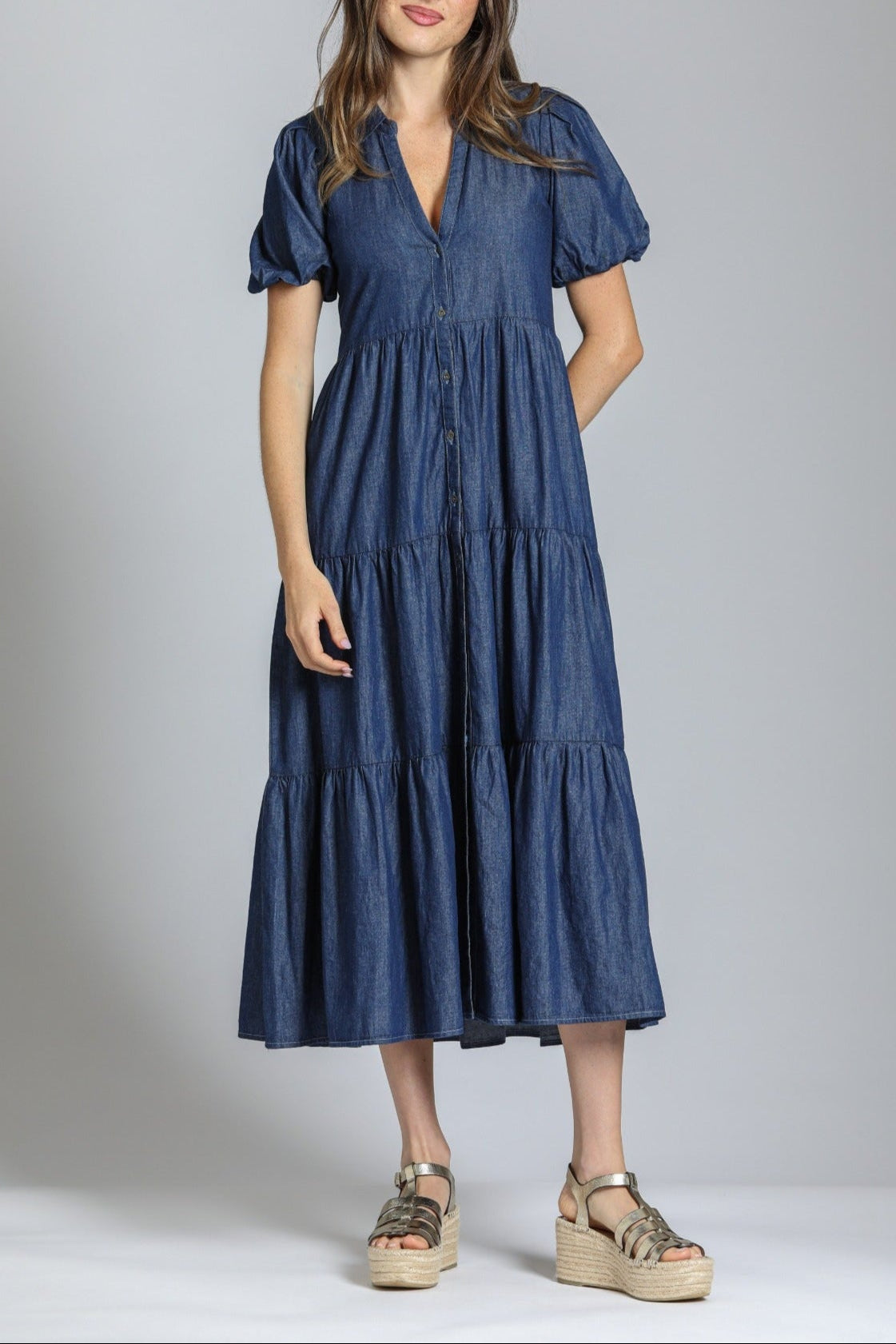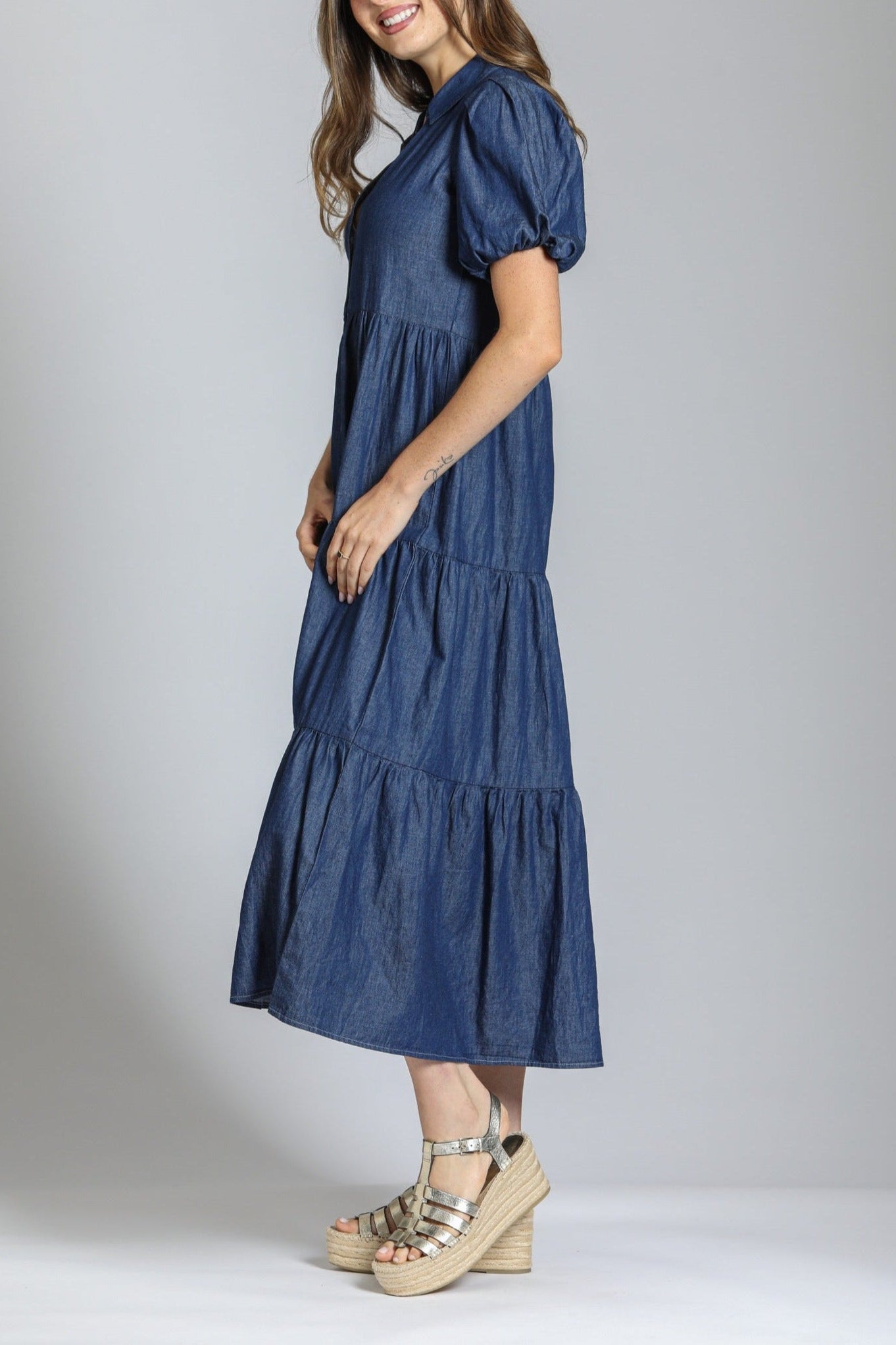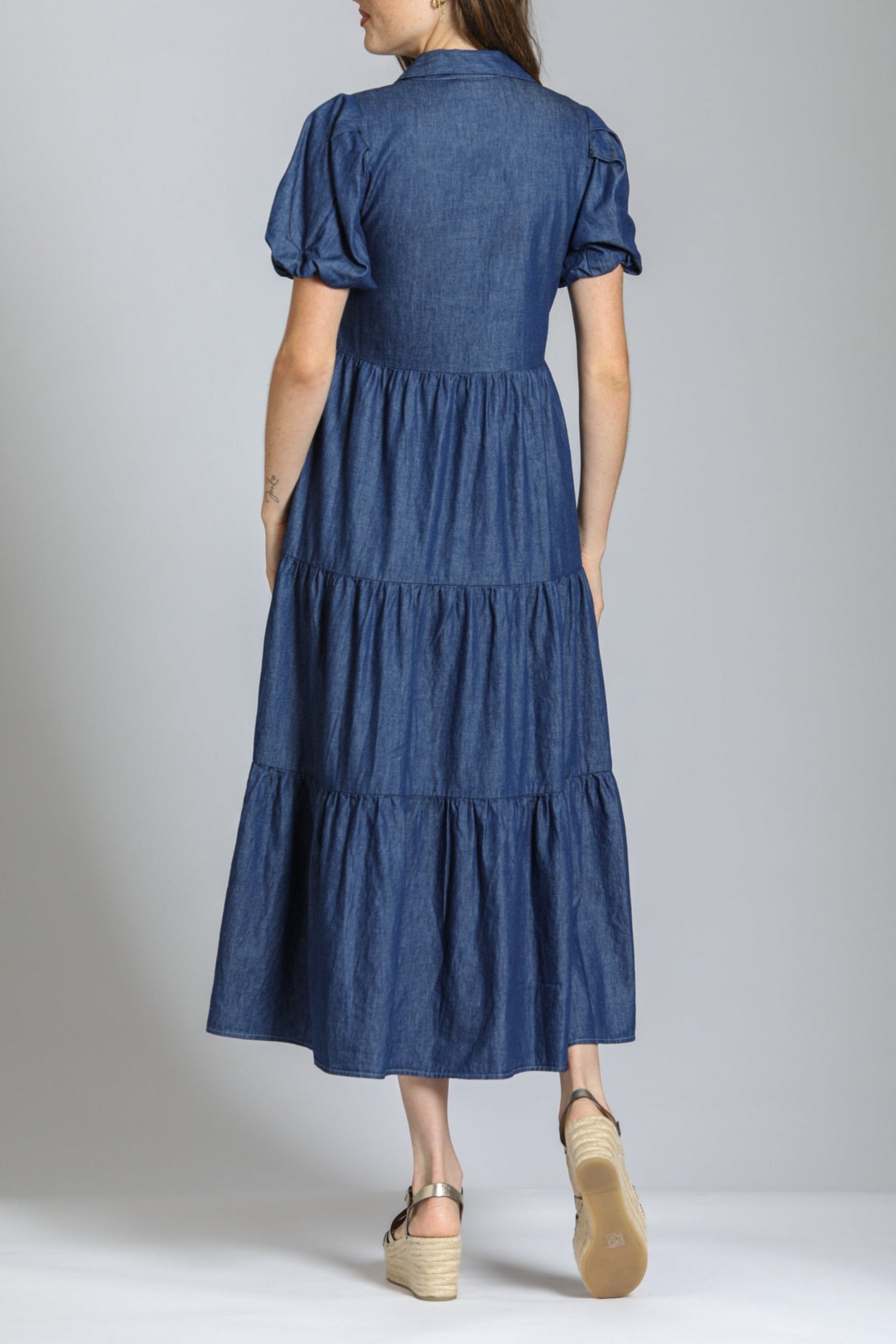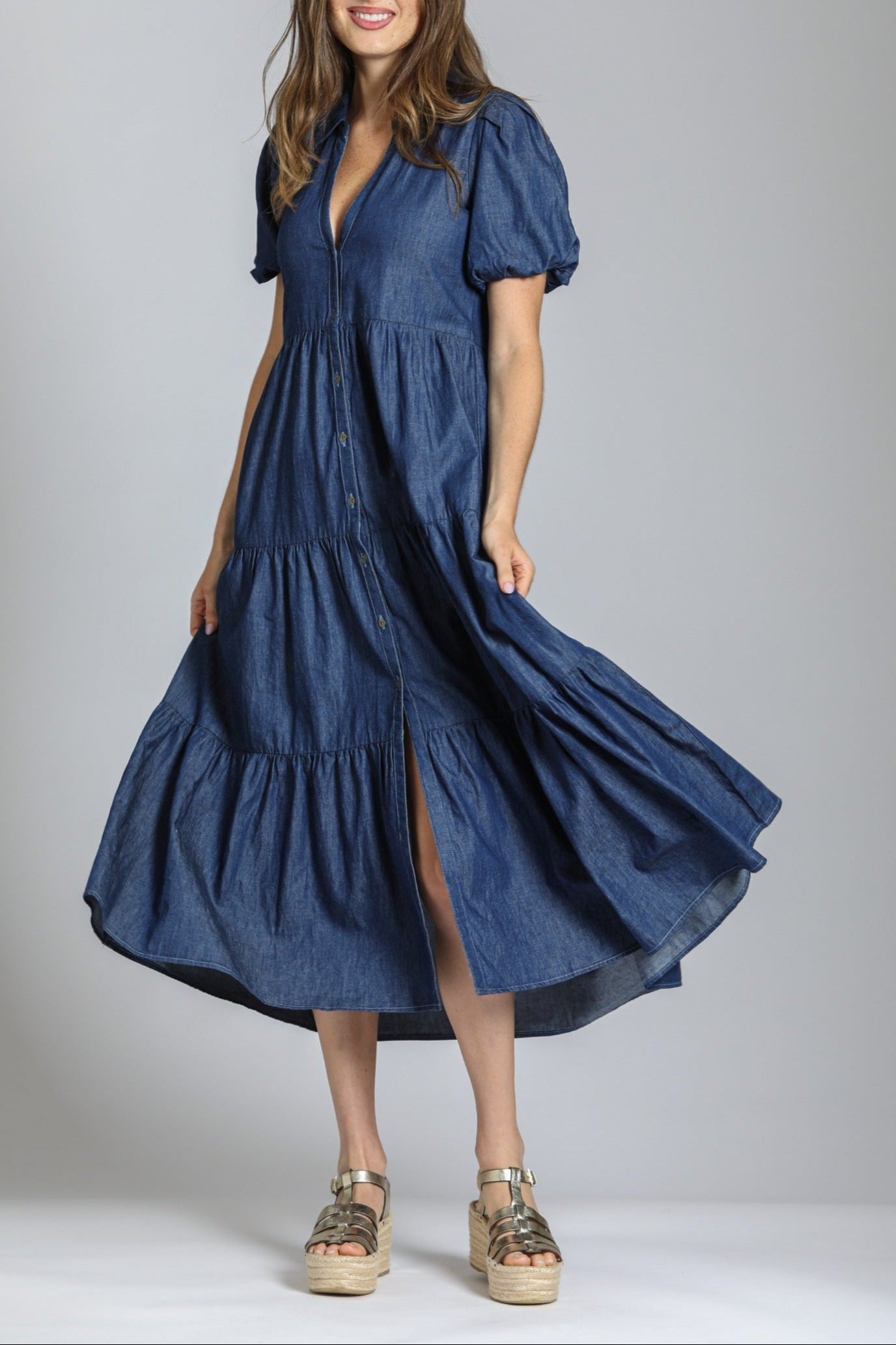 A tiered ruffle skirt brings flouncy movement to this denim maxi updated with puff sleeves for volume and charm.
