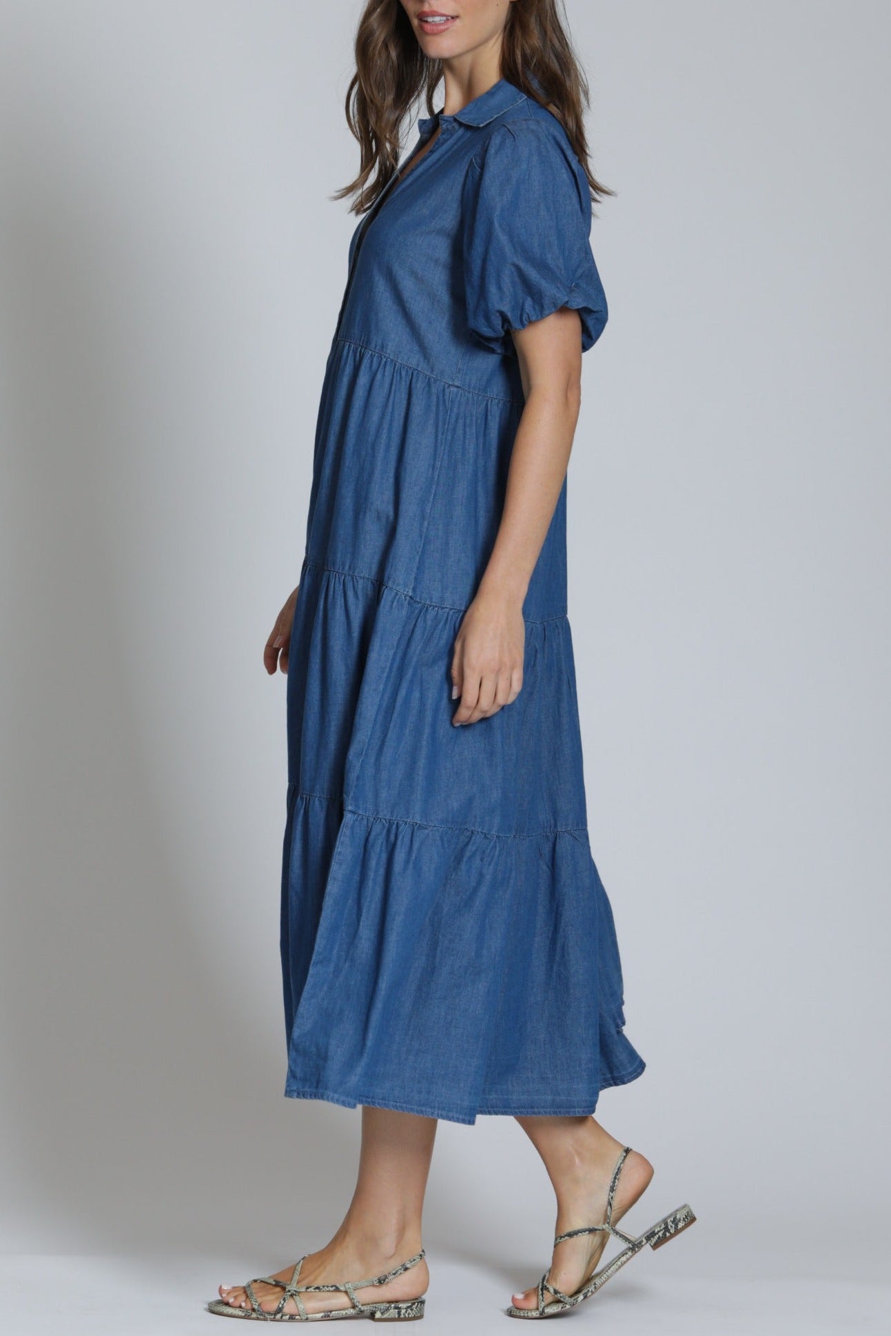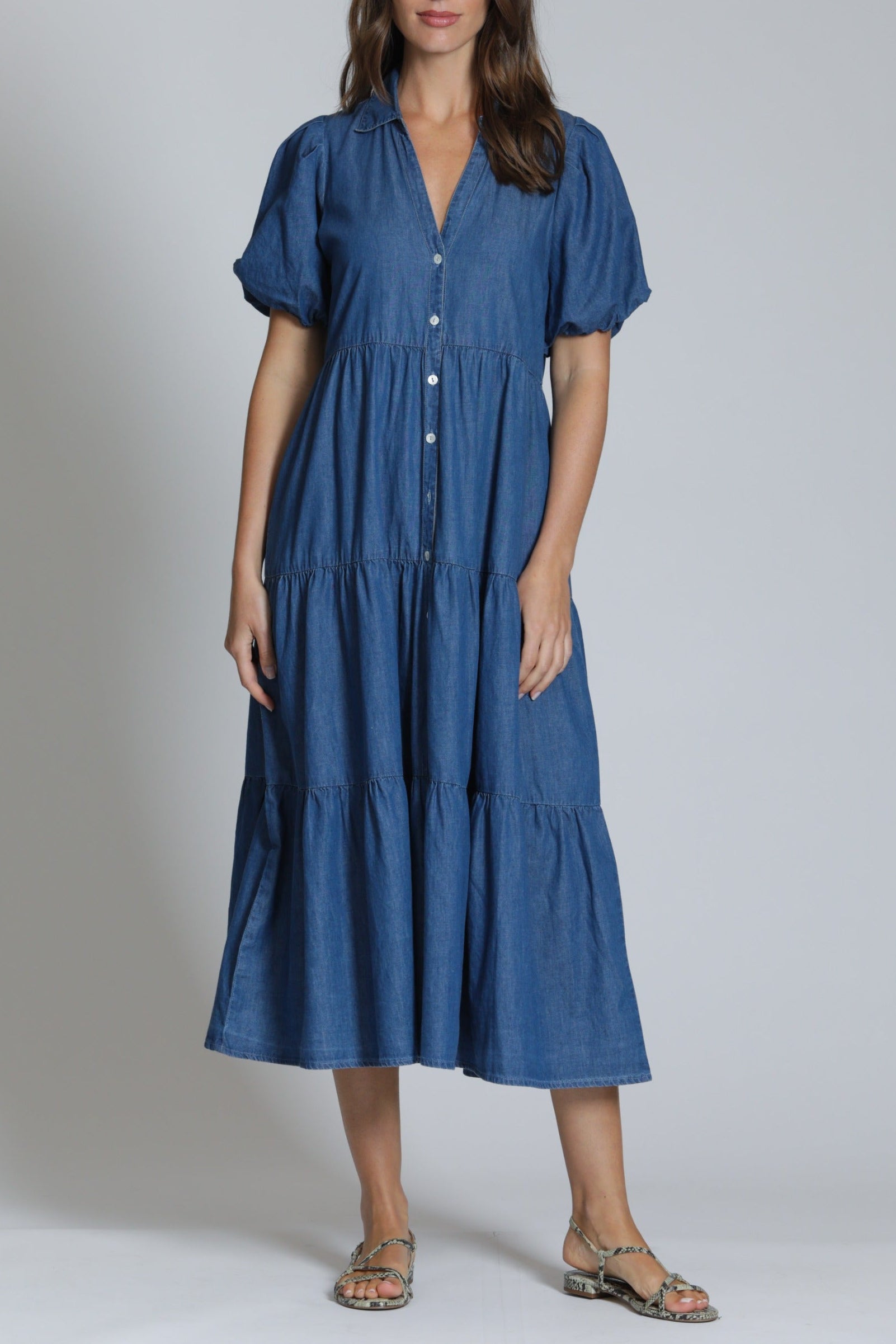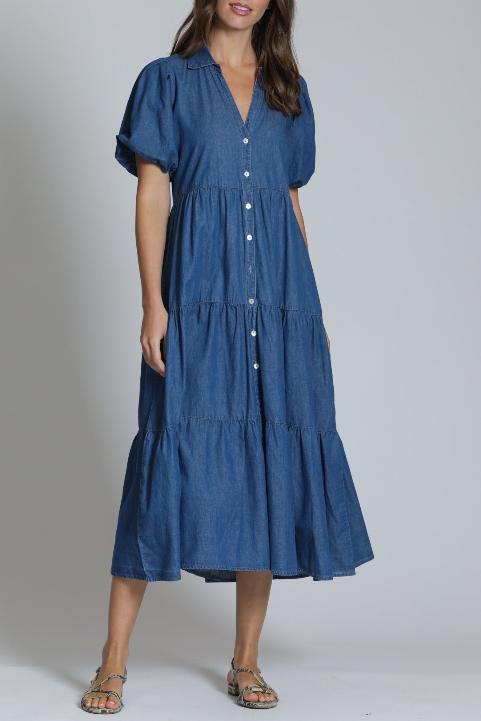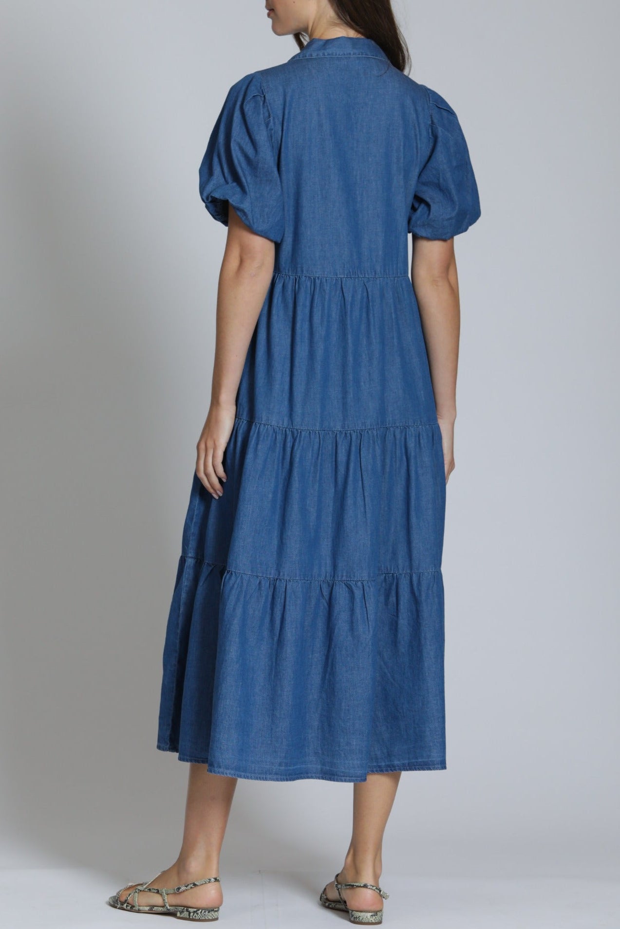 A tiered ruffle skirt brings flouncy movement to this denim maxi updated with puff sleeves for volume and charm.