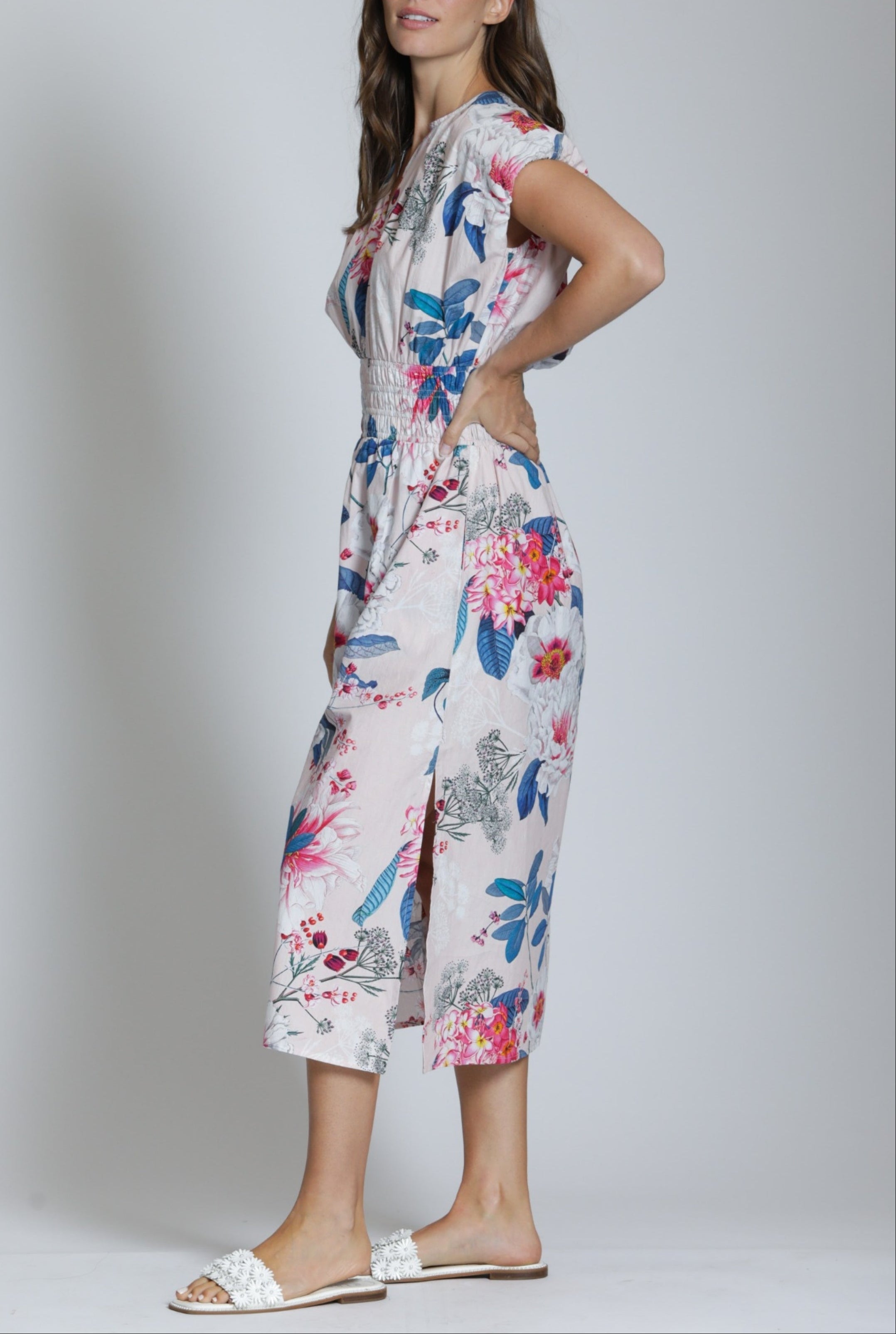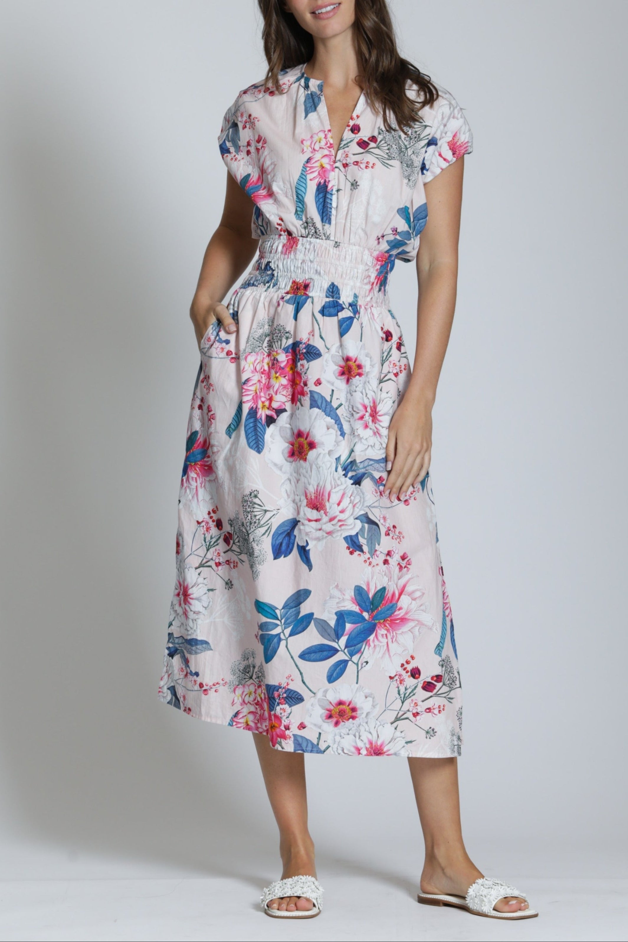 Refresh your weekend style with this woven cotton midi dress featuring a delightful floral print.