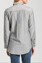 Discover effortless sophistication with this chic Multi-Stripe Button-Down Shirt, a versatile top featuring thin vertical stripes in black and white for a clean, elongated look. This shirt includes a classic point collar and a practical single chest pocket, maintaining a traditional shirting structure. Crafted for a comfortable fit, the full button-front closure and back yoke detail ensure a polished drape, making it an essential piece for professional wear or stylish casual layering.
