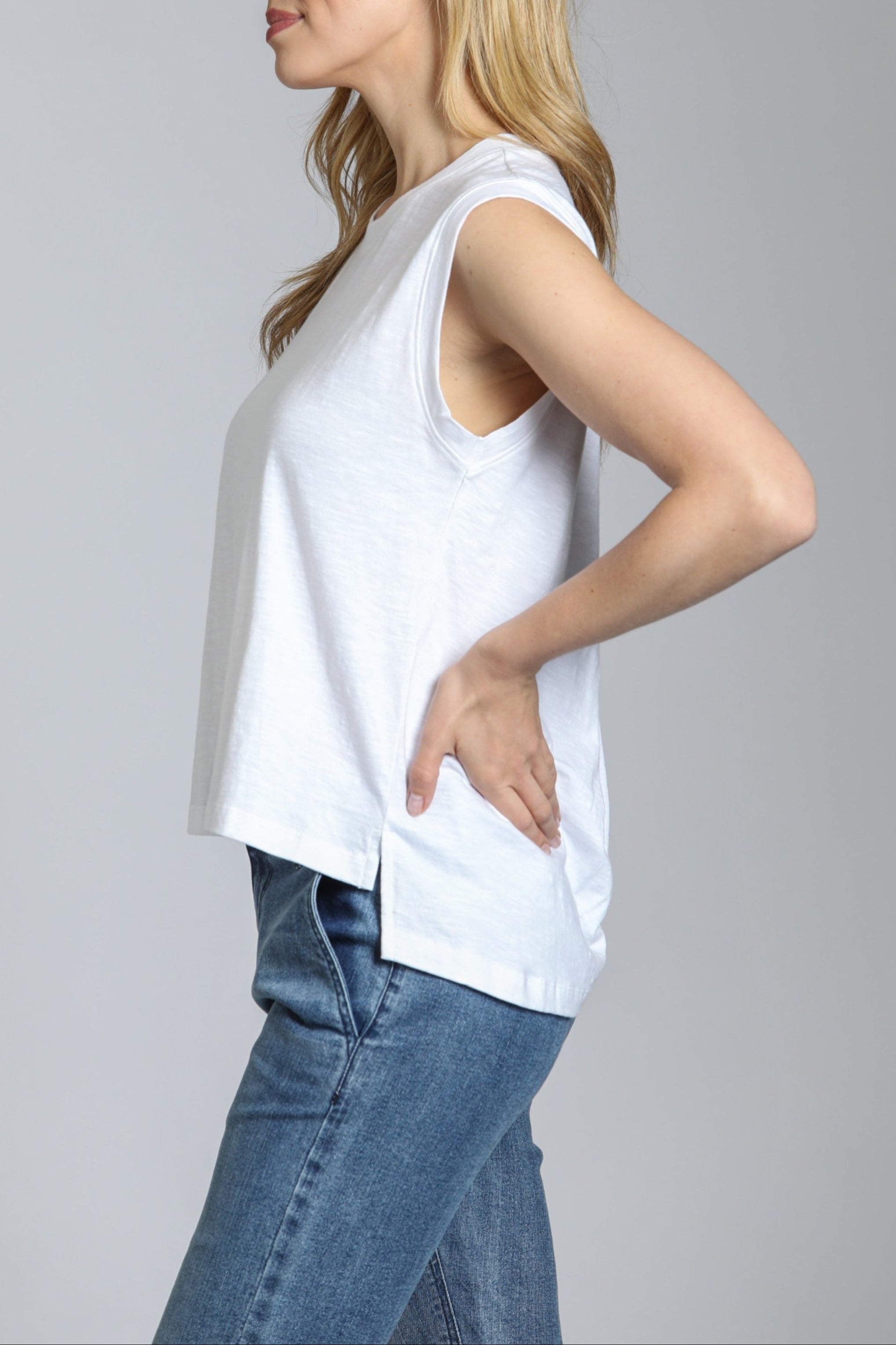 The Muscle Tee with High-Low Hem offers a modern twist on a classic sleeveless top. Designed with a relaxed fit and a stylish high-low hem, it provides effortless comfort and versatility. Perfect for layering or wearing solo, this tee pairs well with jeans, leggings, or shorts for a casual yet polished look.