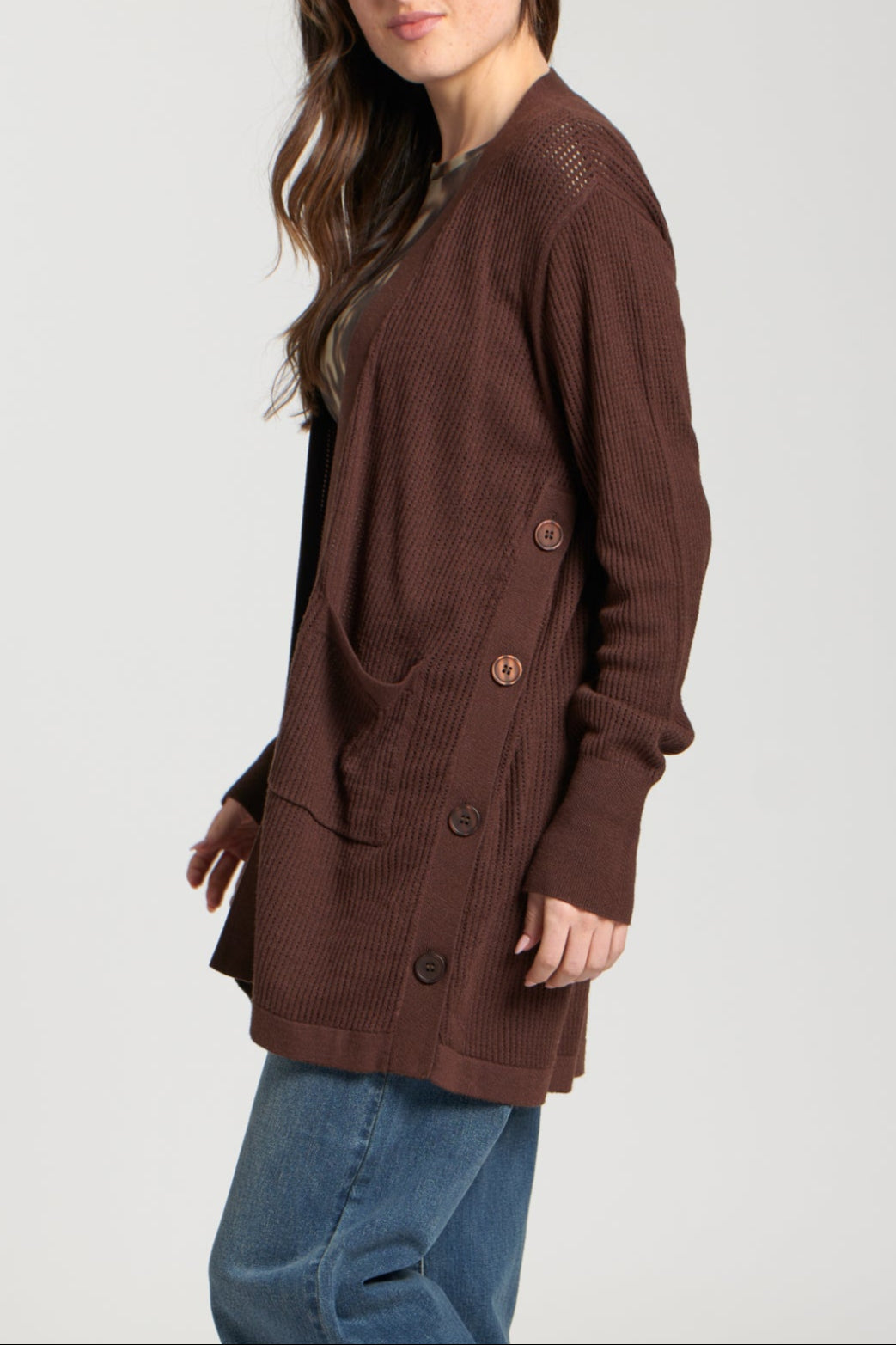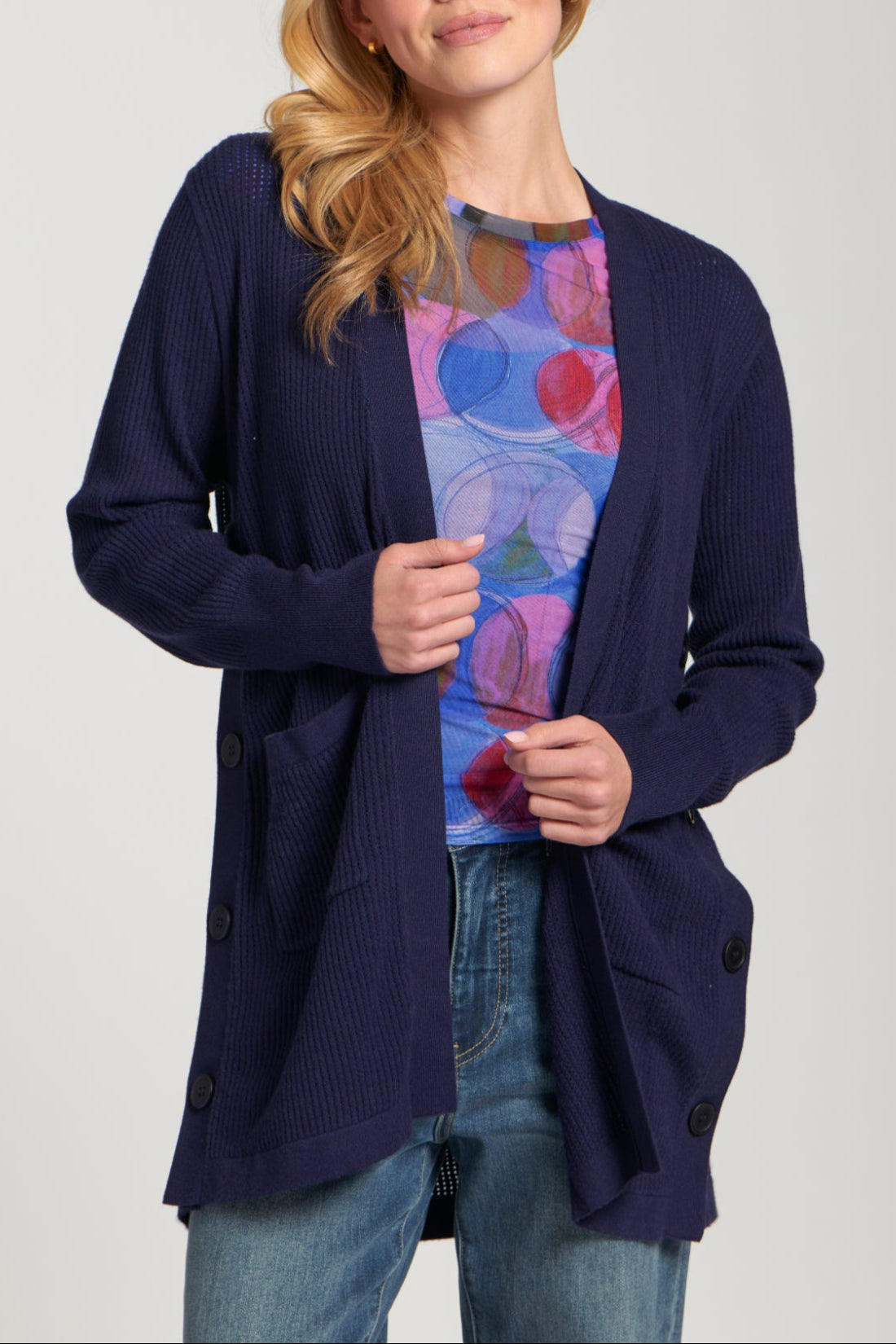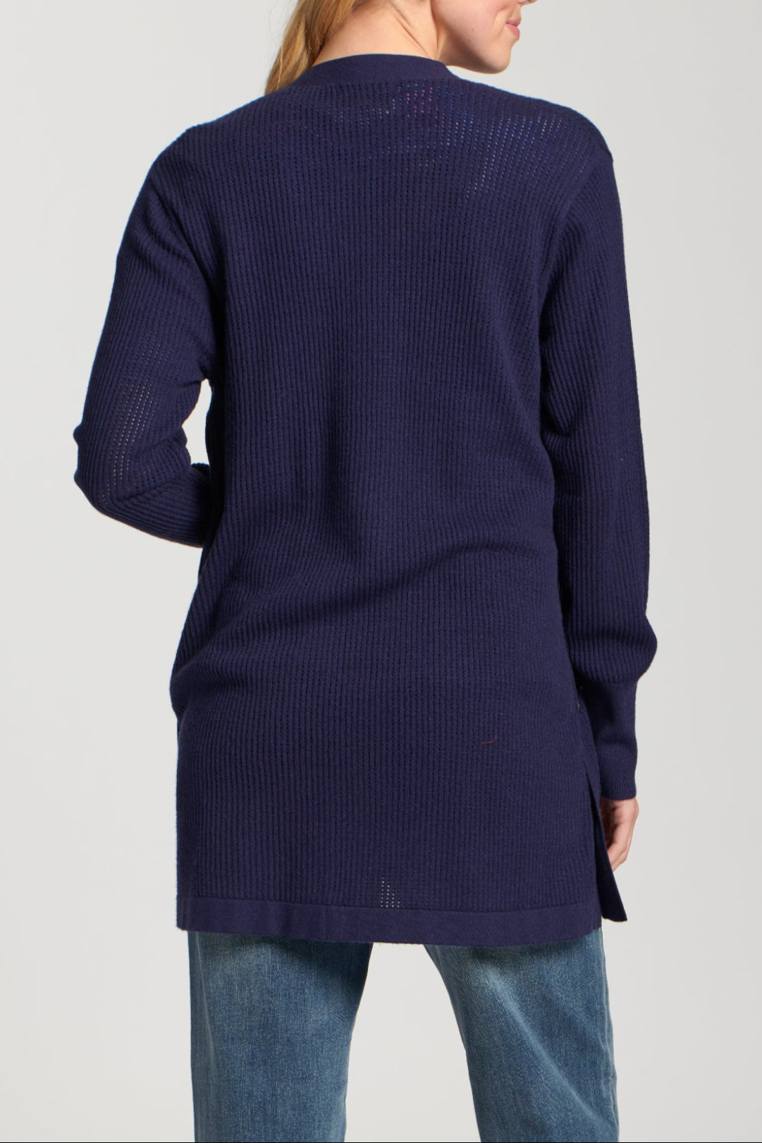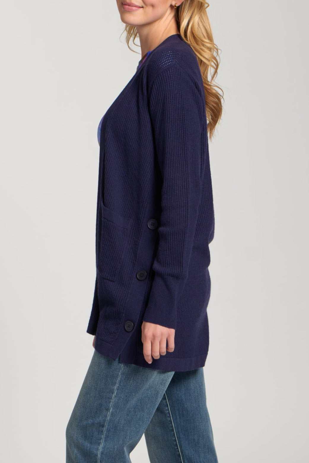 Stay cozy and stylish in this versatile navy cardigan, designed with a deep V-neckline for a flattering and relaxed look. Featuring a button-front closure along both sides, it offers adjustable styling options for layering. The straight hemline gives it a clean and modern finish, while the patch pockets placed at the front add functionality and casual charm. A perfect layering essential for both weekday wear and weekend comfort.