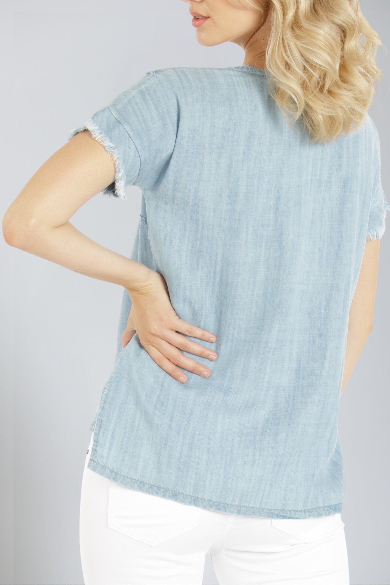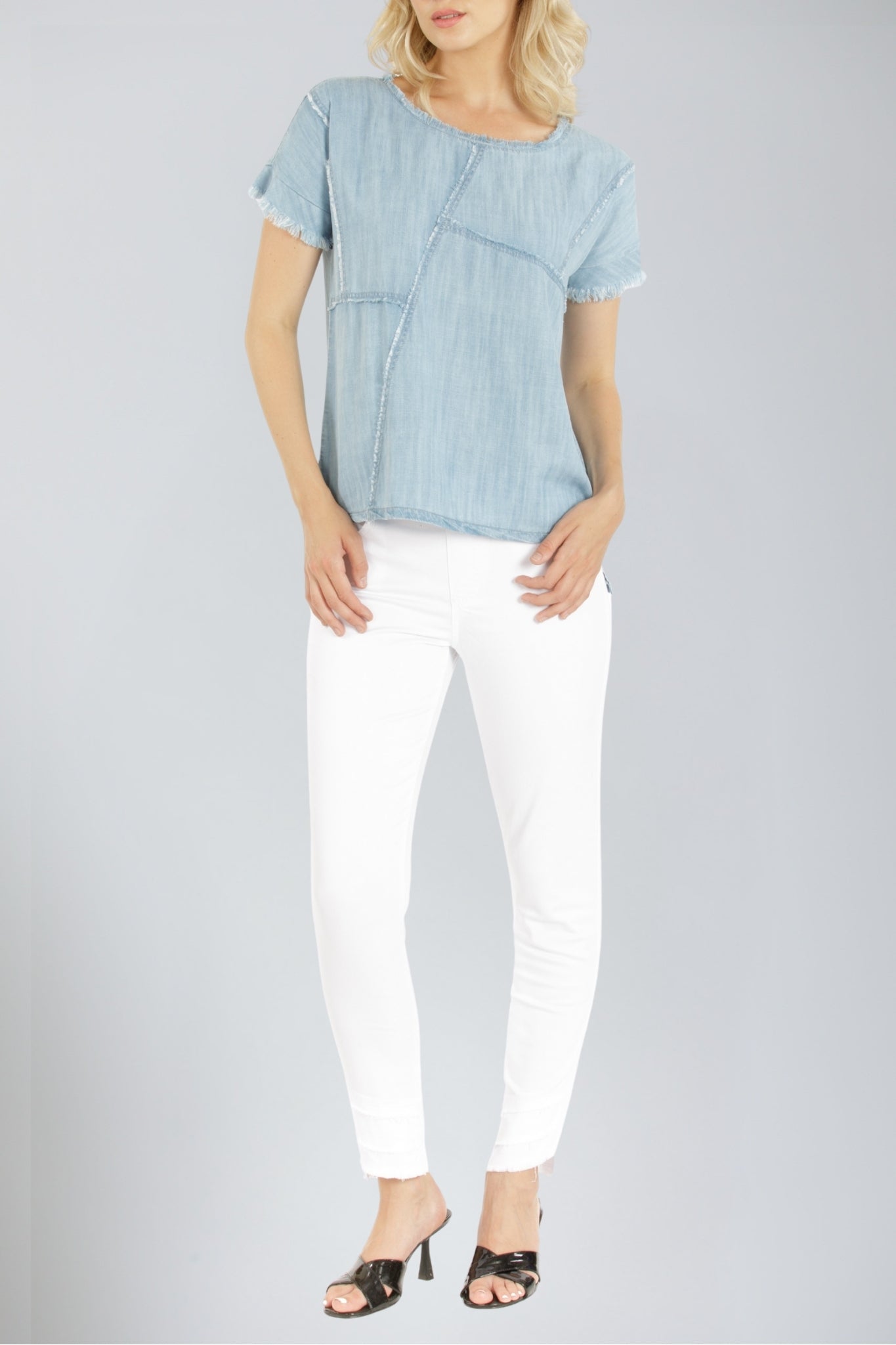 A pretty patched Tee is a must-buy for the new season ahead, and one of our hottest pick is this style that has us head over heels. Its frayed detailing at the seams make it the perfect candidate for your wardrobe. Pair this elegant top with our embroidered jeans, leggings or skinny jeans for a casual, chic look.