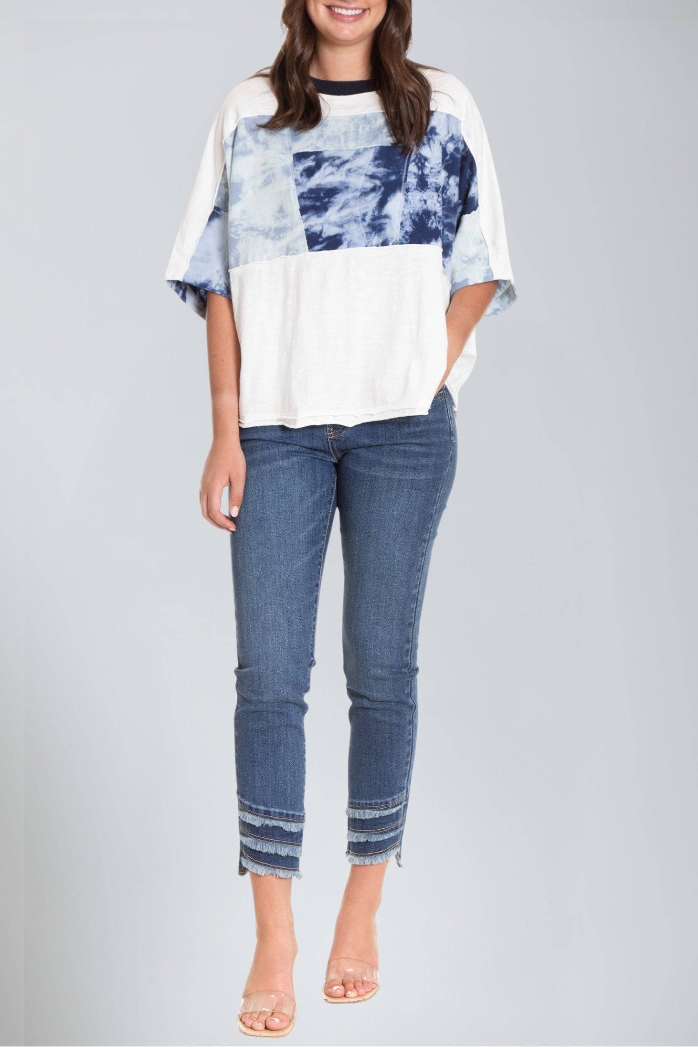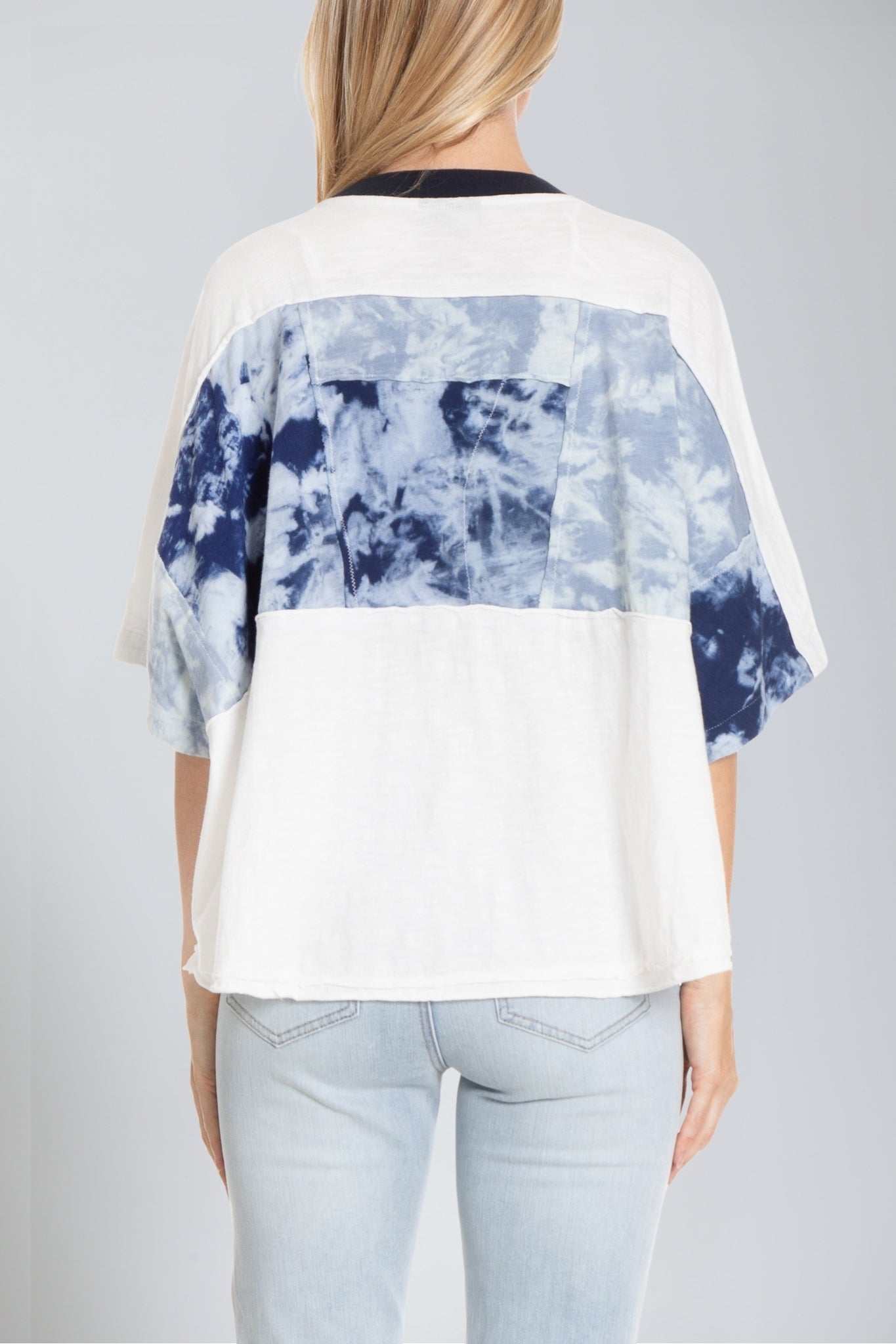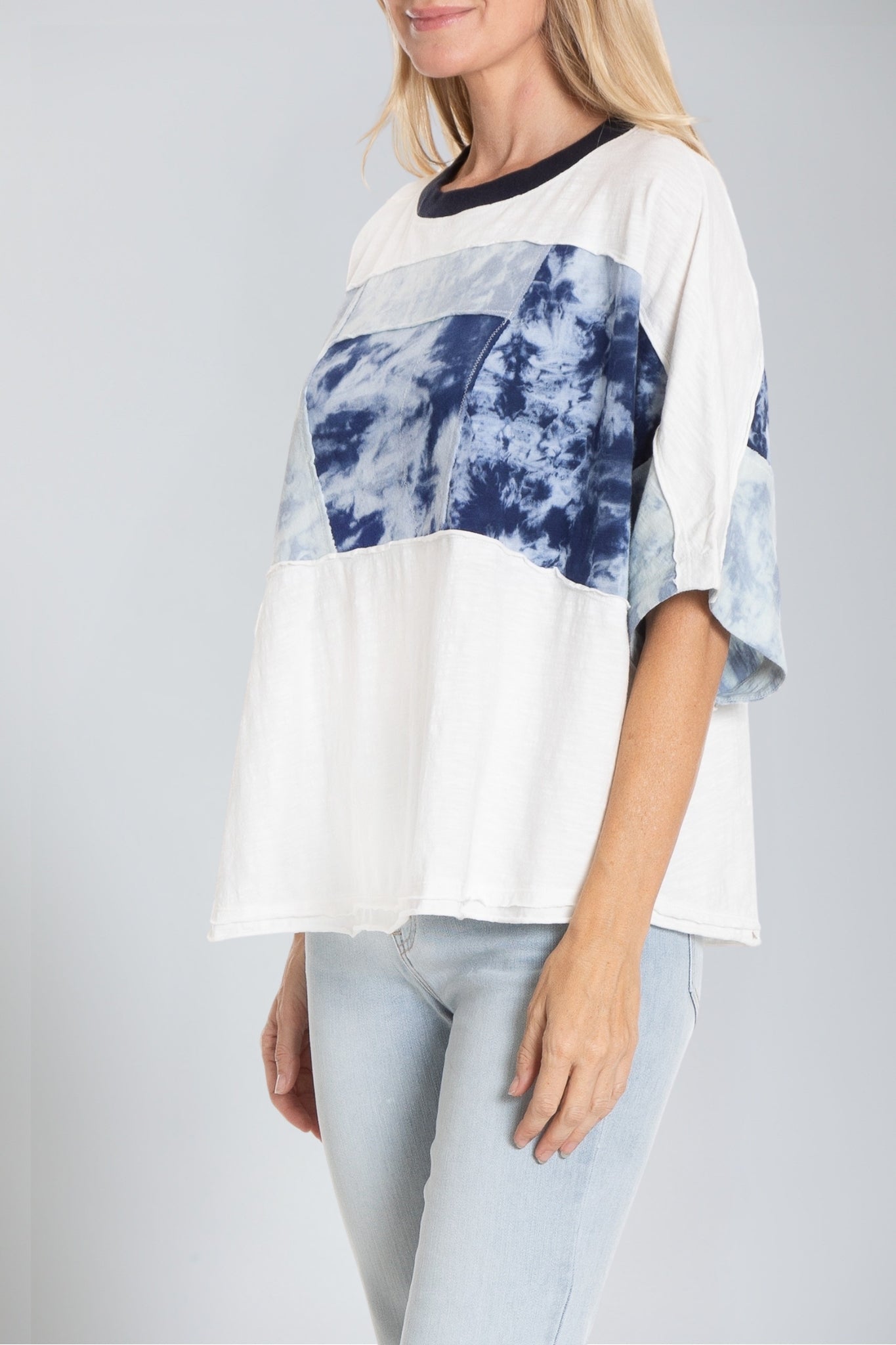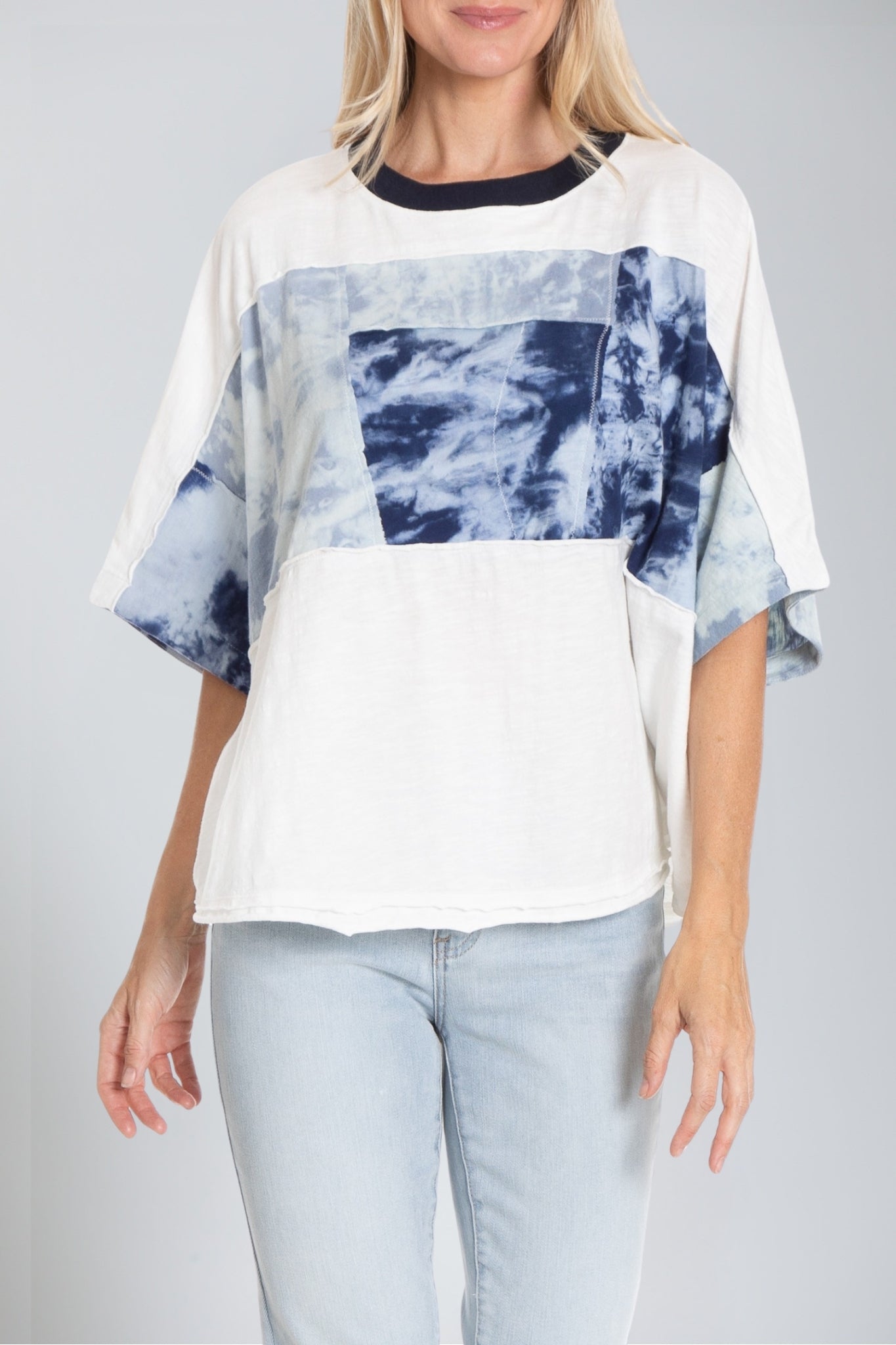 The Patched up Tee, in our soft cotton, is tinged with a kimono like feel. This swing tee is cut in a comfort fit with kimono sleeves and boasts a round neck, short sleeves, and a chic patch with a hypnotic print inspired by abstract patterns. Keep this tee as the focal point of your outfit by pairing with skinny jeans or leggings.