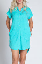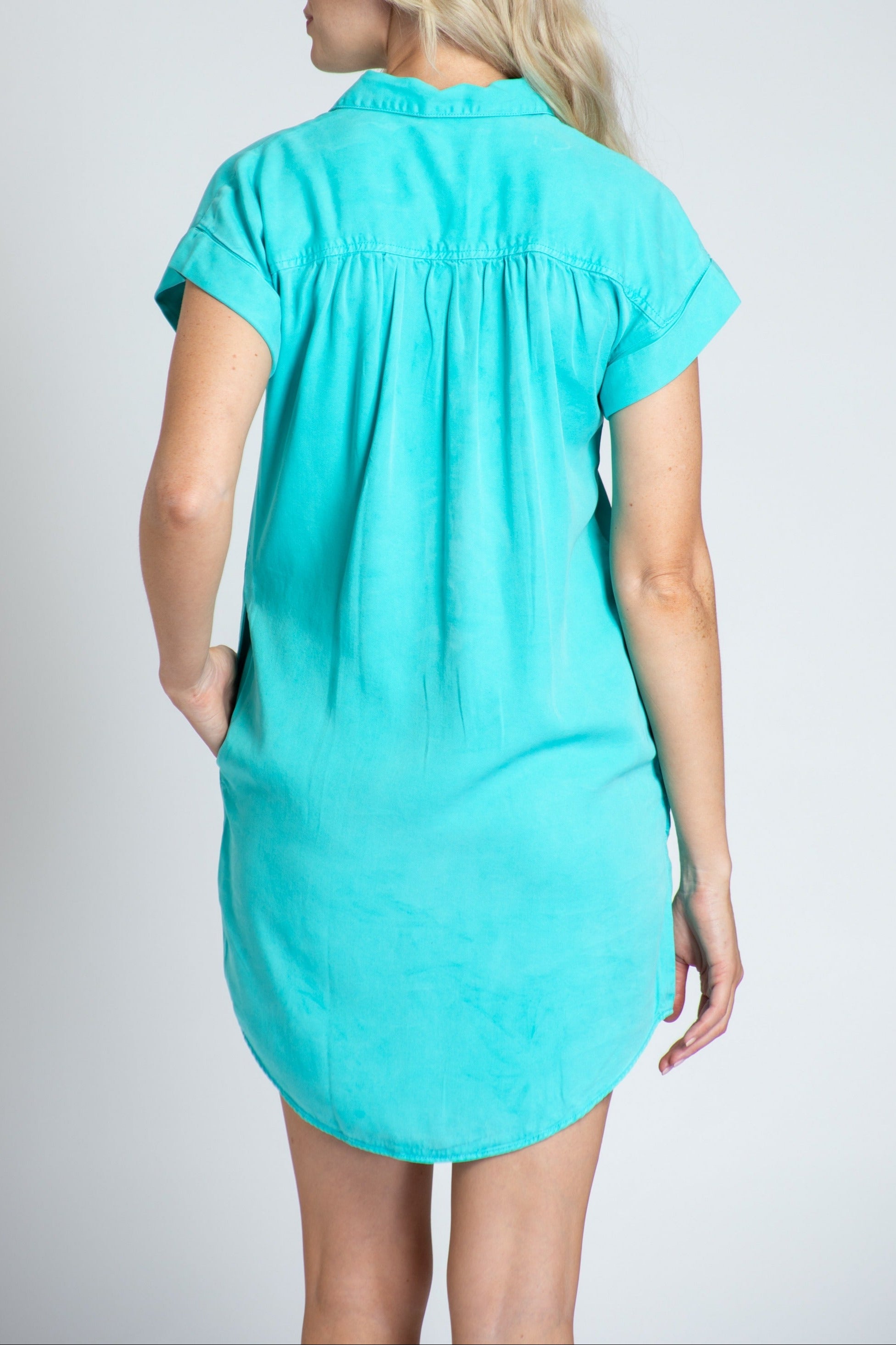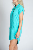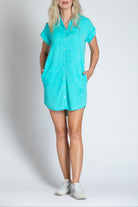 Unfurl your confidence with the Pocket Shirt Dress in a classic Turquoise shade. The impeccably tailored button-front and sharp collar whisper classicism, while two functional pockets add a touch of utilitarian chic. Plunge in the captivating glow of turquoise, a hue that whispers luxury without demanding excess. Effortlessly versatile, this masterpiece transitions from sun-drenched brunches to moonlit soirees. Embrace the essence of effortless sophistication - The Pocket Shirt Dress in Turquoise awaits your unique composition.