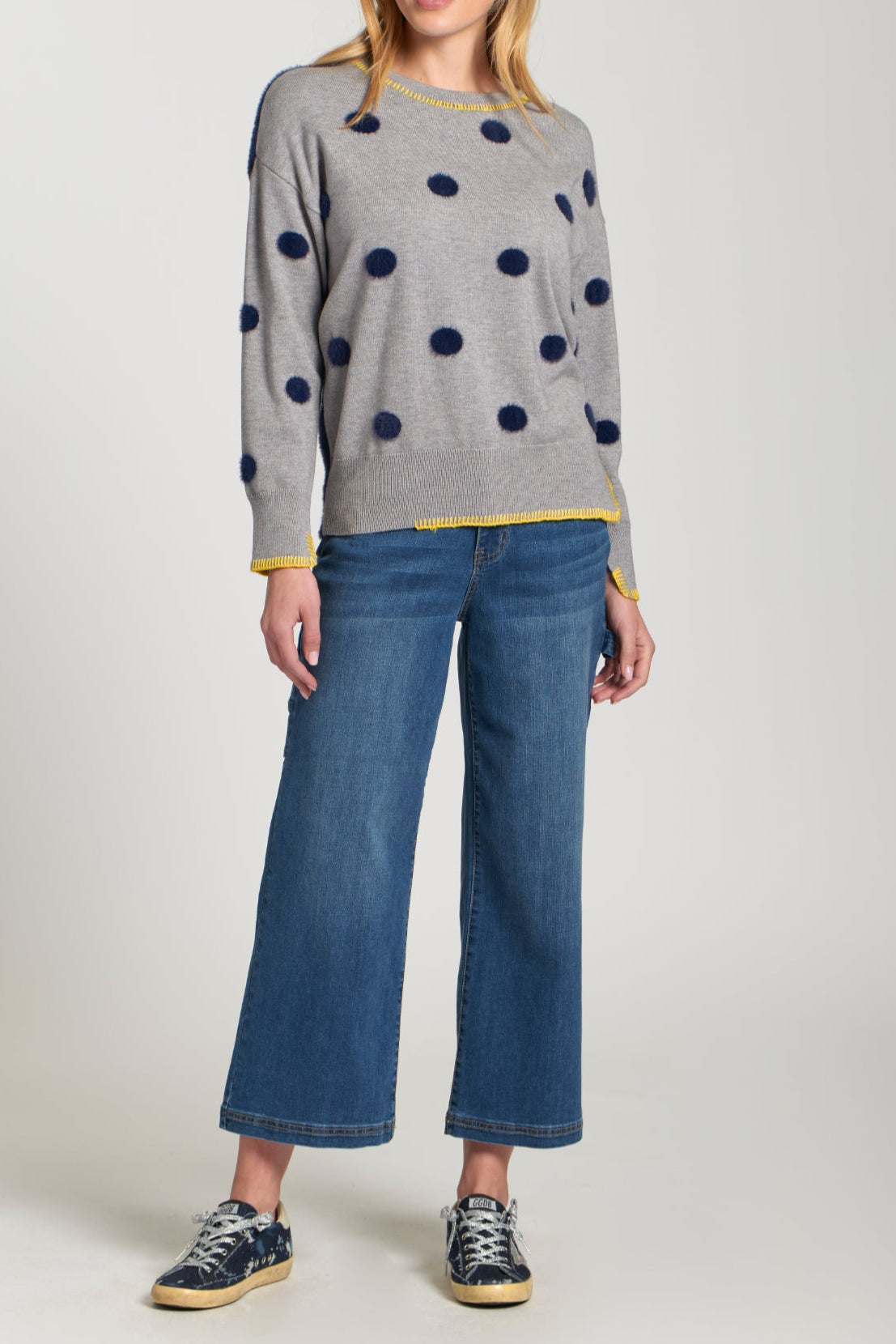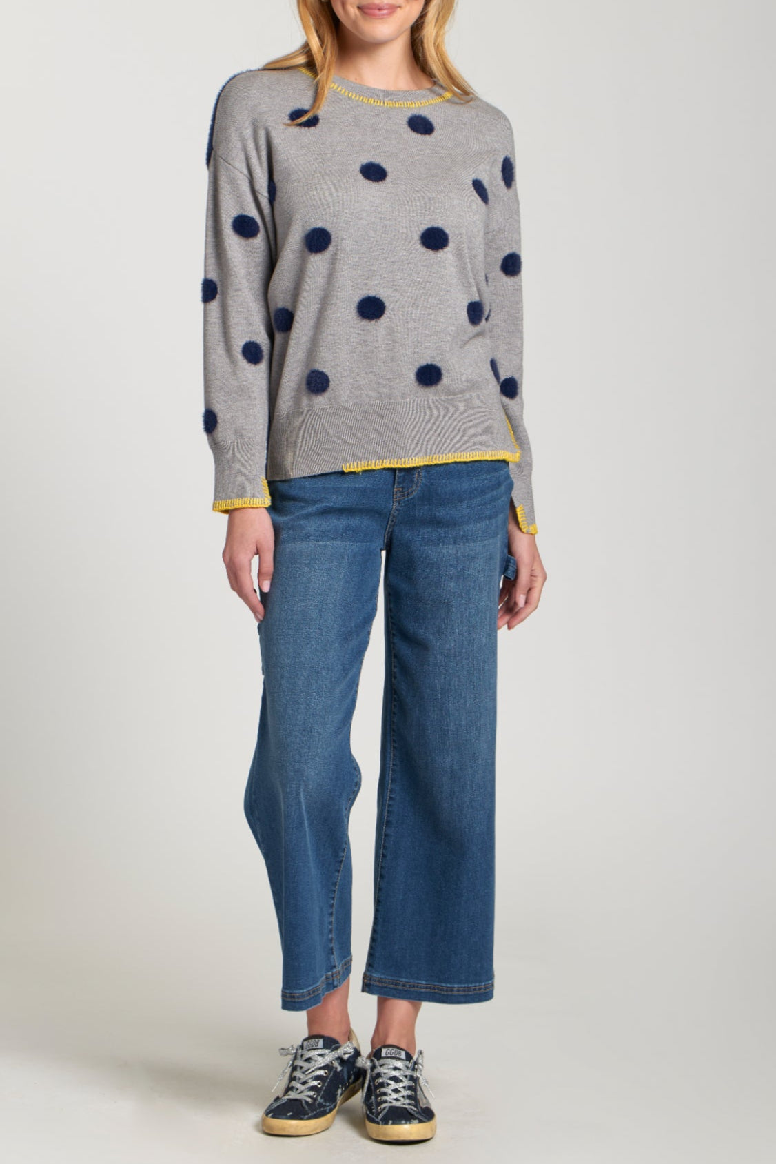 Add playful charm to your wardrobe with this cozy polka dot sweater. Designed with a crew neckline and pullover style, it features a soft grey base adorned with navy fuzzy dot detailing throughout. The contrasting yellow ribbed trim at the neckline, cuffs, and hemline adds a fun pop of color, elevating this casual piece with a touch of uniqueness. Perfect for relaxed, everyday looks with a cheerful twist.