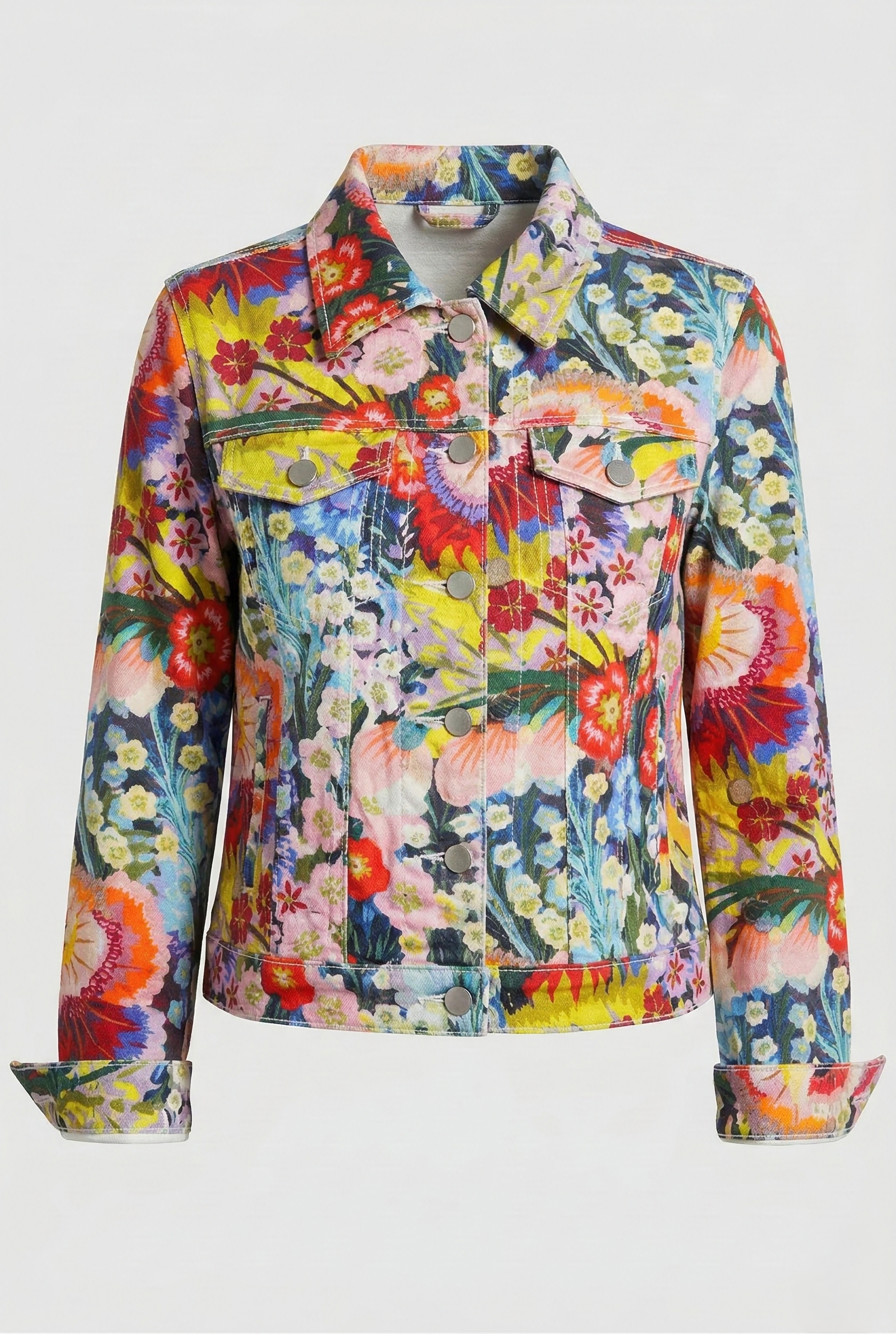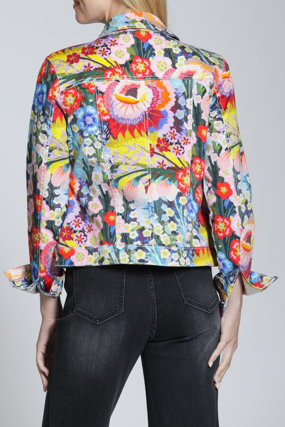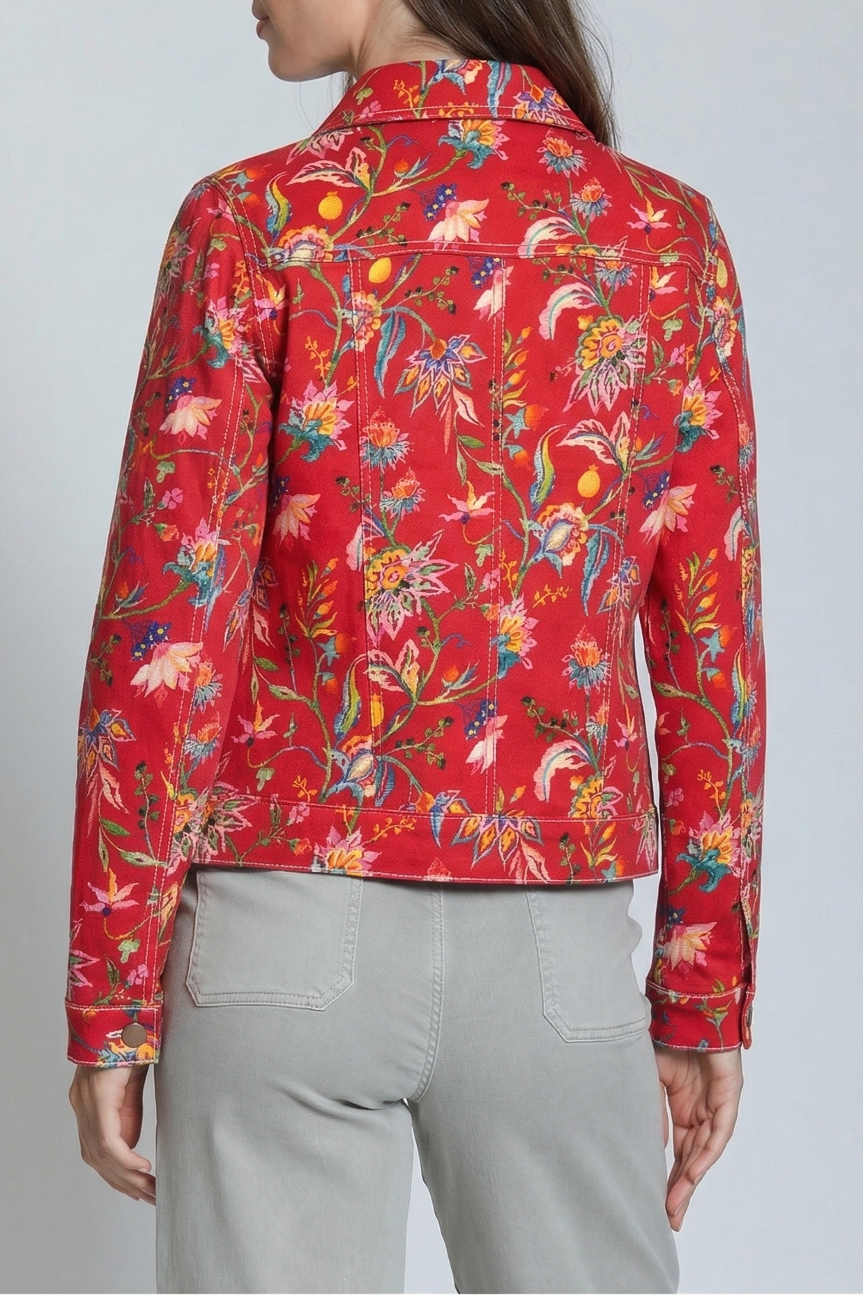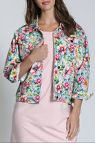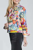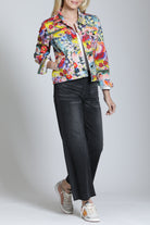 Sure to brighten any day, this stretch-denim trucker jacket features an artful print and a classic silhouette for easy layering.
