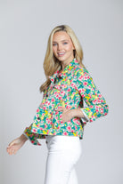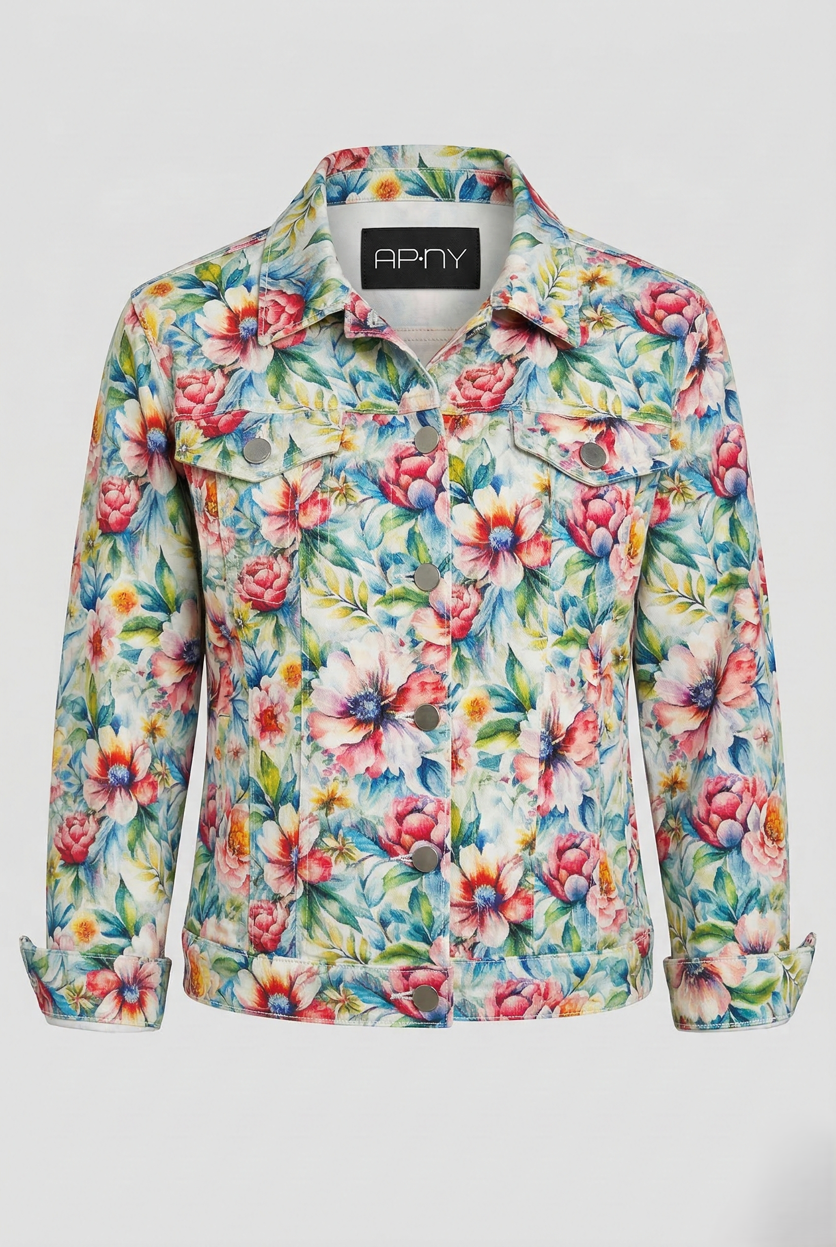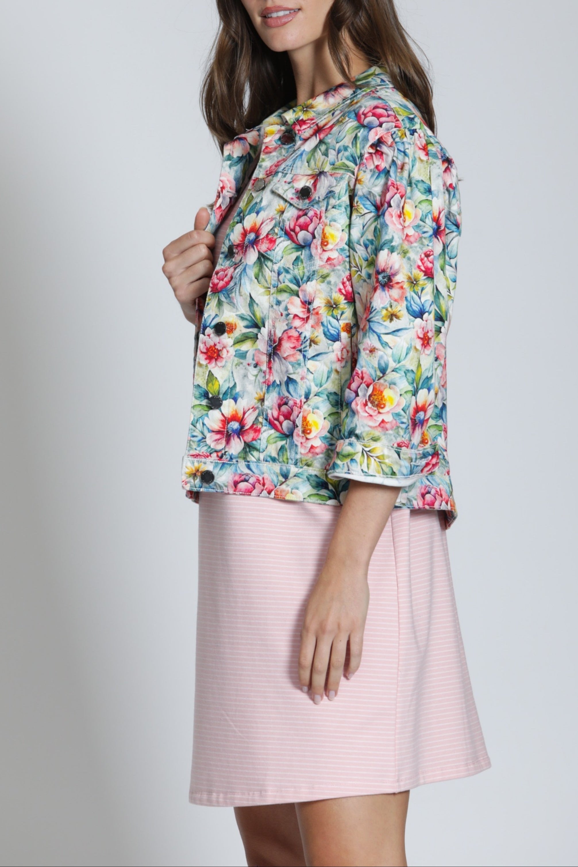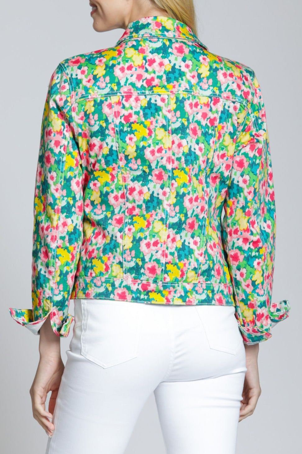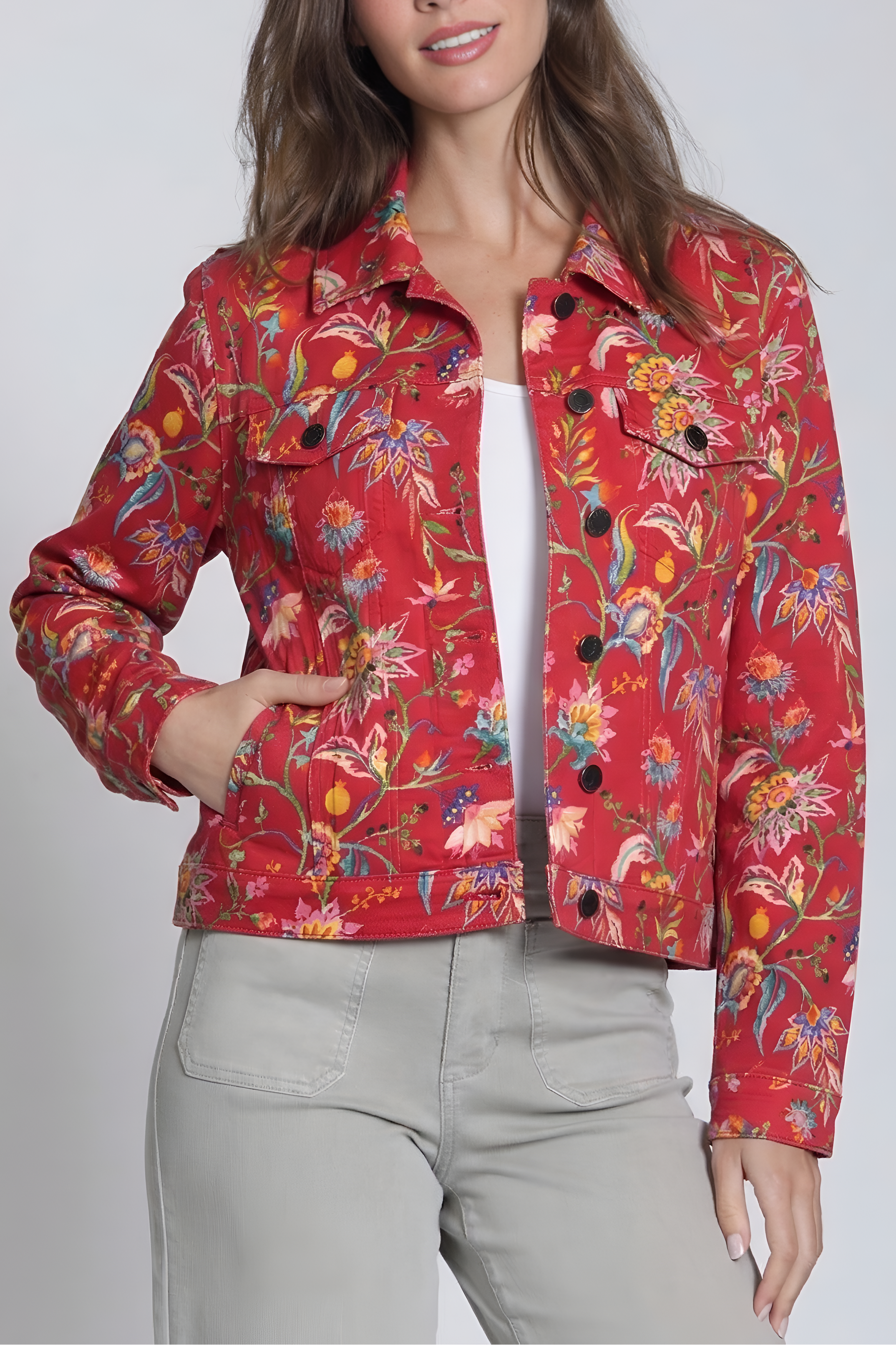 Sure to brighten any day, this stretch-denim trucker jacket features an artful print and a classic silhouette for easy layering.