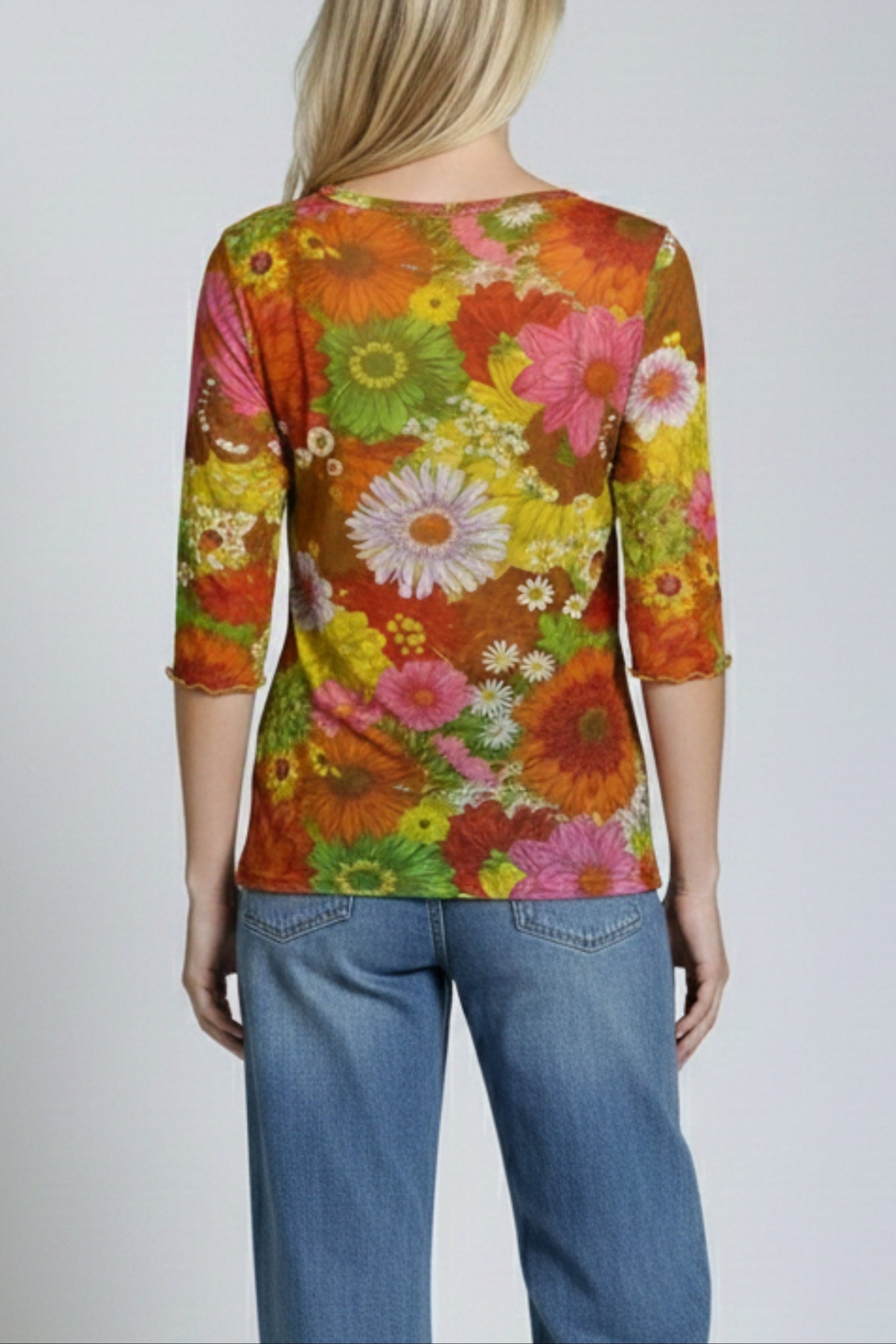 Printed Mesh Top With Elbow Sleeves