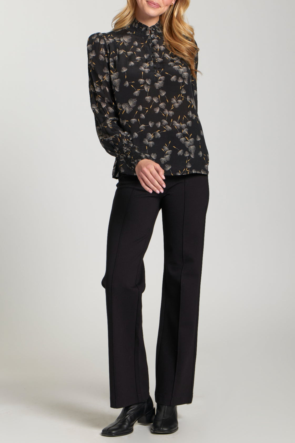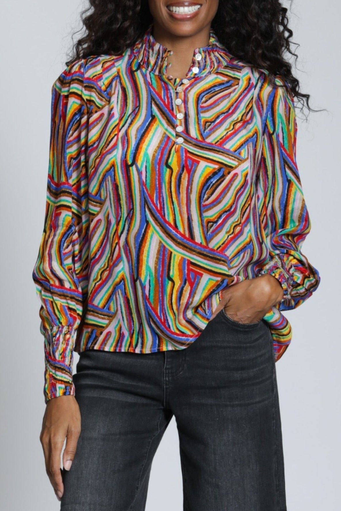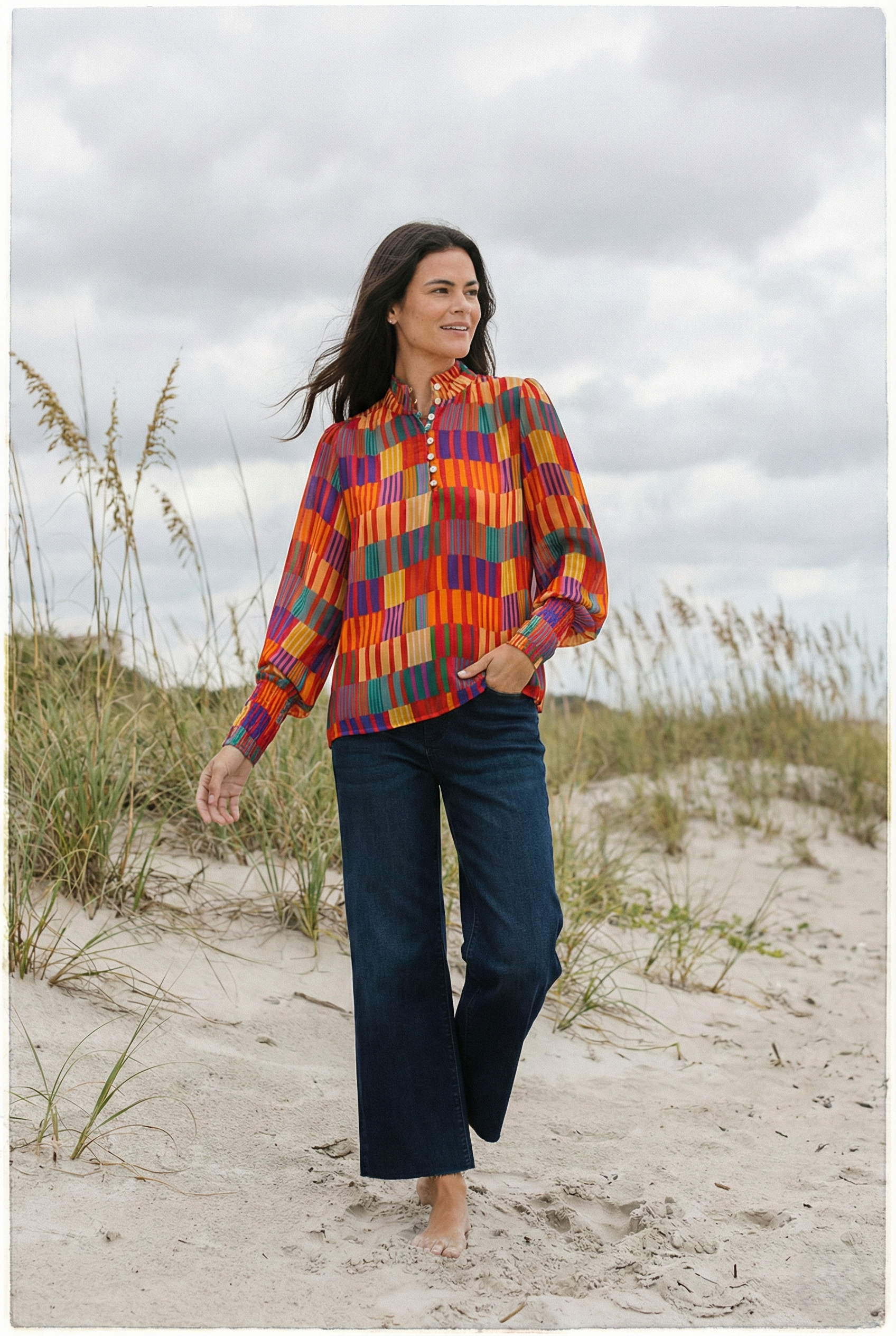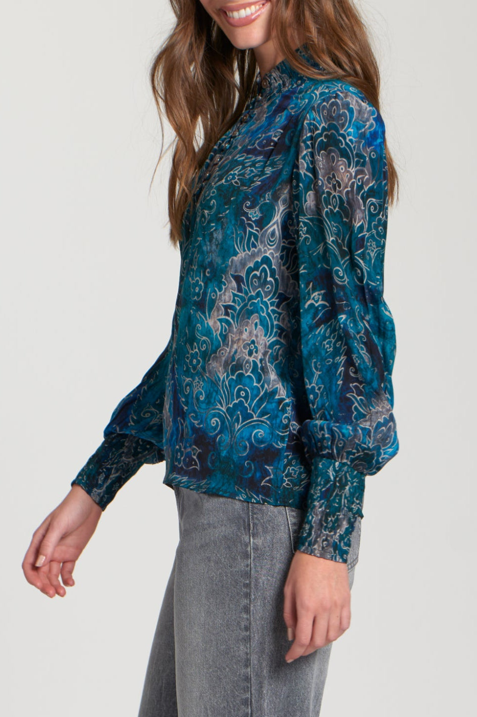 This stunner's got all the feathery feel with a statement Print, plus on-trend puffed sleeves and rushing that'll cinch you in for a dreamy silhouette. Made from a cloud-soft blend, it's a comfort that turns heads. This top is the perfect companion for an eye-catching look that's comfy and oh-so-trendy!