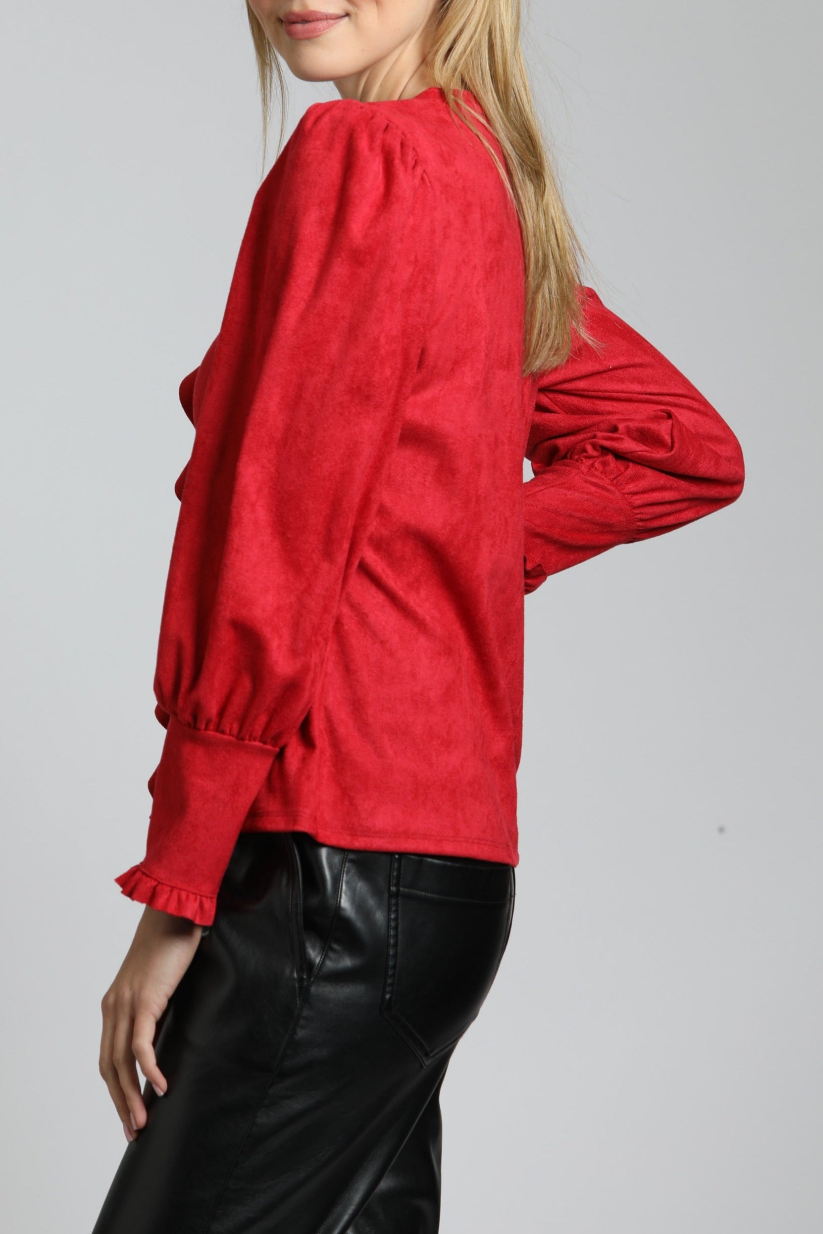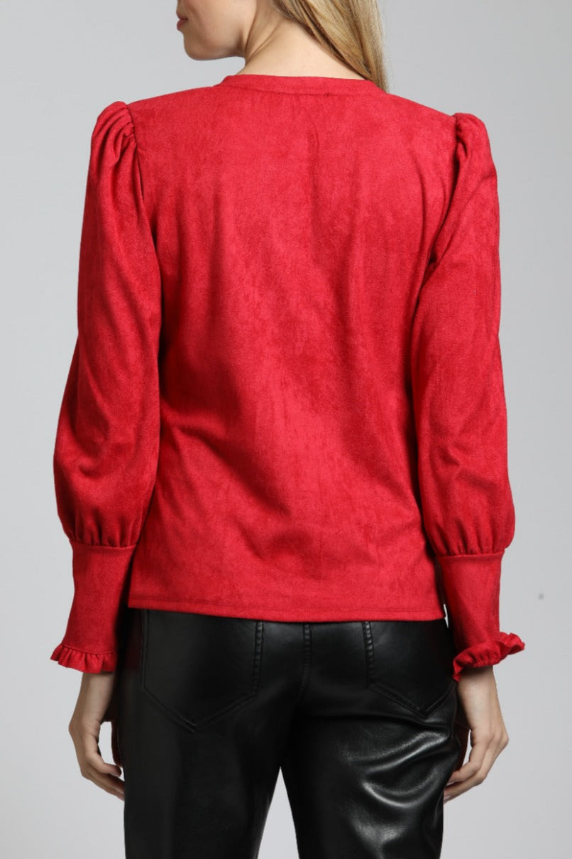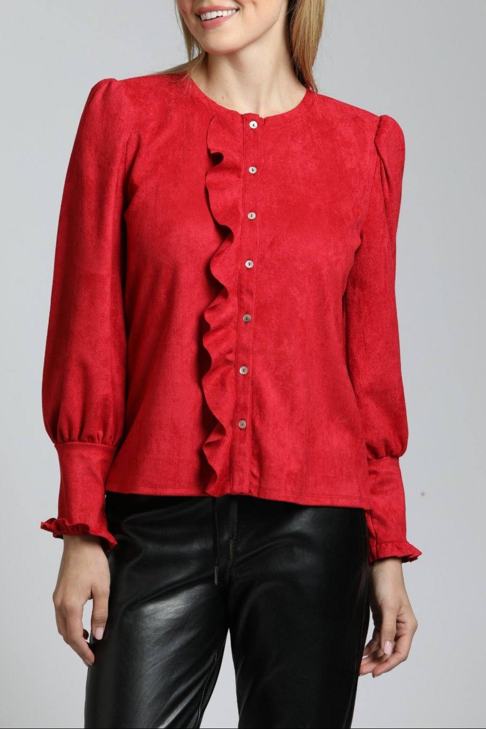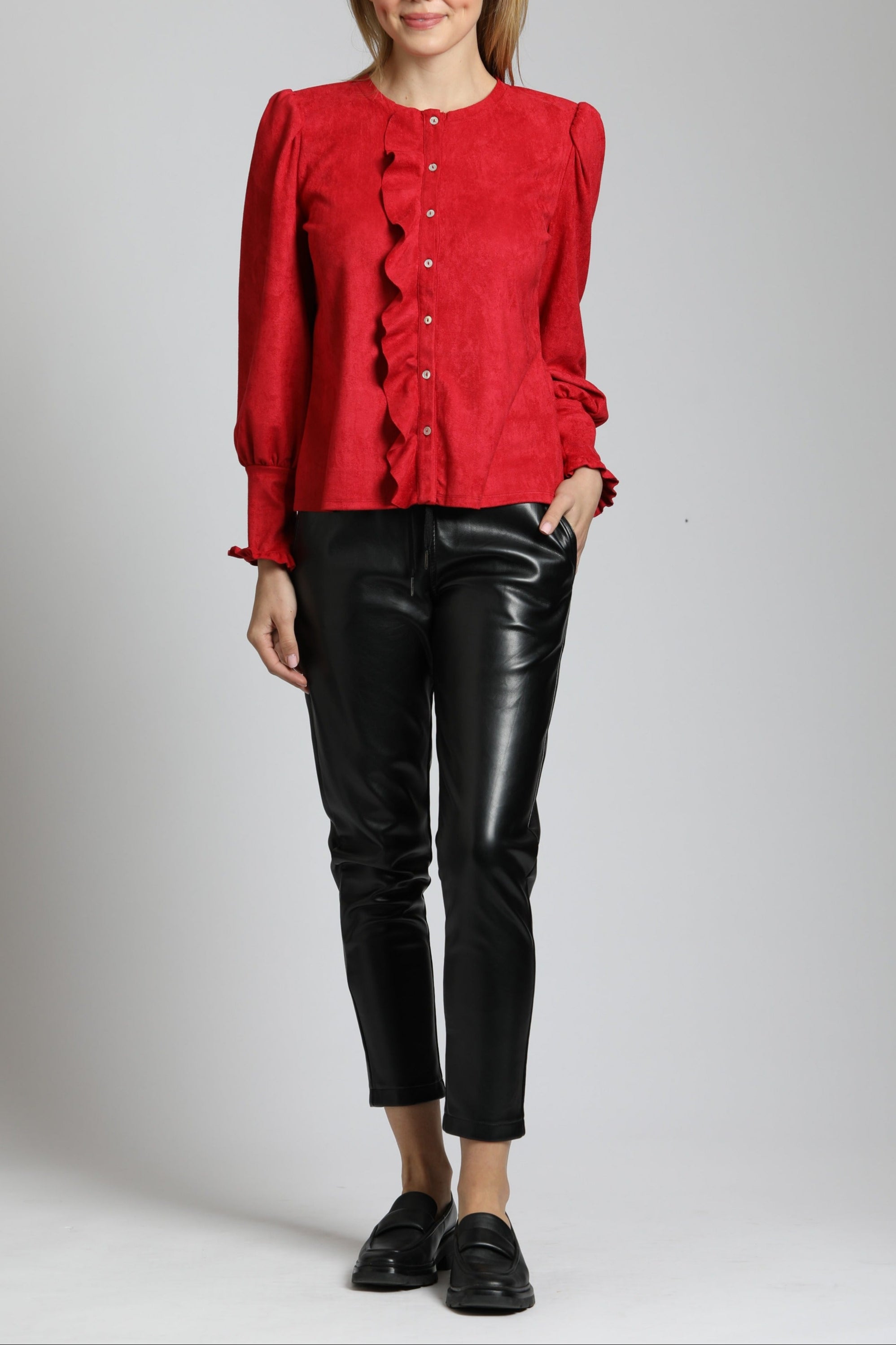 Puff Sleeve Vegan Leather Top With Ruffle Placket