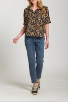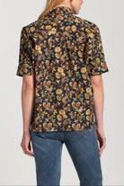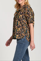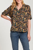 Unleash your vibrant style with this effortlessly chic Printed Pull-Over Top, a versatile piece designed for both comfort and flair. This short-sleeved blouse features a rich, all-over pattern on a dark background, showcasing an intricate mix of warm gold, mustard, teal, and rust tones in a floral and bird motif. Crafted with a relaxed fit and a flattering high-low hem, this pull-over style top offers easy wearability, making it perfect for pairing with denim, trousers, or skirts. The simple yet smart V-neck and classic collar add a touch of polish, ensuring you look put-together whether you're heading to the office or enjoying a casual weekend outing.
