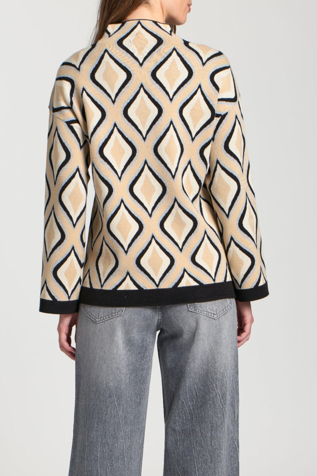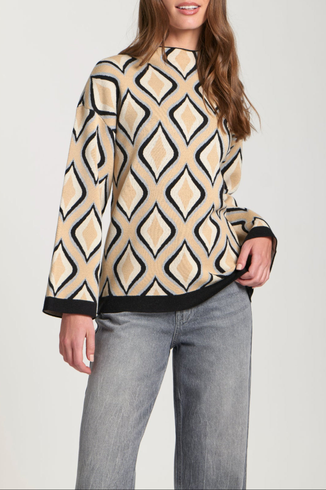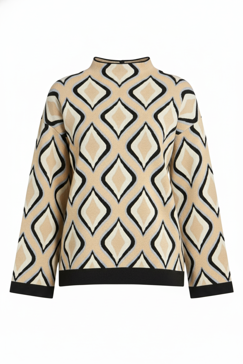 Embrace retro-chic style with this cozy Funnel Neck Sweater, featuring a striking geometric diamond swirl motif in warm neutral tones like beige, black, and cream. Crafted from a comfortable knit fabric, this pullover features a high mock neck for warmth and structure, and a relaxed body with a banded hem and cuffs for a flattering fit. This bold print sweater is the perfect statement piece to pair with simple trousers or jeans for an effortlessly cool, throwback look.