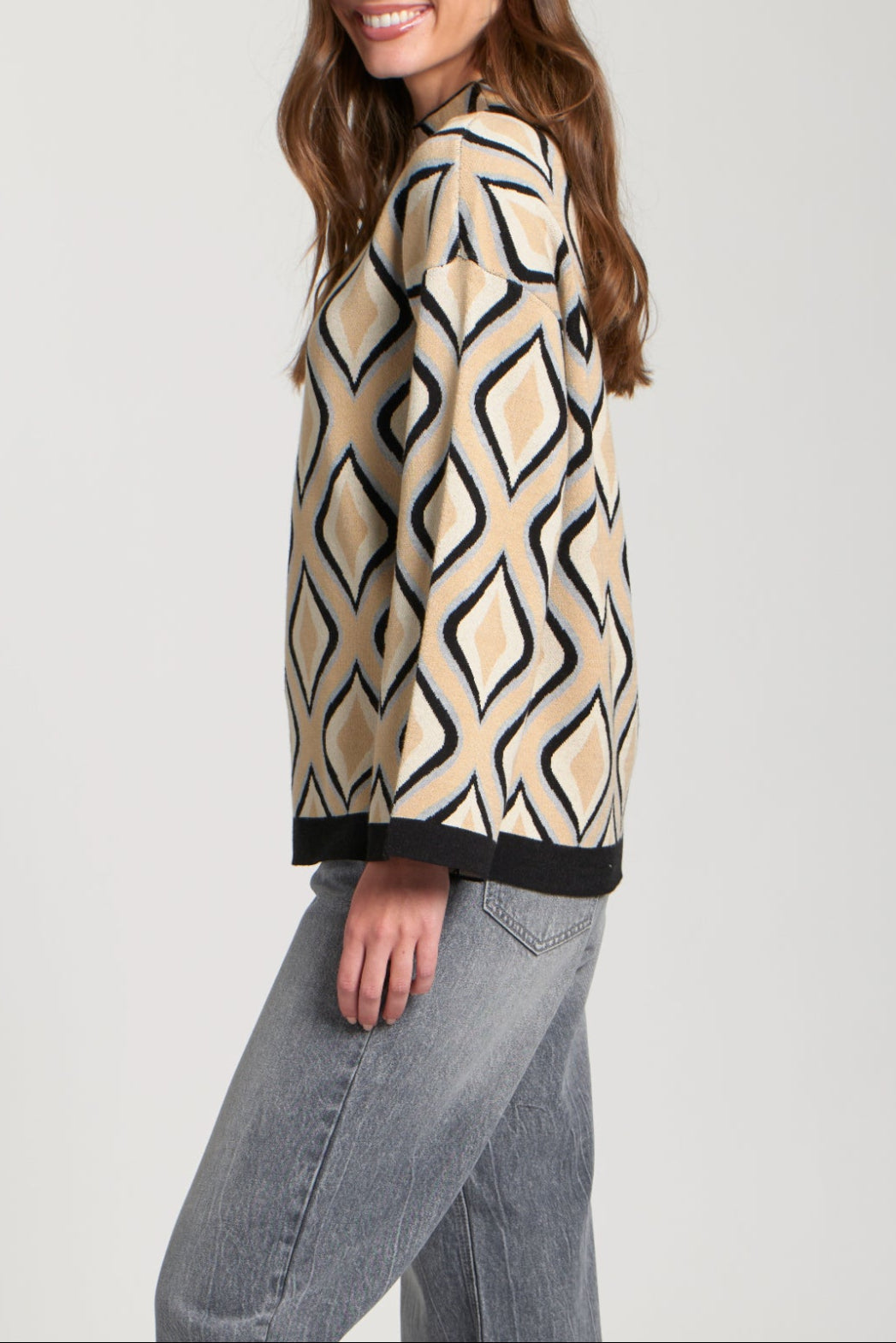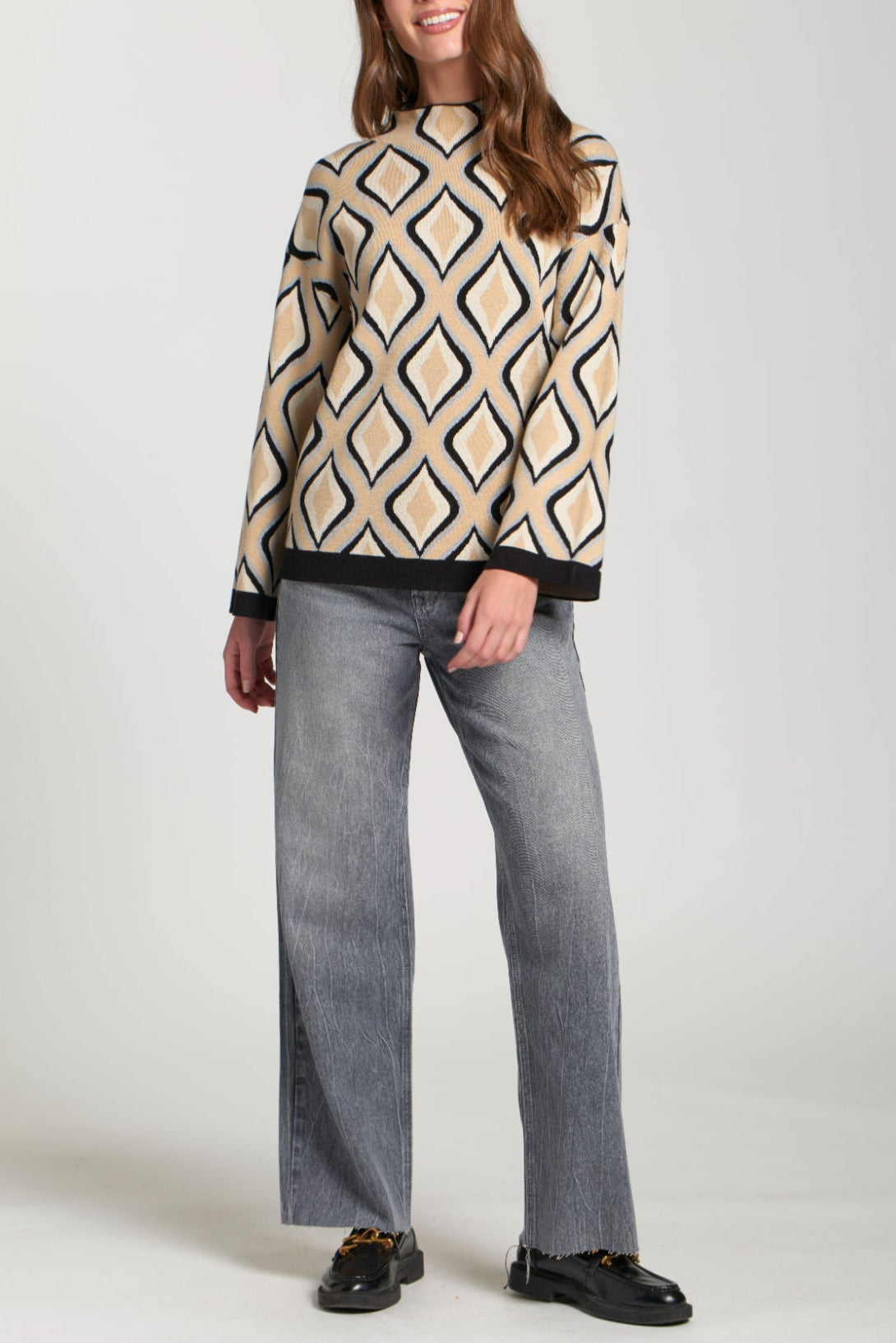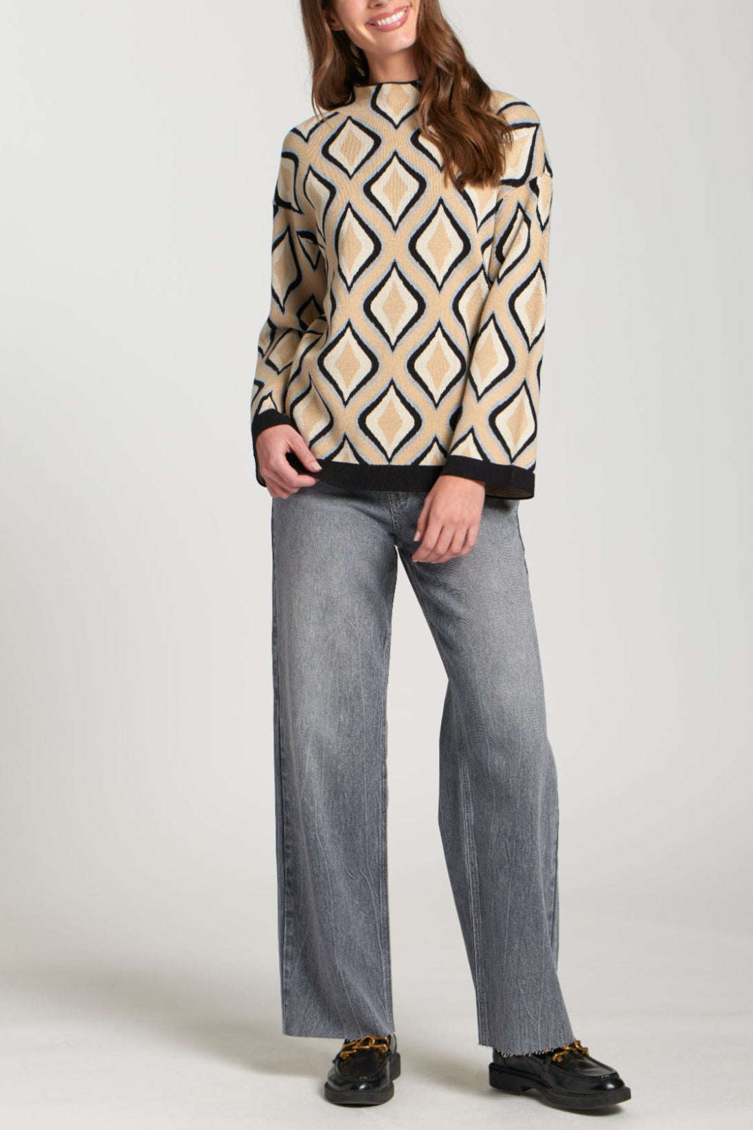 Embrace retro-chic style with this cozy Funnel Neck Sweater, featuring a striking geometric diamond swirl motif in warm neutral tones like beige, black, and cream. Crafted from a comfortable knit fabric, this pullover features a high mock neck for warmth and structure, and a relaxed body with a banded hem and cuffs for a flattering fit. This bold print sweater is the perfect statement piece to pair with simple trousers or jeans for an effortlessly cool, throwback look.