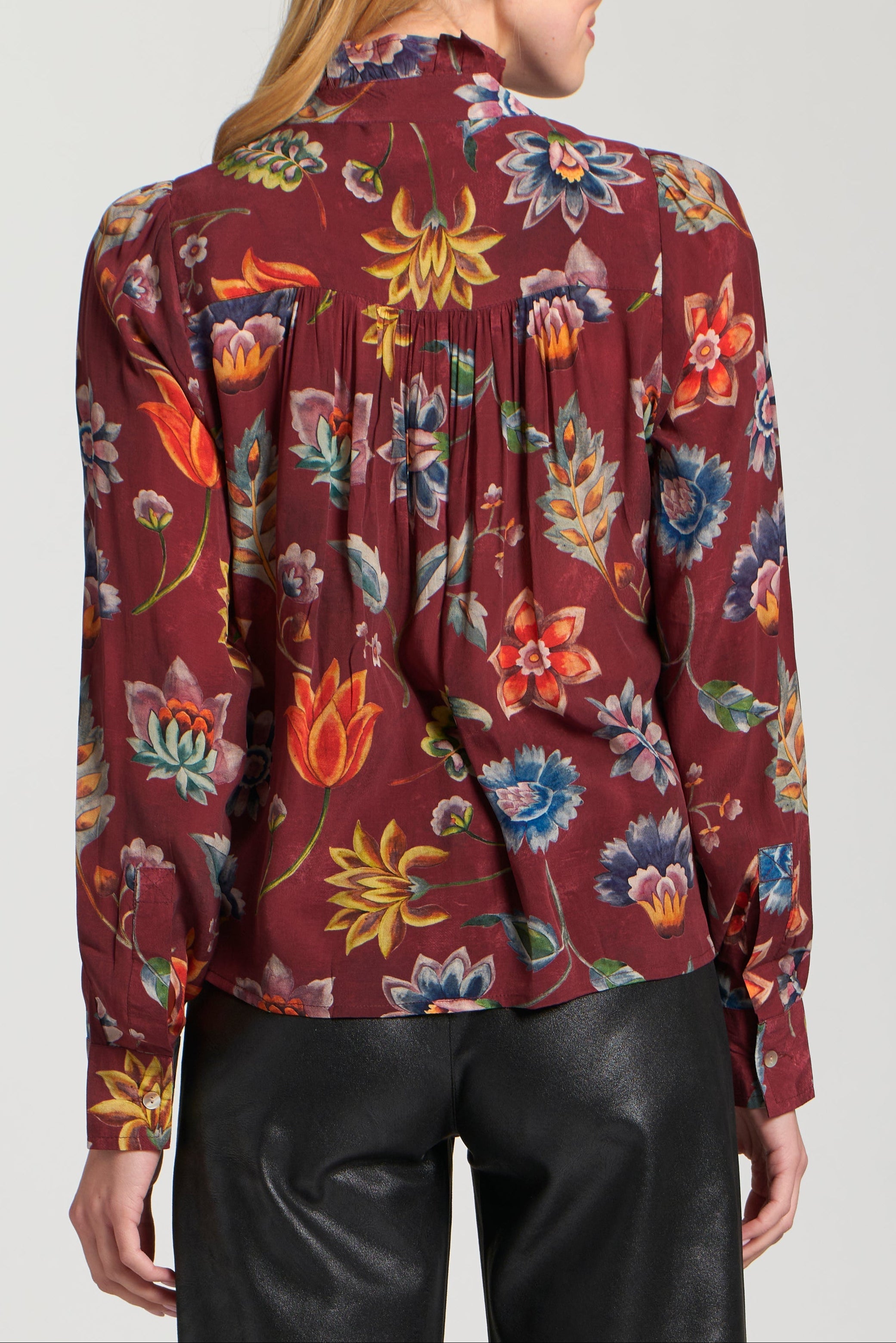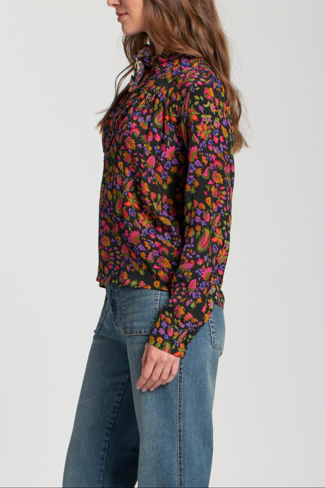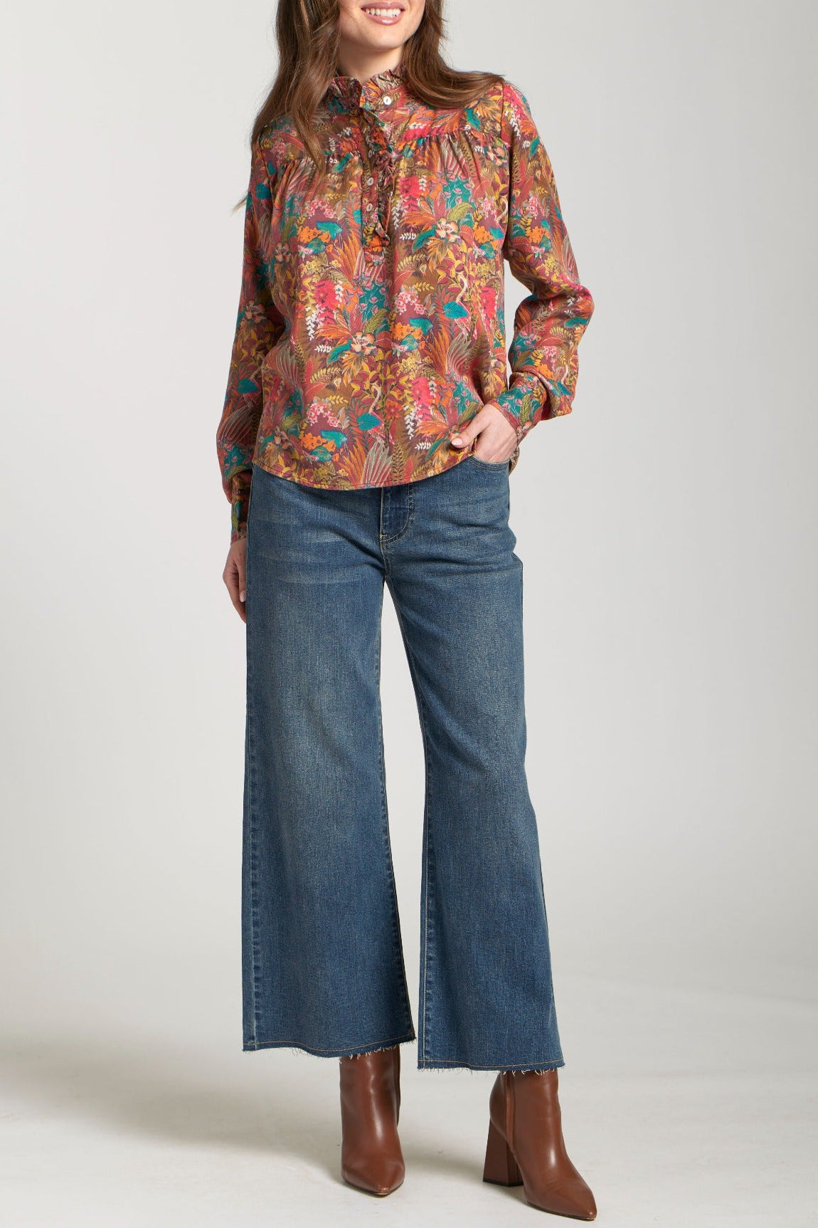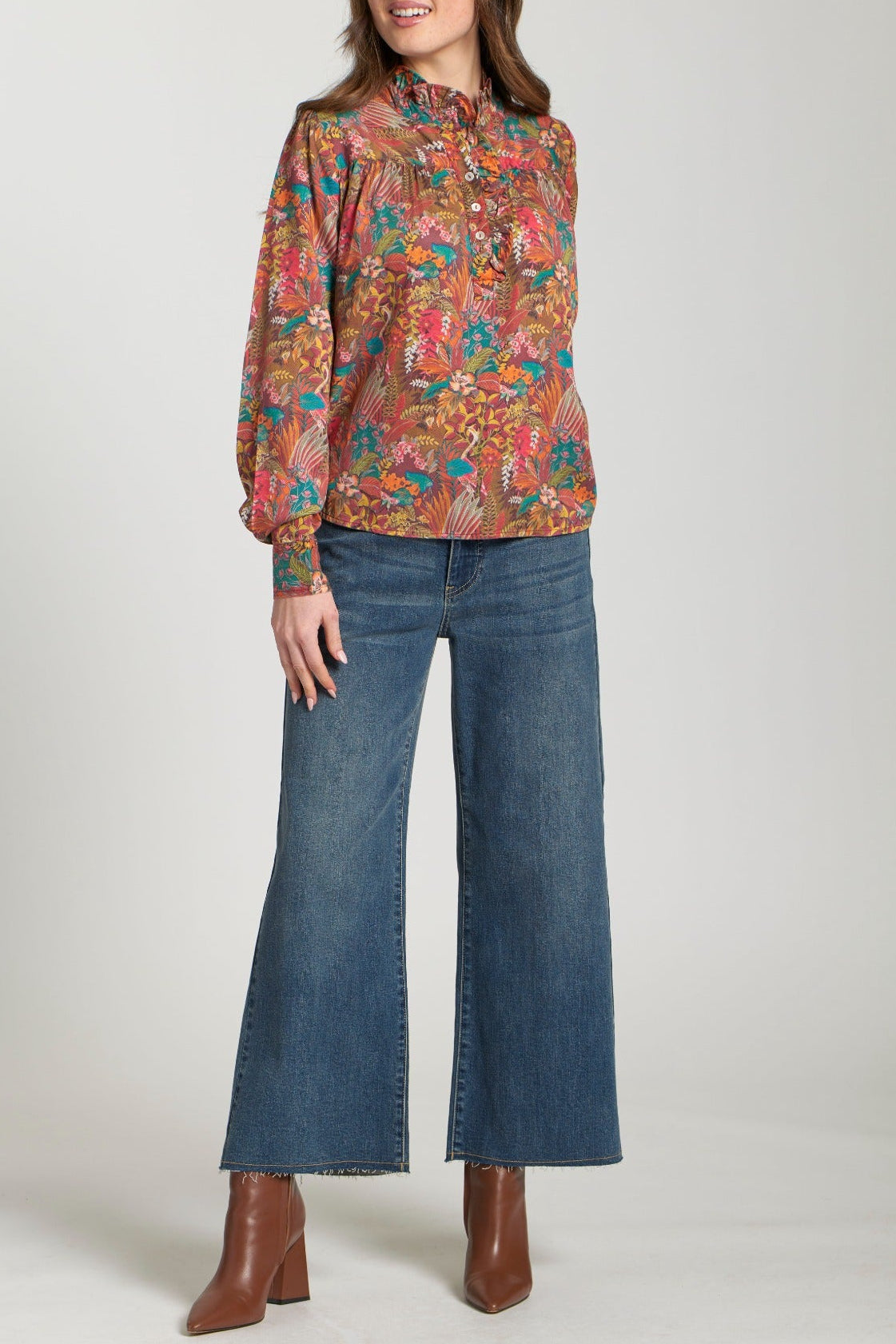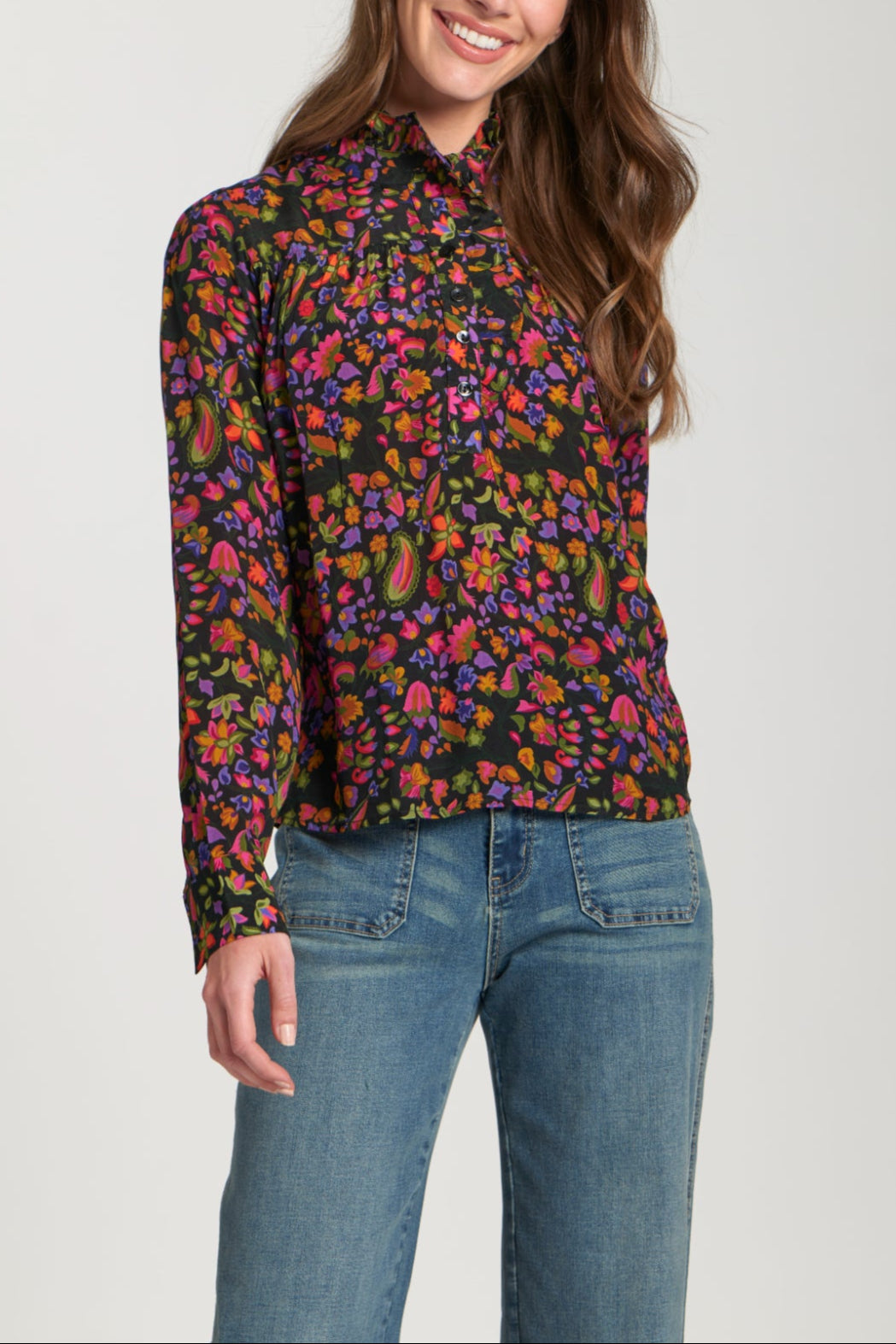 Add a touch of charm and color to your wardrobe with our Ruffle Half Placket Blouse. Featuring a vibrant all-over floral print, this blouse is designed to brighten up any outfit. The ruffled stand collar and half button placket add a feminine, elevated detail, while the long sleeves with buttoned cuffs offer a polished finish.