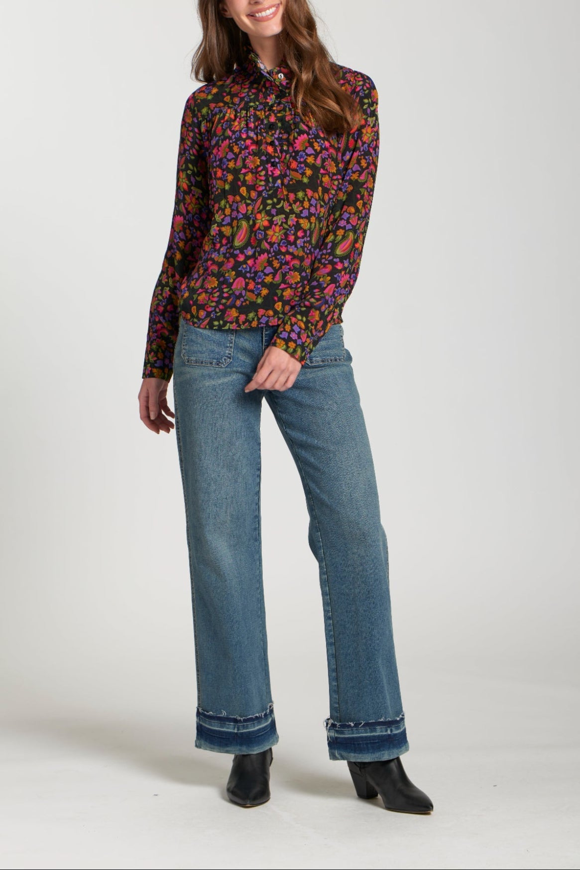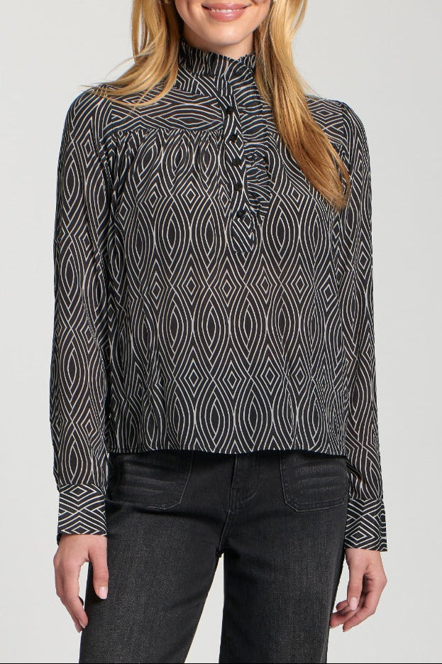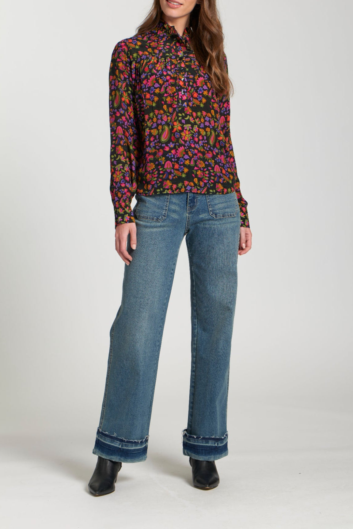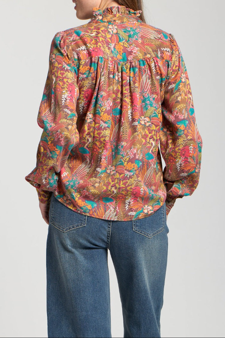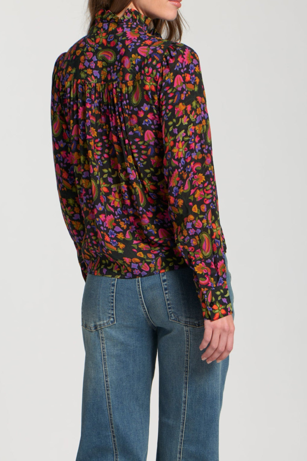 Add a touch of charm and color to your wardrobe with our Ruffle Half Placket Blouse. Featuring a vibrant all-over floral print, this blouse is designed to brighten up any outfit. The ruffled stand collar and half button placket add a feminine, elevated detail, while the long sleeves with buttoned cuffs offer a polished finish.