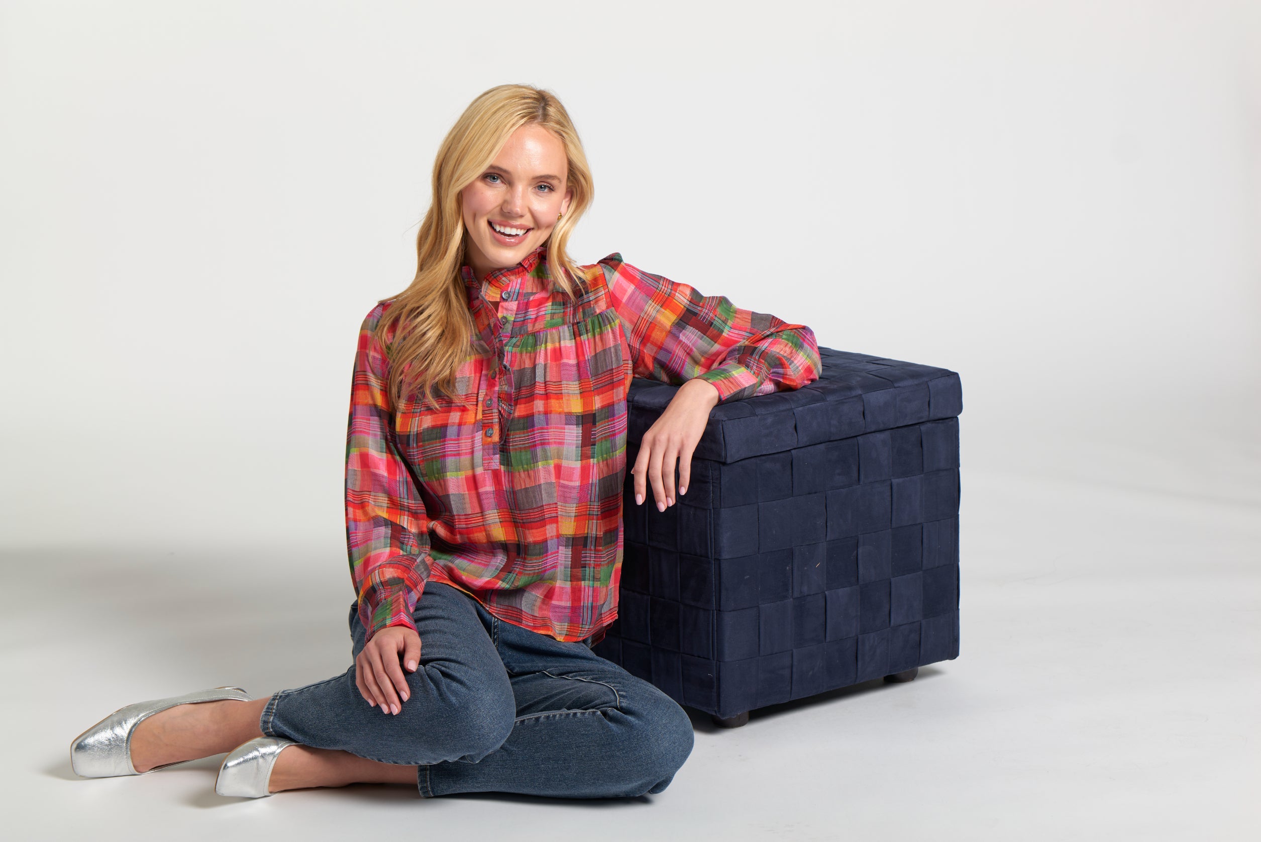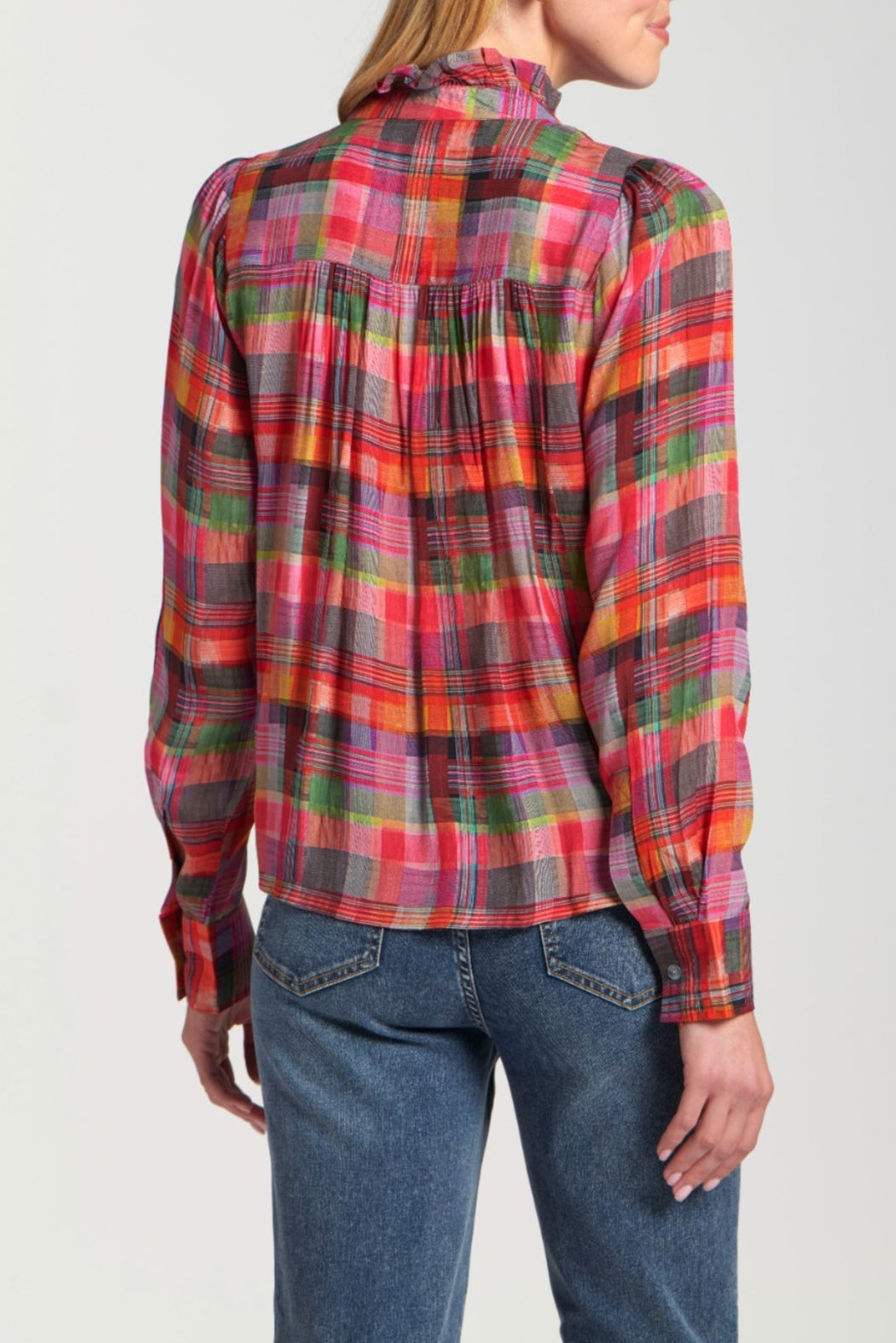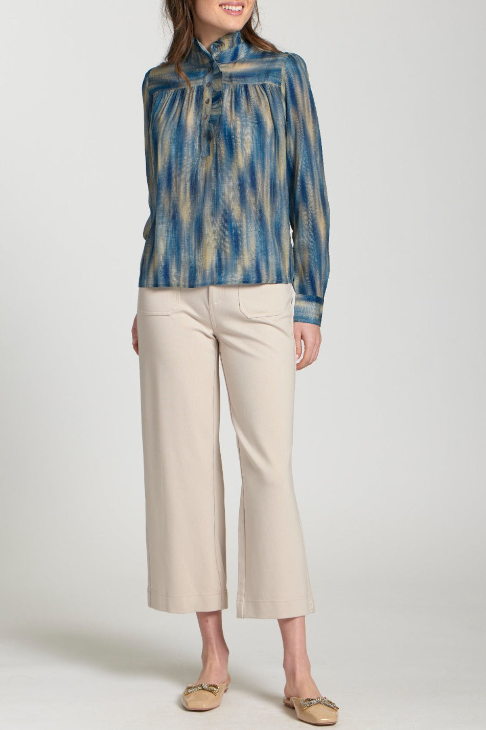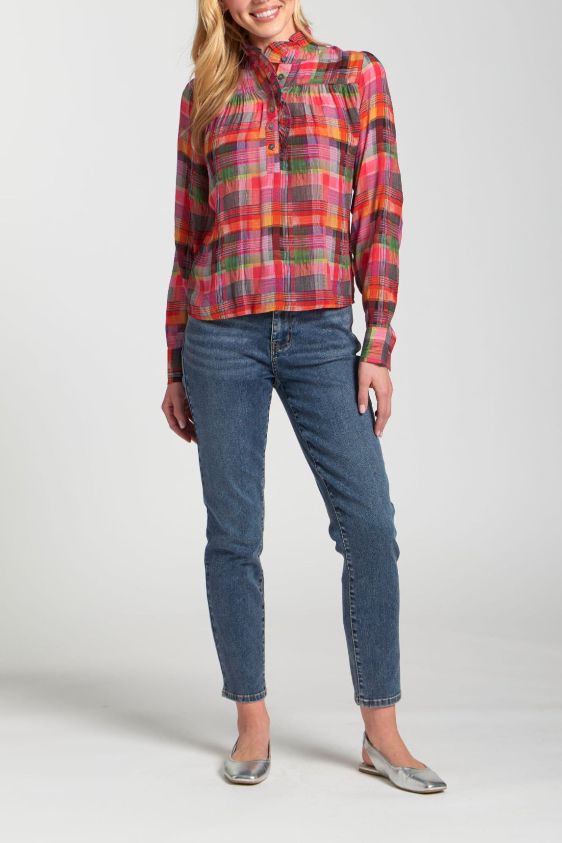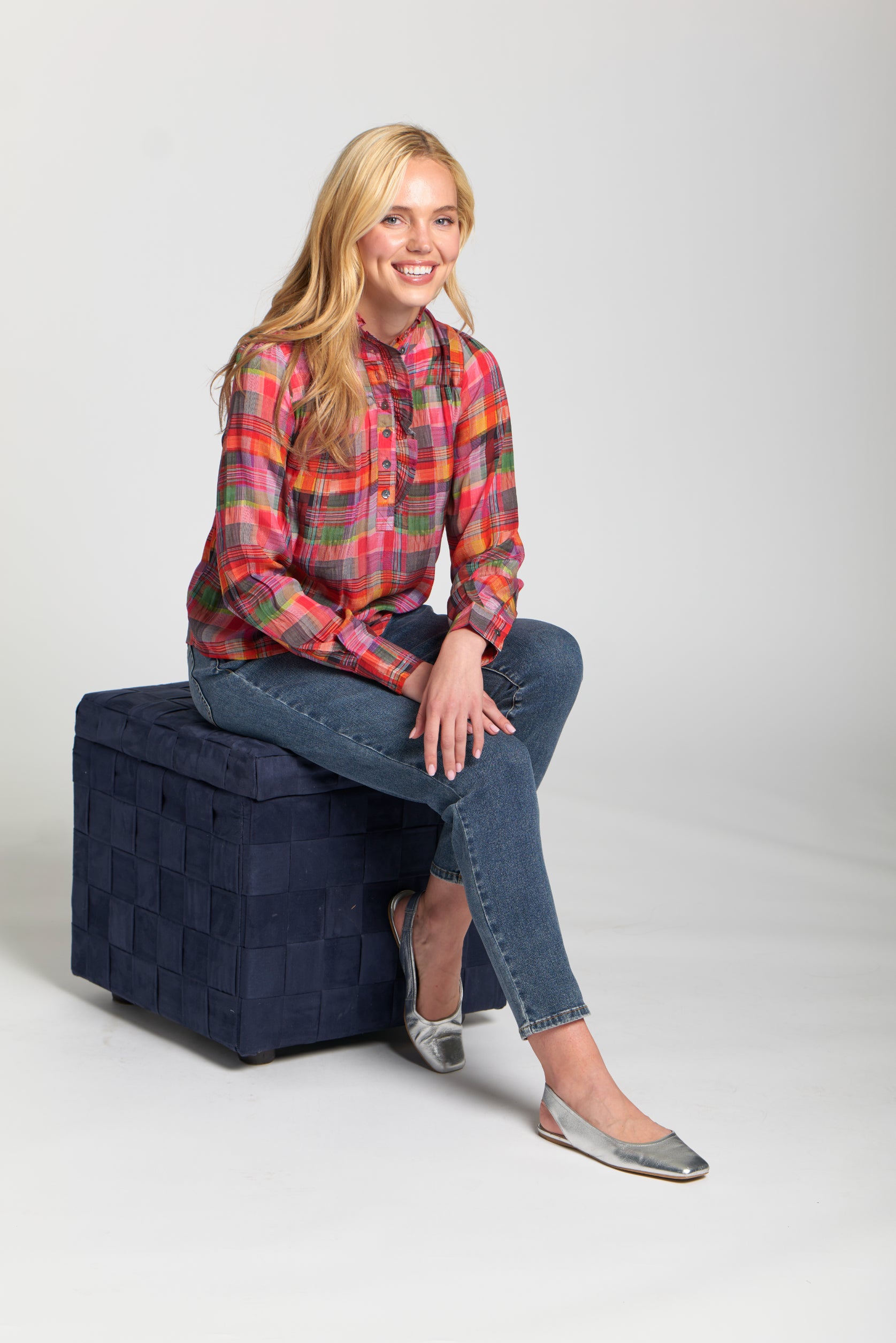 Add a touch of charm and color to your wardrobe with our Ruffle Half Placket Blouse. Featuring a vibrant all-over floral print, this blouse is designed to brighten up any outfit. The ruffled stand collar and half button placket add a feminine, elevated detail, while the long sleeves with buttoned cuffs offer a polished finish.