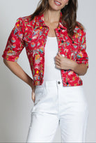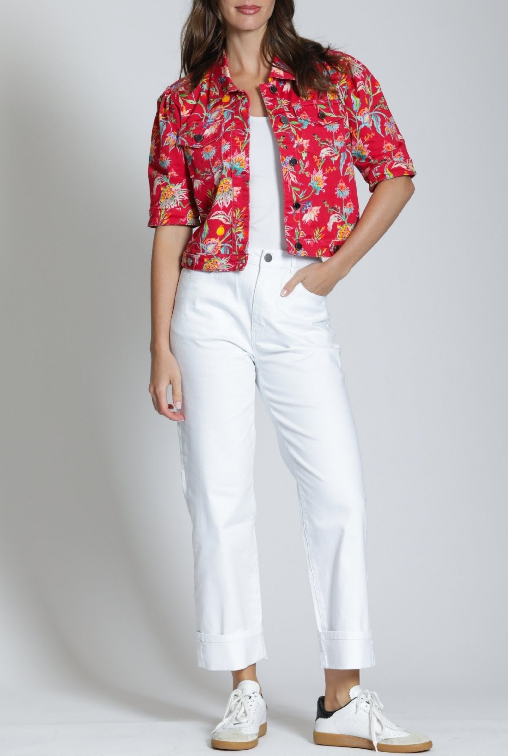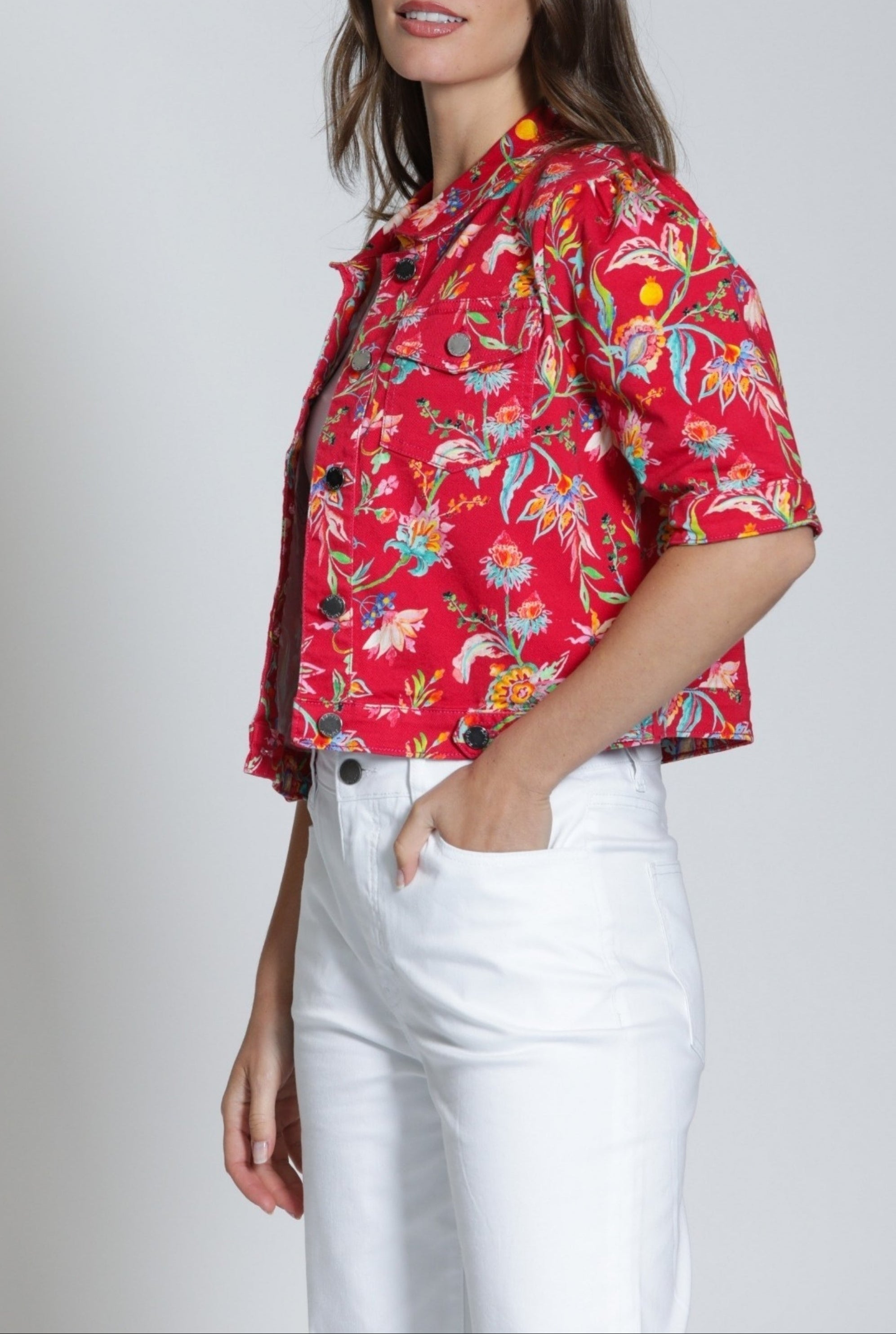 This stylish, cropped jacket, crafted from a comfortable woven fabric with a structure reminiscent of denim, offers a modern take on the classic jean jacket silhouette; the design features a traditional pointed collar, a full button-front closure, and distinct short sleeves that have a gentle puff or roll, creating a feminine volume, making it an excellent statement layering piece to pair with jeans or coordinating bottoms.
