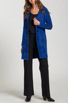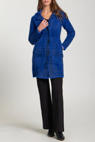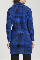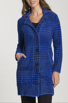 Make a bold statement this season with the Plush Houndstooth Cozy Coat, a striking blend of warmth and sophisticated pattern. This single-breasted, knee-length coat features a vivid sapphire blue and black houndstooth print in a soft, fuzzy texture for ultimate comfort. Designed with a tailored notched lapel, front button closures, and functional pockets, this cozy jacket effortlessly layers over both casual and dressy outfits, instantly elevating your cold-weather style with its eye-catching color and classic print.